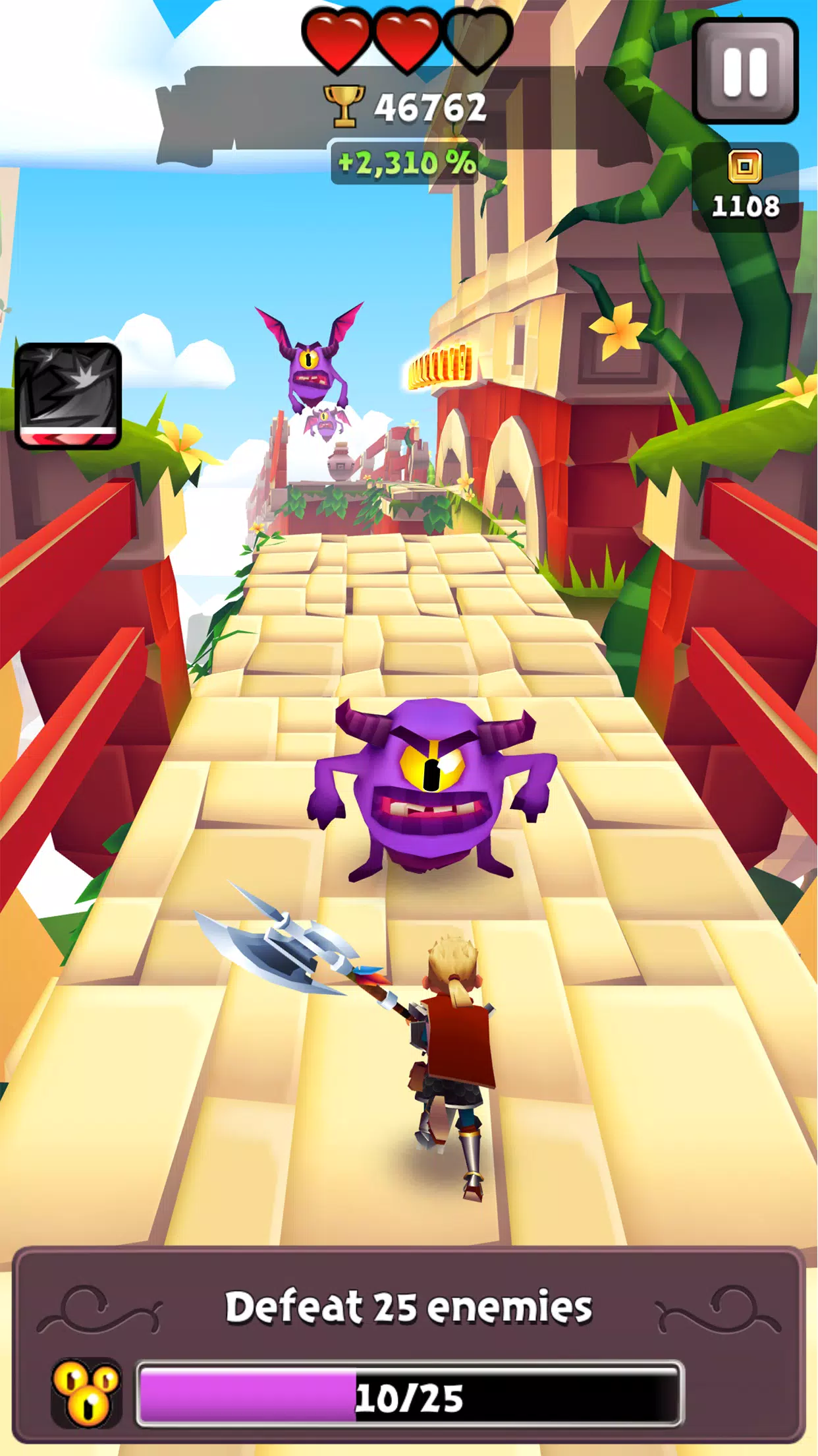 一路奔跑、跳跃、勇猛斩杀的庞大的暴徒大军,同时收集宝藏和金币,来升级你的史诗级的角色和魔剑。