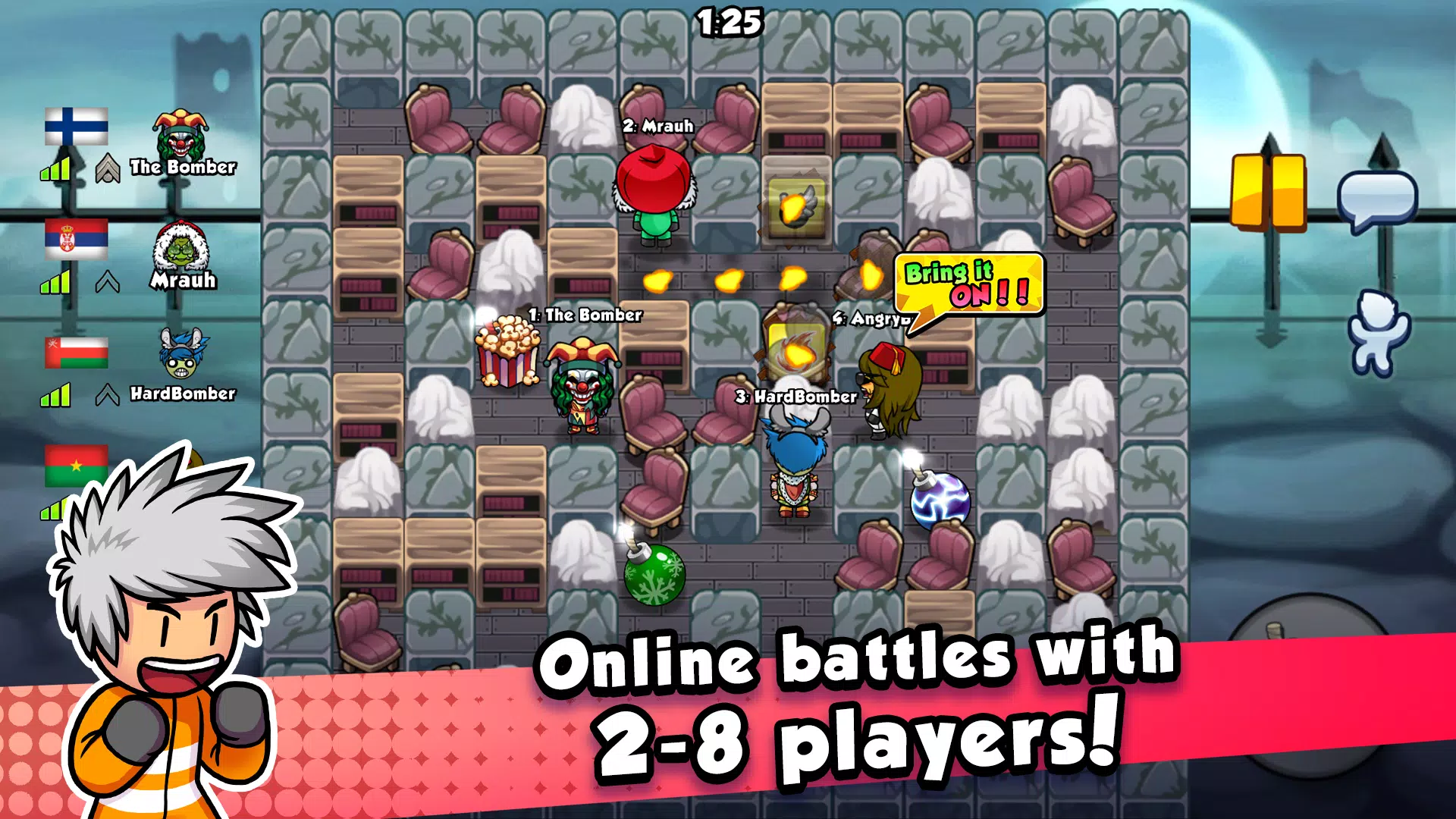 放置炸弹并躲在角落后面。砰!你炸了对手还是他们逃脱了?再试一次!从地图上收集道具以获得更强大的炸弹!当心邪恶的诅咒!