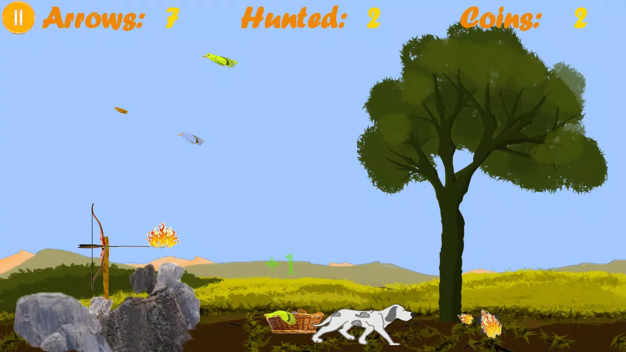 射箭鸟猎人由几个等级组成,射箭鸟猎人一级是树和狗的地方,鸟儿坐在树上,当你狩猎鸟类的狗时,在篮子里搜集猎鸟。
