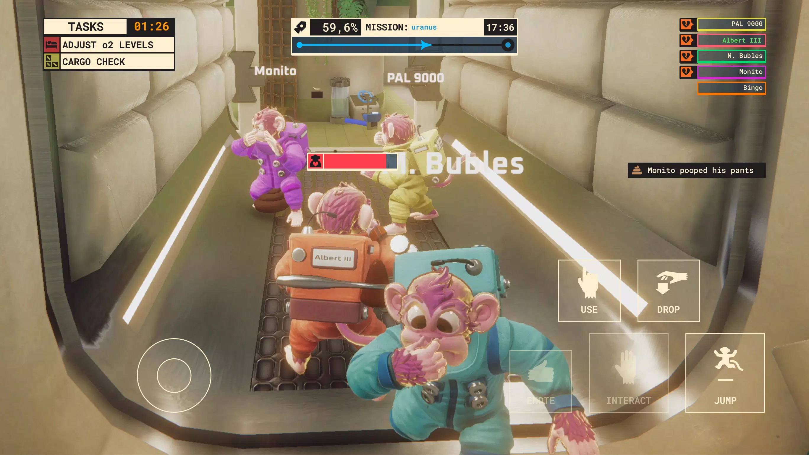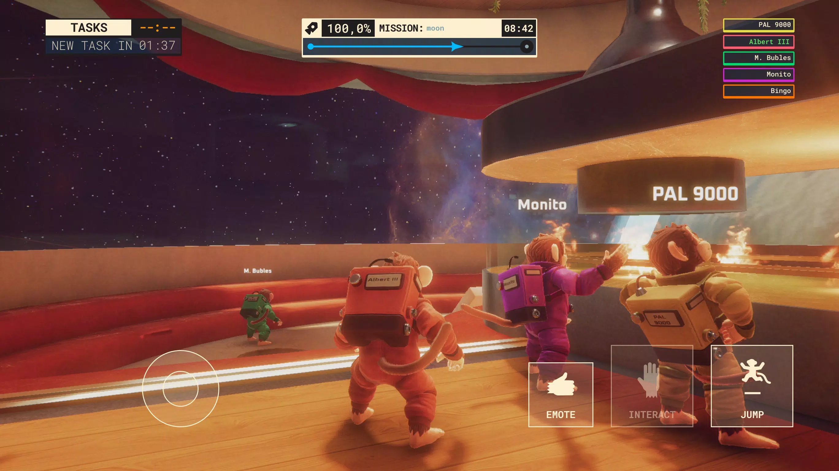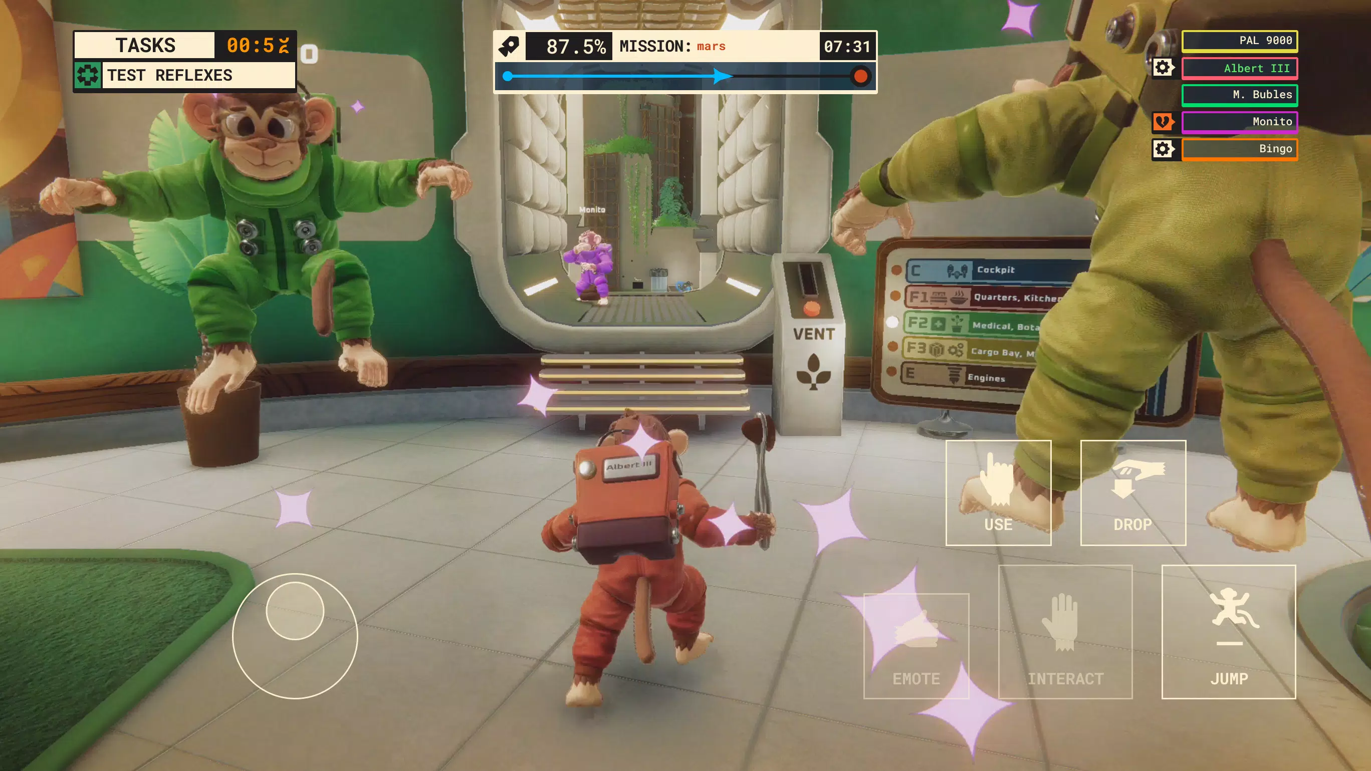 《太空猴子号》是一款支持 1–8 人合作的超欢乐多人动作游戏。与勇敢又调皮的太空猴子一起执行任务、处理各种突发状况、升级飞船舱室,在混乱与欢笑中冲向群星。协力共进,否则一起翻船!