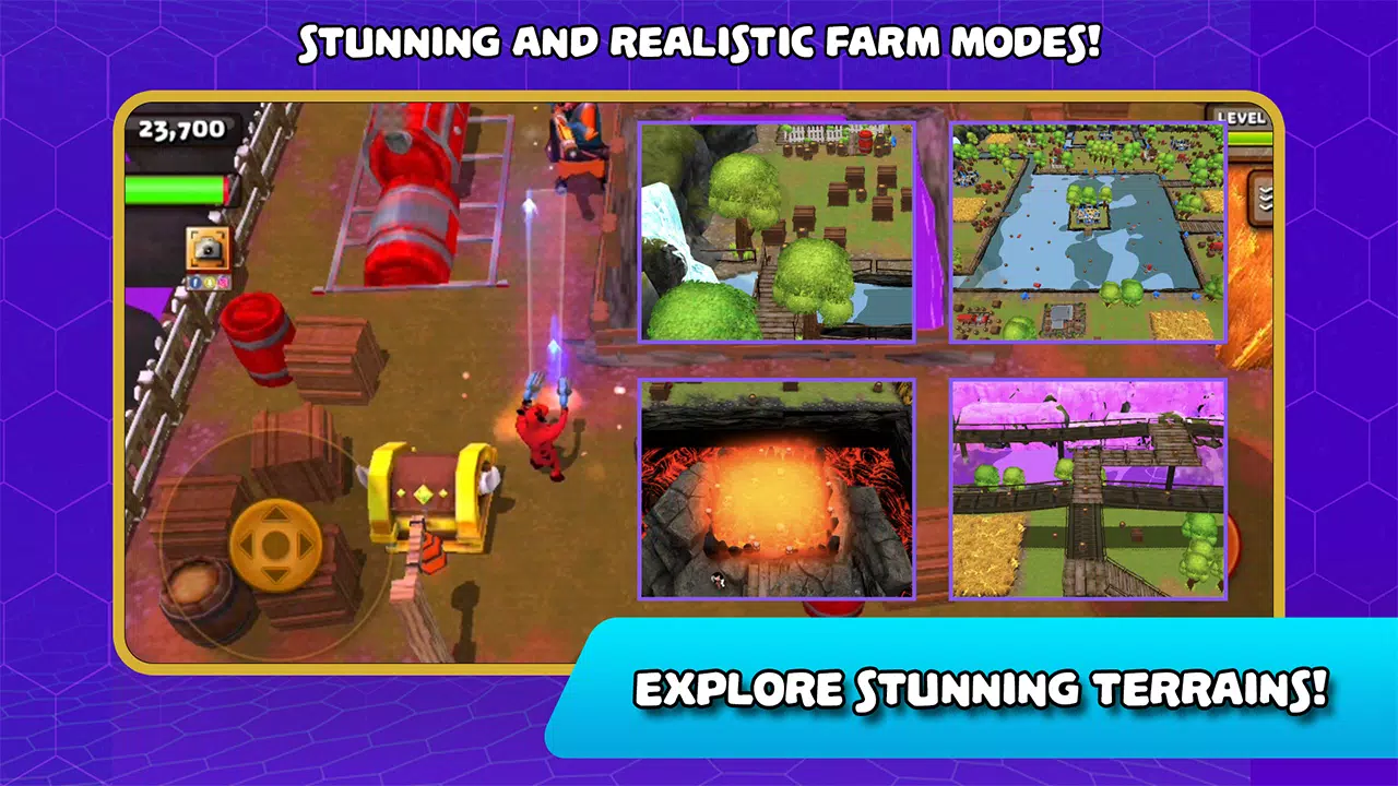 – 探索农场景观,包括河流、房屋、拖拉机、树木和围栏。