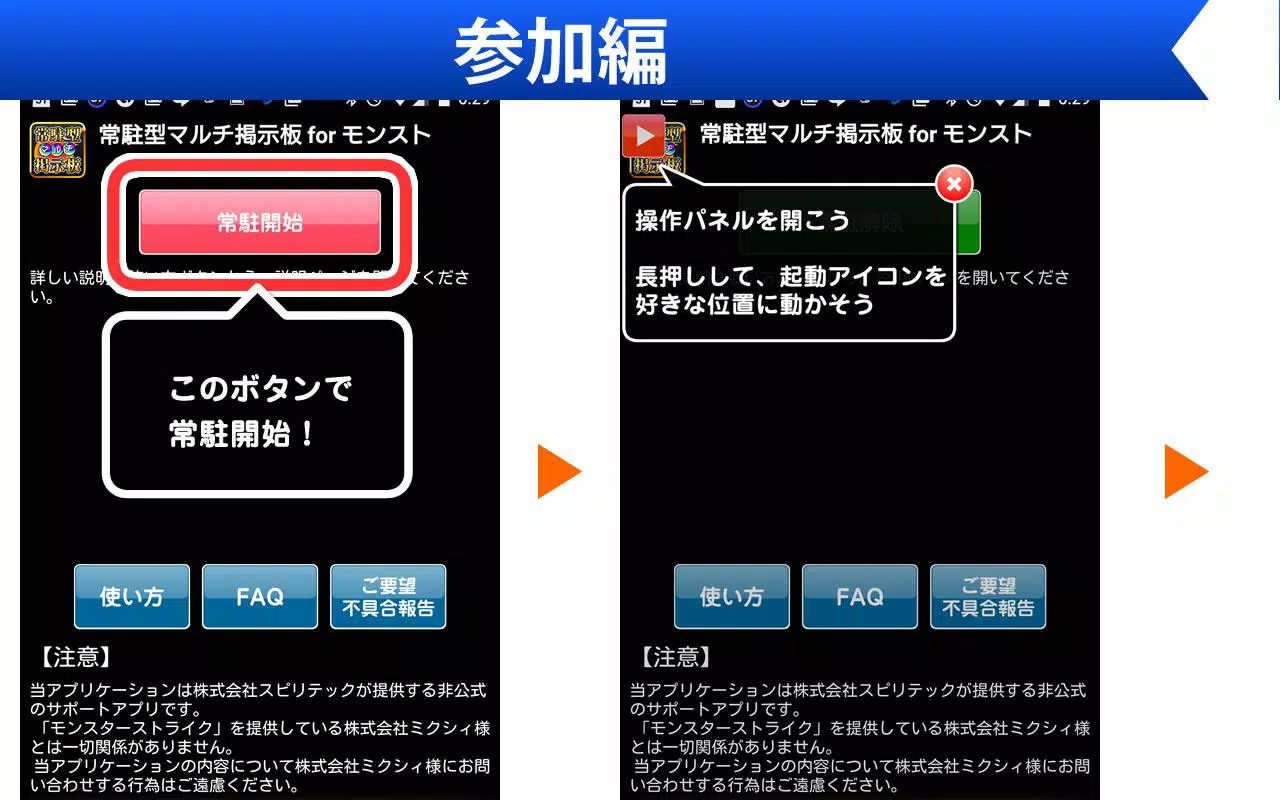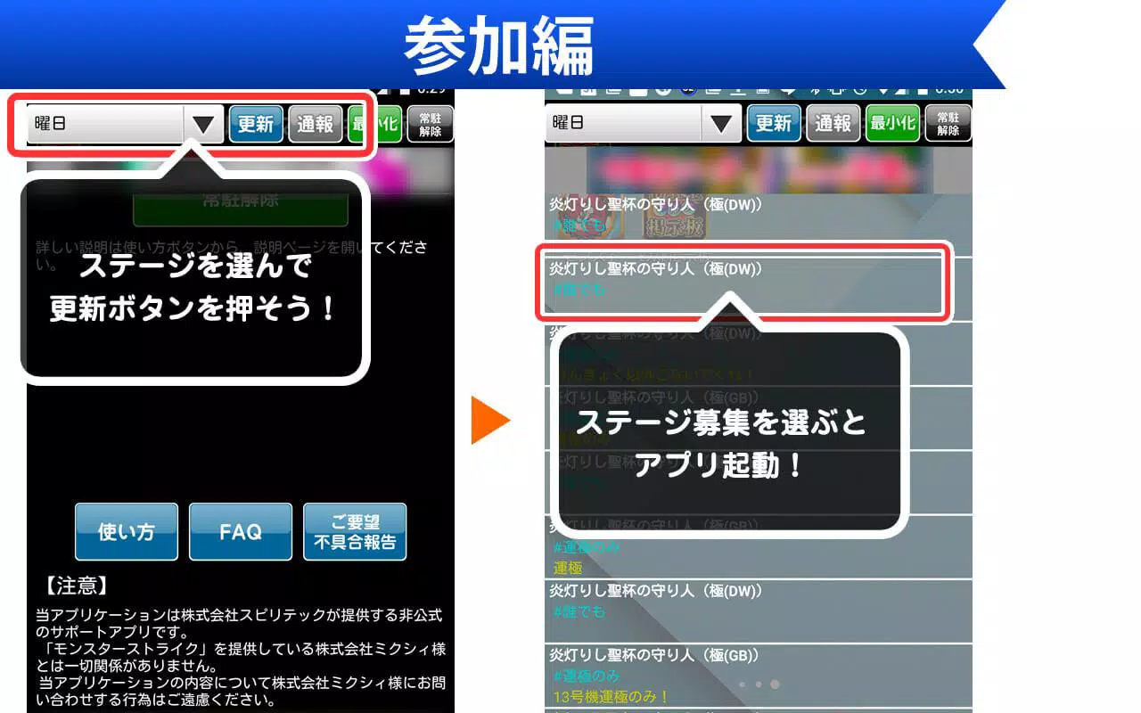 这是一个执行多种匹配的非官方支持应用程序,您可以在其中直接从怪兽游戏屏幕中进行招募/参与。这个程序与Mixi无关。