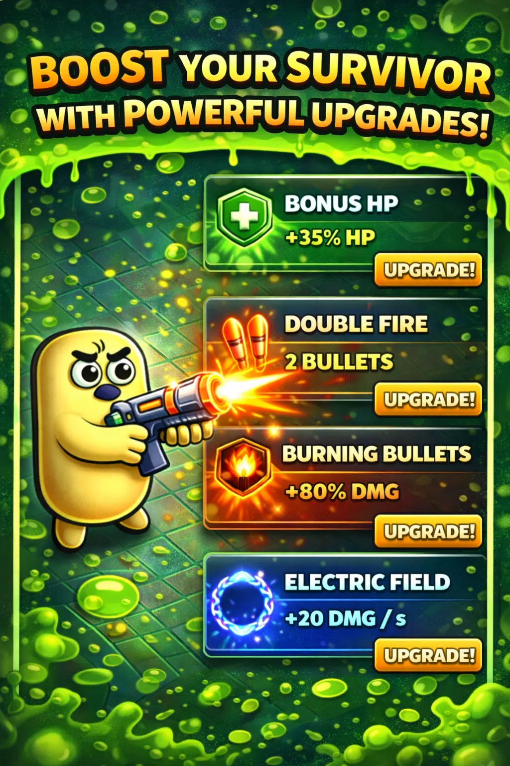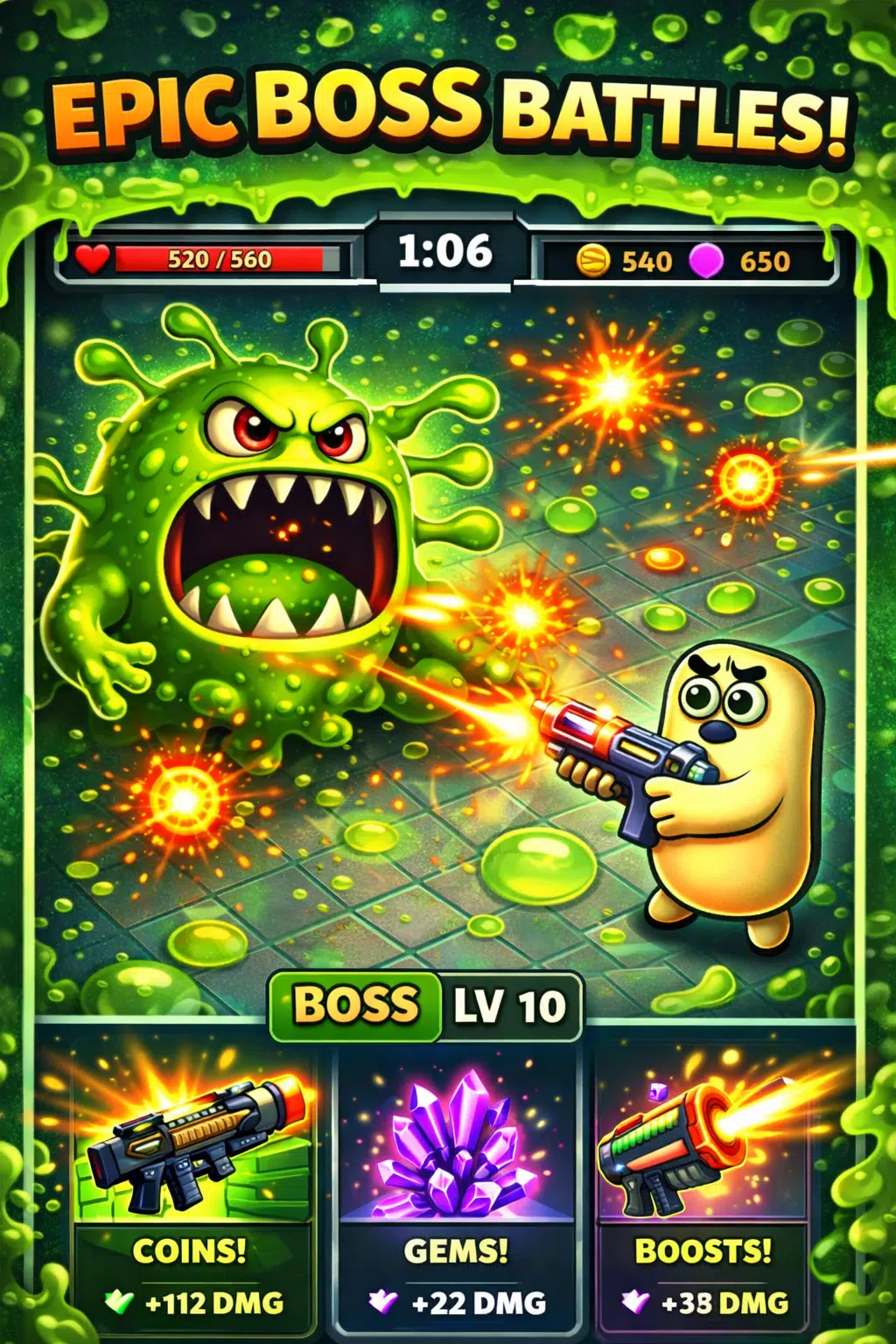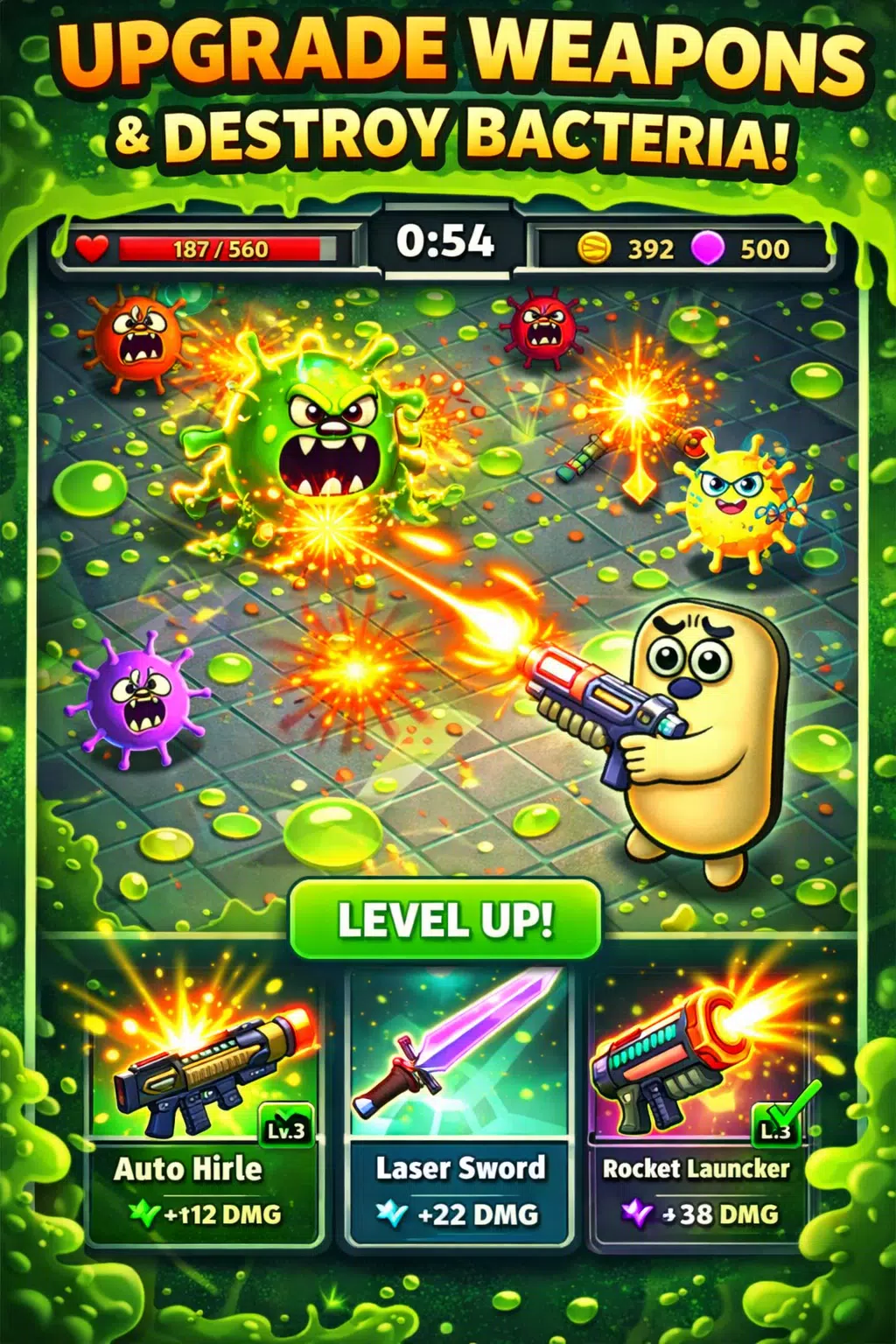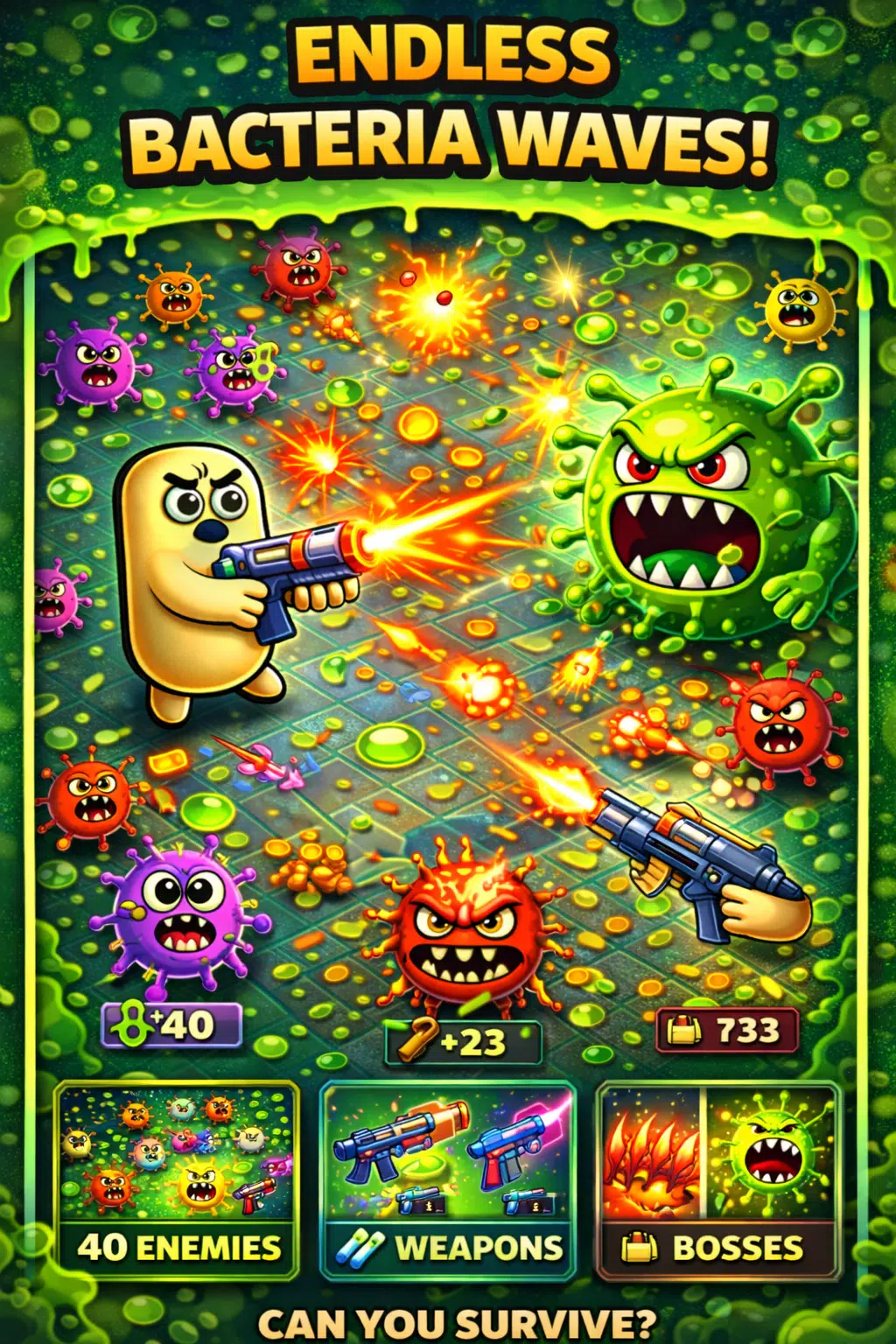 欢迎来到《细菌战场》,这是一款紧张刺激的生存射击游戏,致命的细菌、病毒和变异微生物已经占领了战场。你的任务很简单:在无尽的敌人浪潮中生存下来,升级强大的武器,并击败强大的首领。