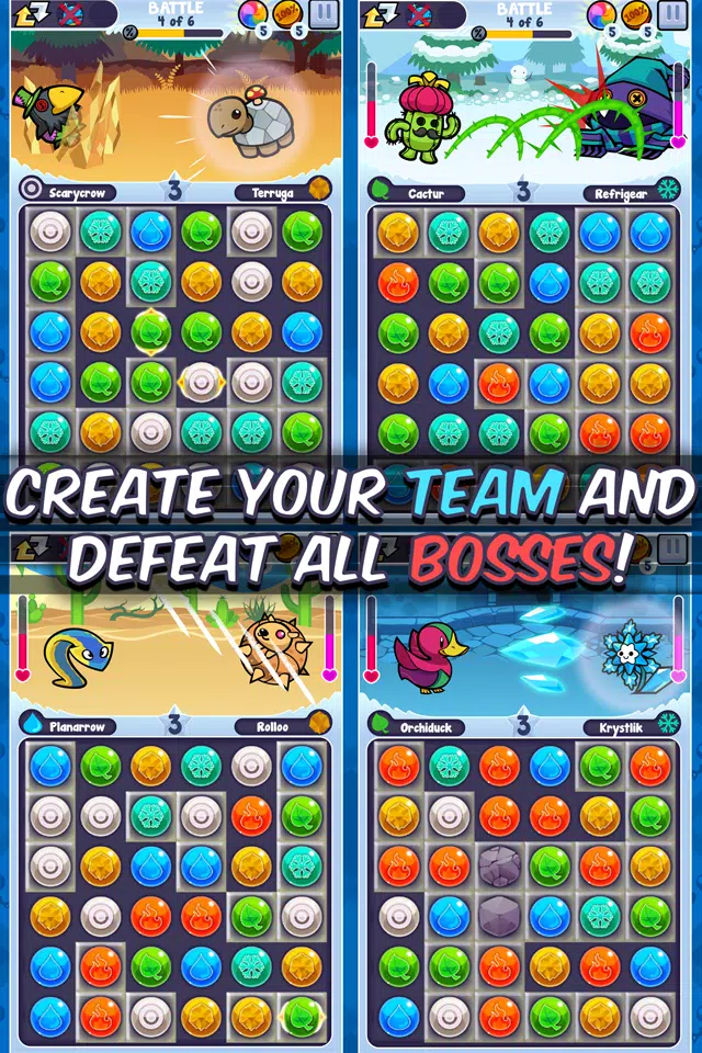 在《Pico Pets Puzzle》中组建你的怪物队伍,开拓新领域,一路奋战,成为史上最伟大的怪物驯服师。运用策略滑动并匹配宝石,与敌人战斗,带领你的队伍走向胜利!