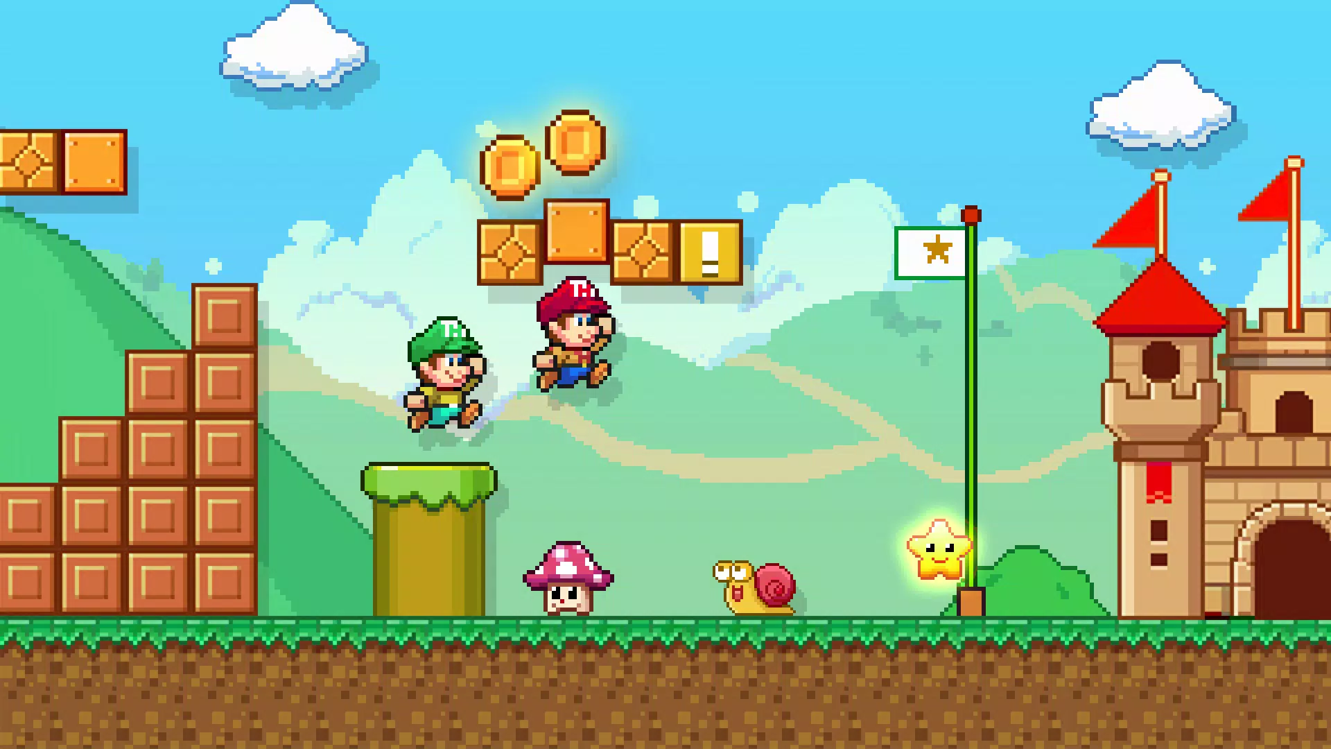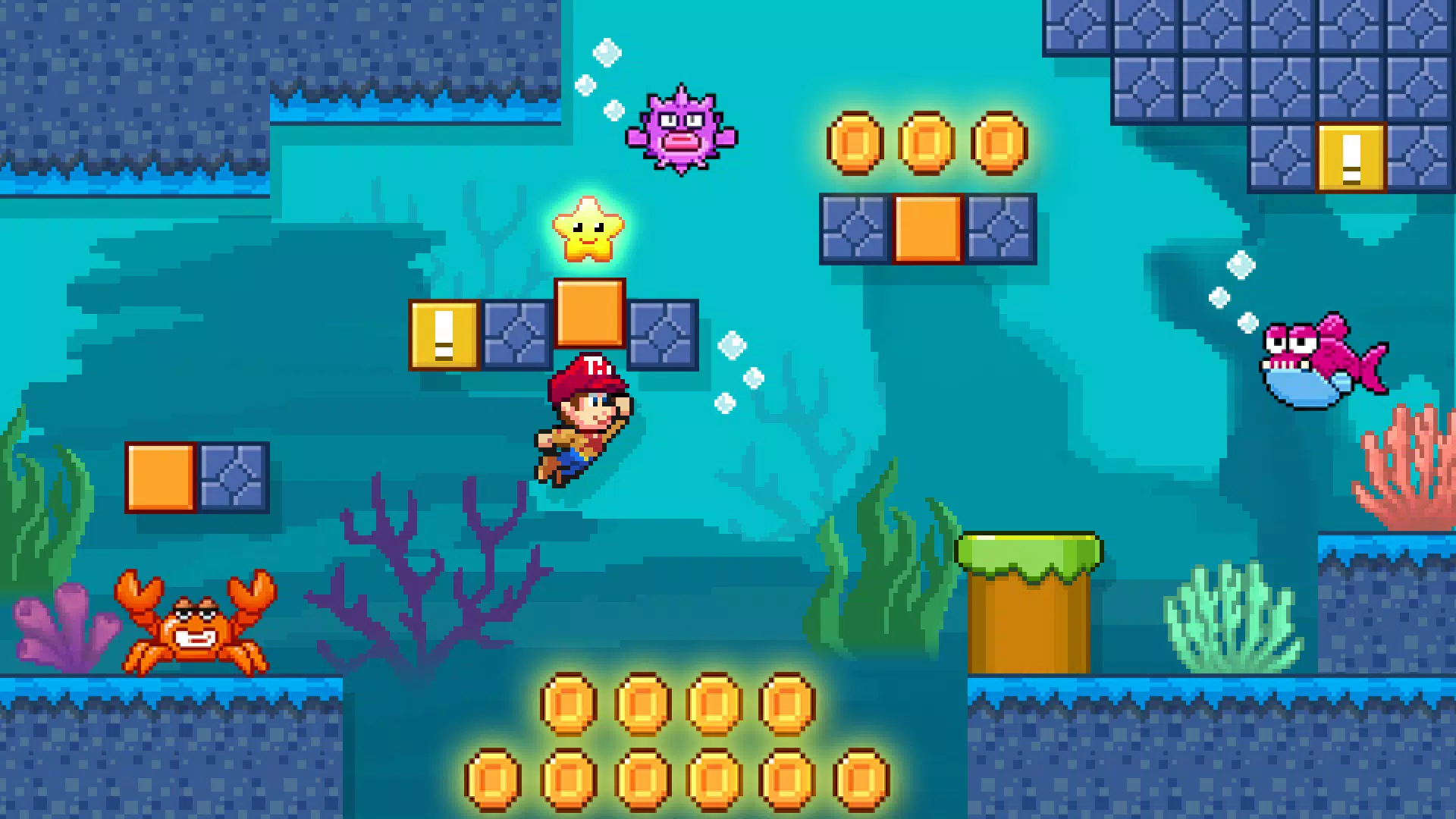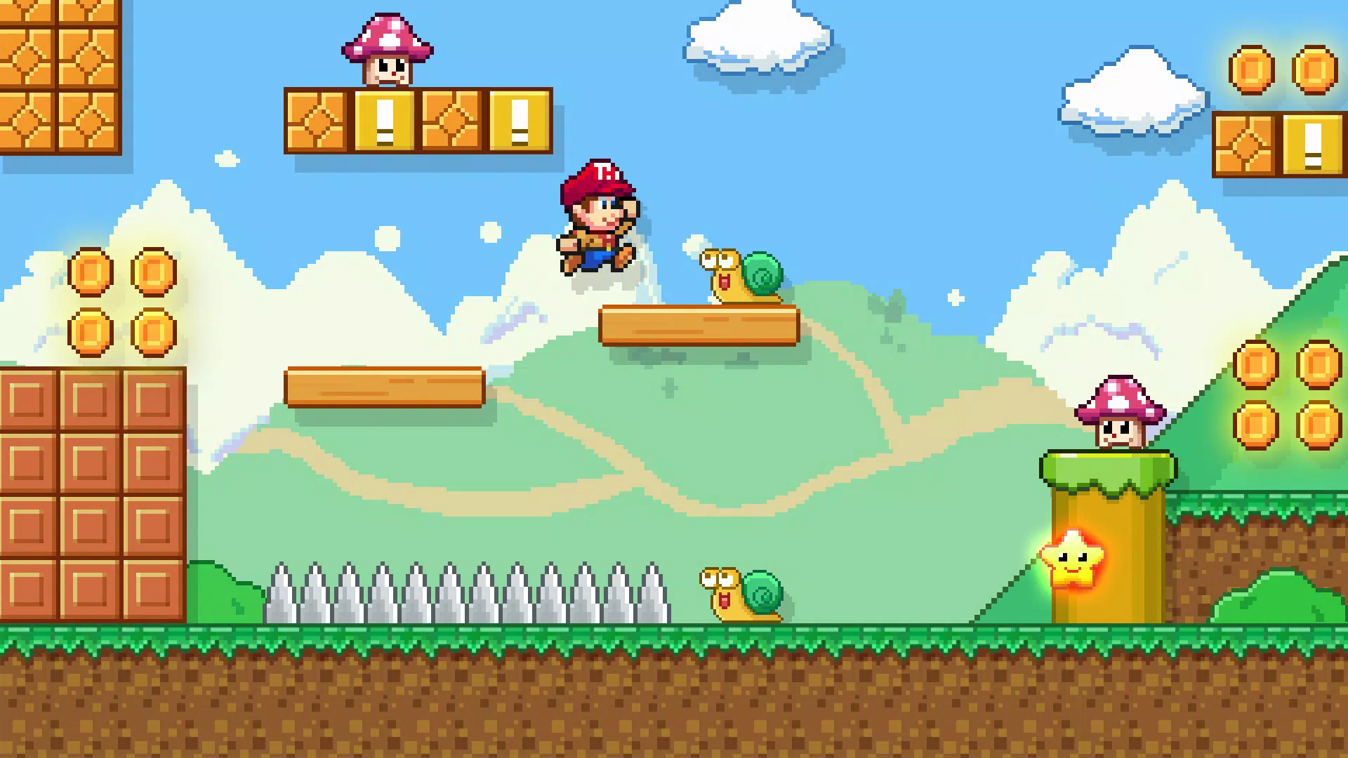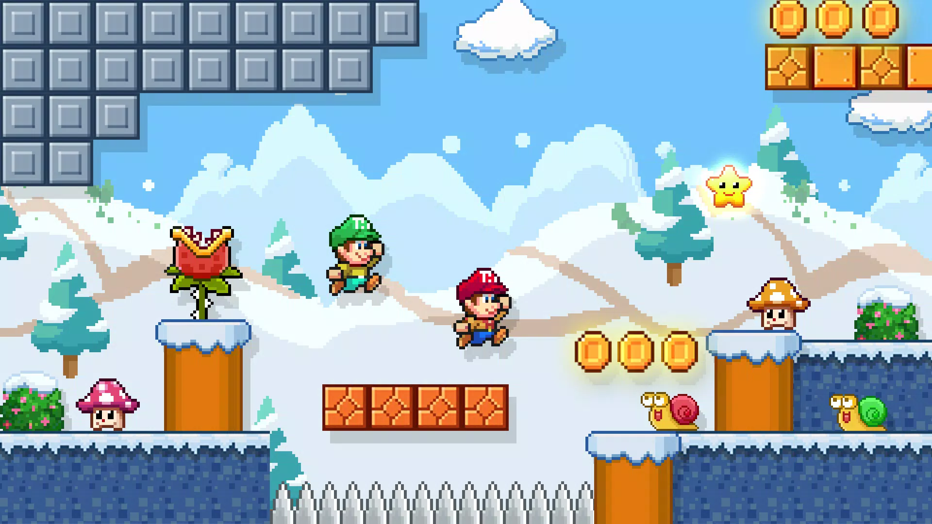 《超级罗比兄弟:跳跃世界》是一款激动人心的 2D 像素风格平台游戏,将带你踏上史诗般的冒险之旅。在游戏中,你将扮演勇敢的英雄罗比,拯救他的王国,使其免遭邪恶势力的侵扰。
