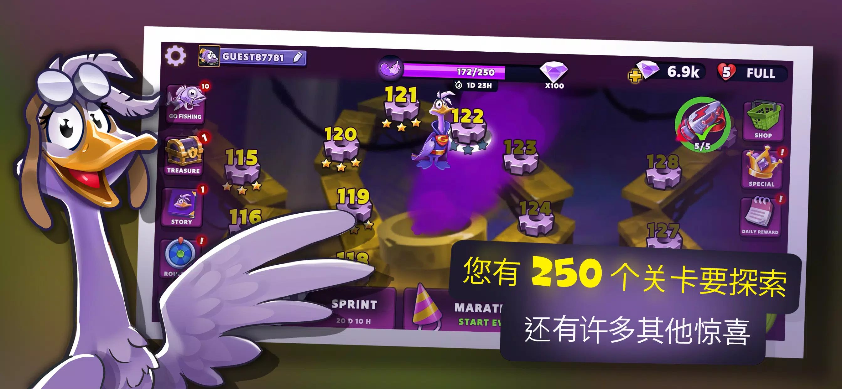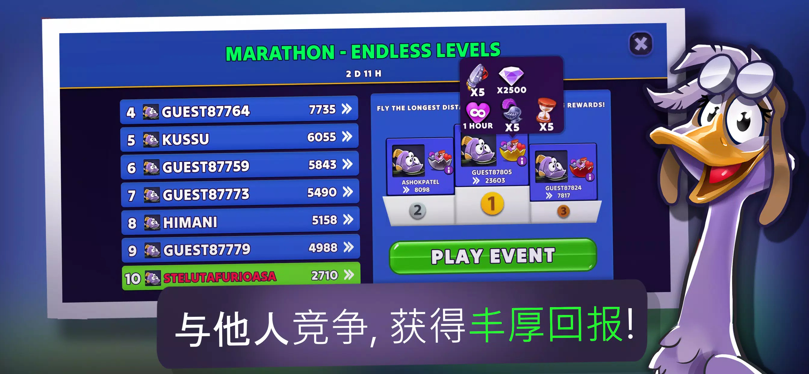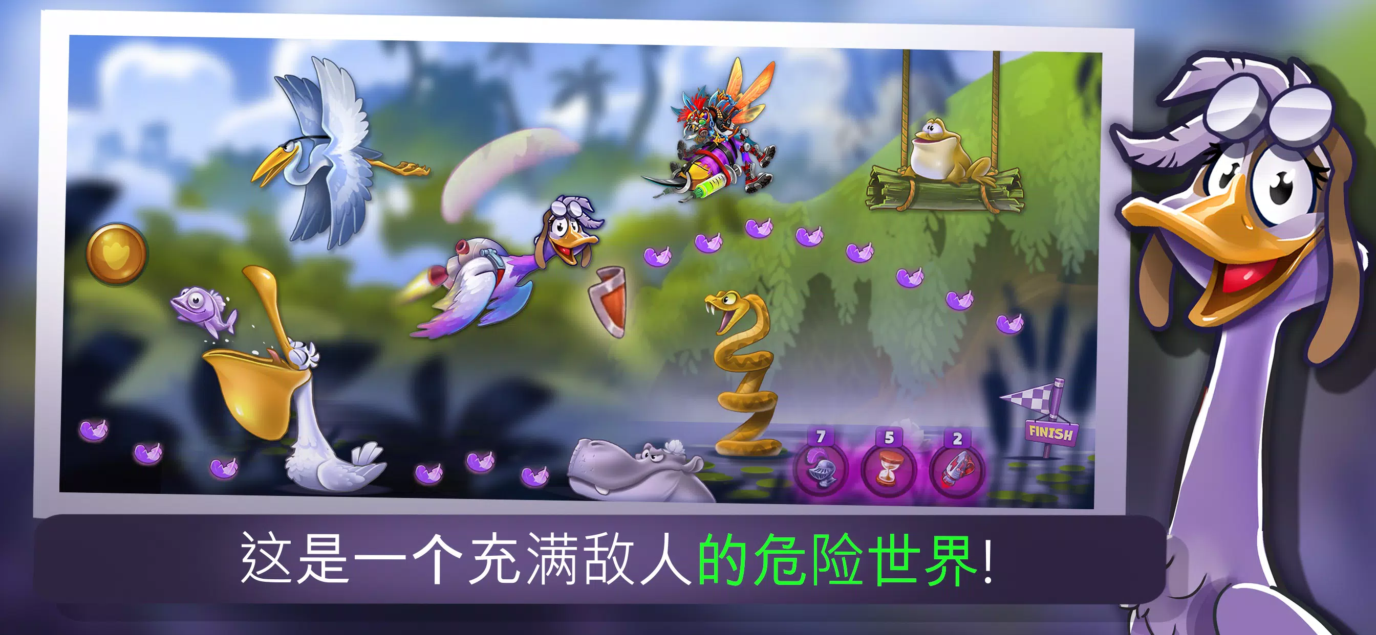 也 , 似 跑酷游戏 , ” 荒野 鹅 ” ( Wild Goose ) 提供无尽的兴奋 和 乐趣 . 开锁 新 关卡 , 收集 羽毛 , 宝石 和 钻石 💎 和 得到 武器 ( 磁铁 🧲 , 🛡️ 盔甲 和 花 炸弹 💣 ) . 有 乐趣 与你 朋友们 在这个 跑酷游戏 !