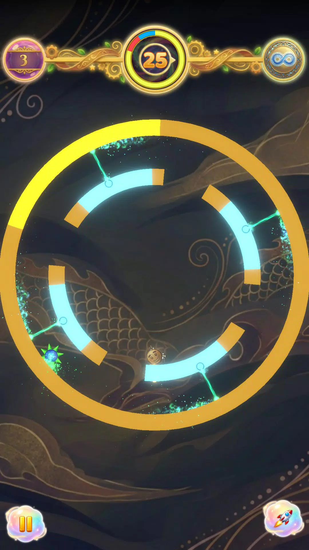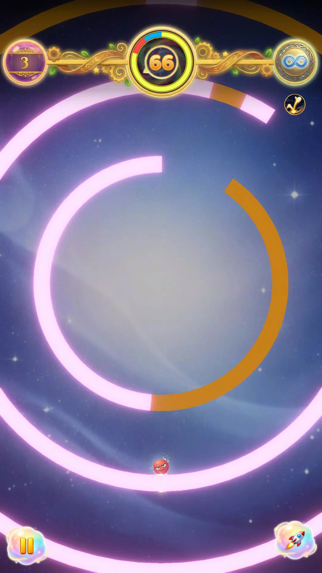 点击屏幕即可在旋转的光环间跳跃,并涂绘你触碰到的部分。每个关卡都有完成百分比要求。达到目标即可通关。