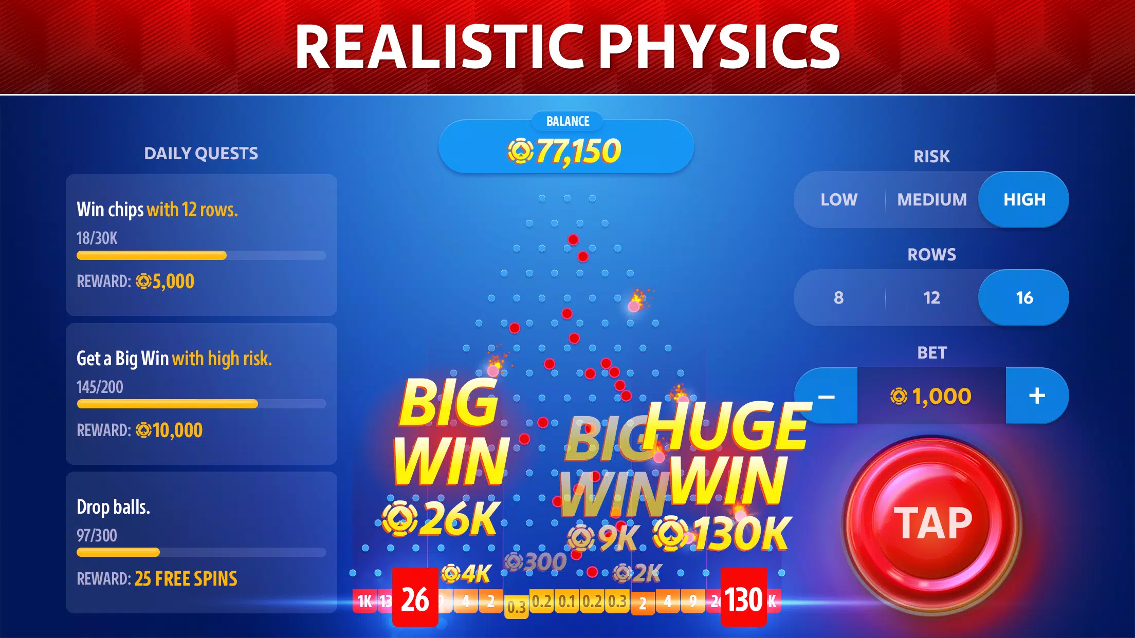 • 沉浸式动画 – 我们的弹珠台弹珠会在越接近最终彩金时改变颜色。我们的游戏经精心设计,复制并改善了高风险弹珠台游戏机的氛围,为您营造出扣人心弦的沉浸式体验。