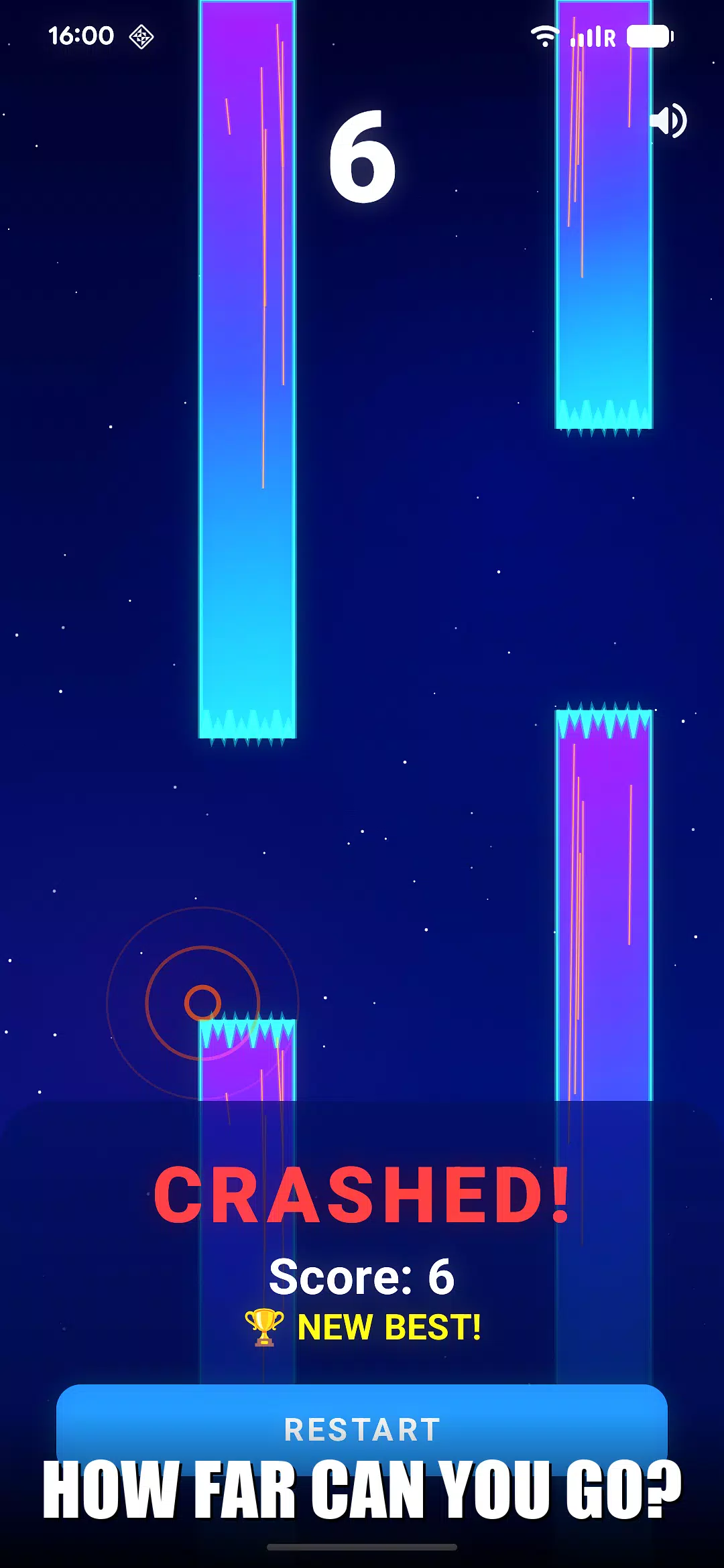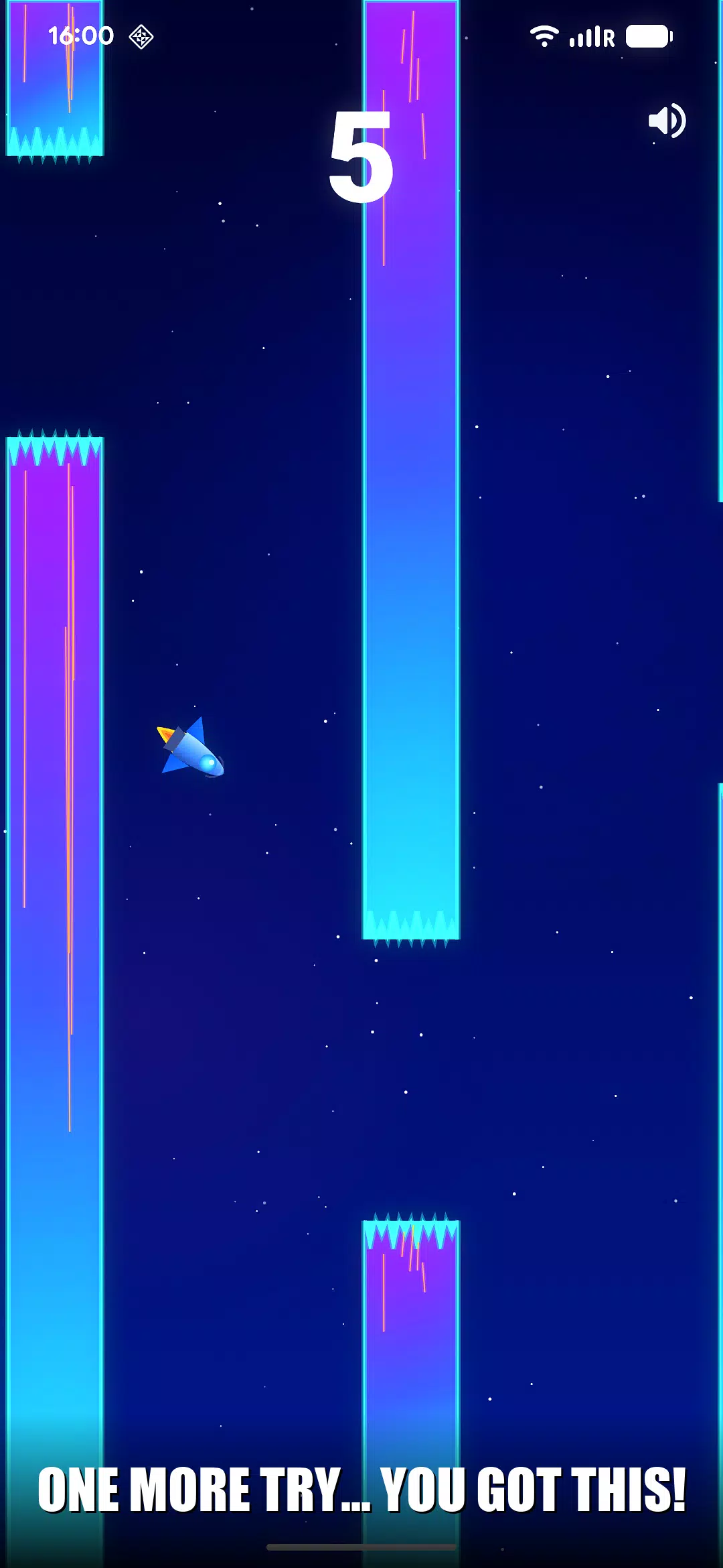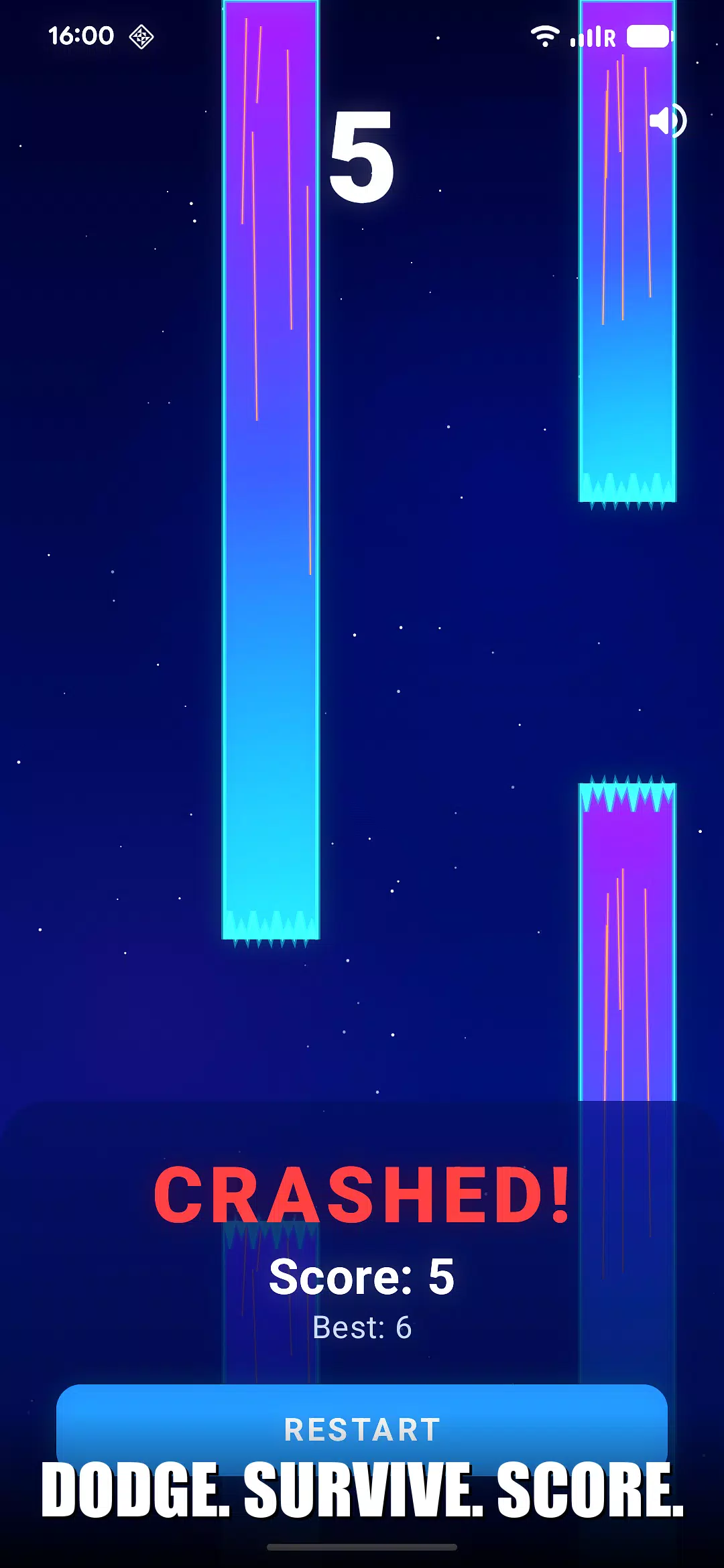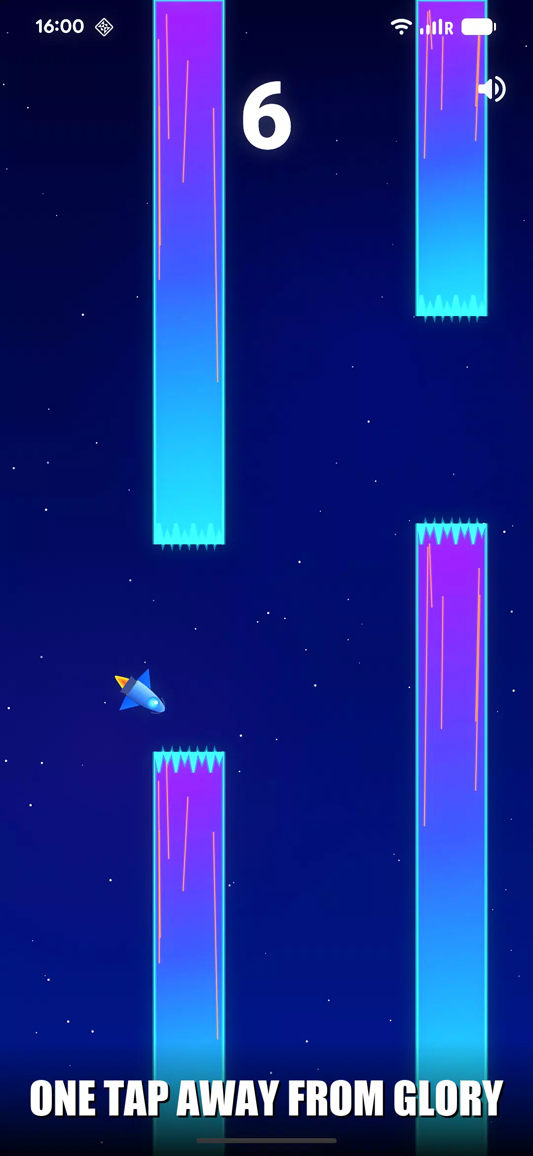 🔊 沉浸式音效设计 — 合成科幻音效:得分时清脆的铃声,每次点击屏幕都能听到火箭推进的音效,坠落时则有震撼的爆炸声。随时可通过屏幕按钮切换音效。