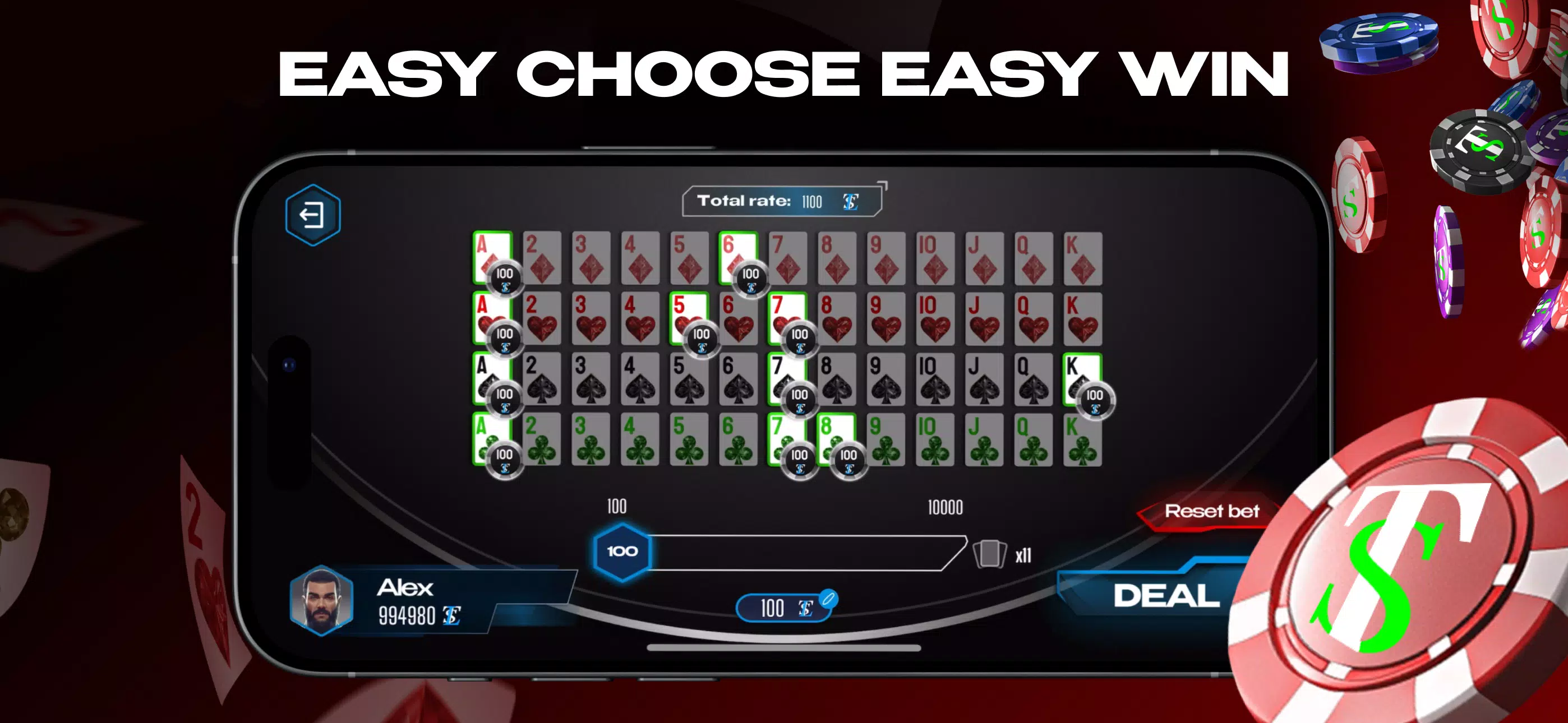 免费筹码。与荷官对战。4 轮,52 张牌。您可以尝试不同的策略、下注大小或您选择的牌数。