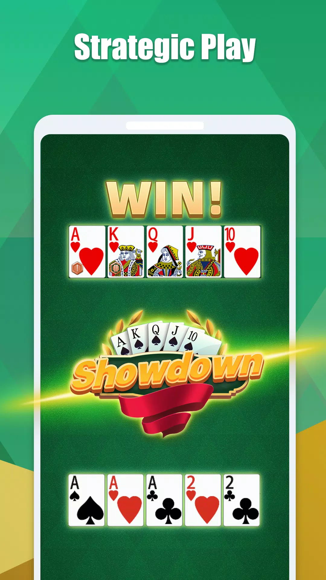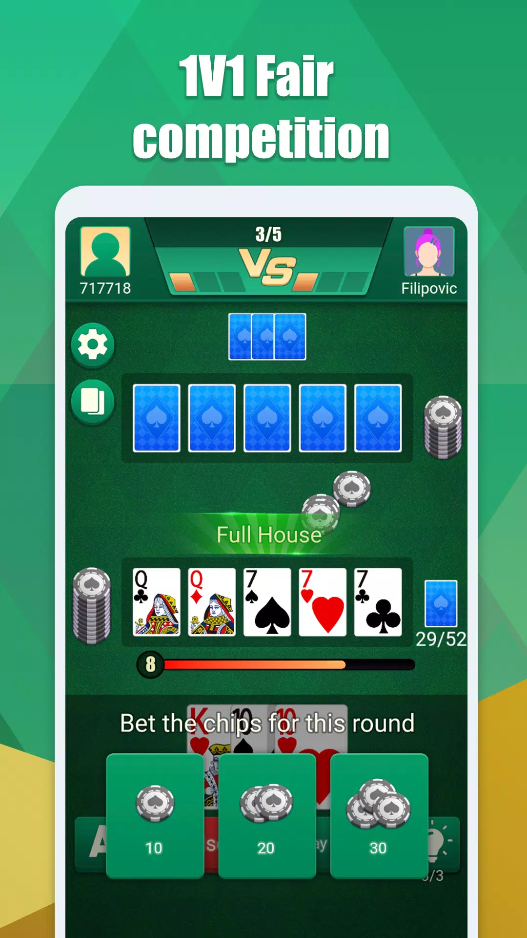 快节奏刺激:平均每场比赛 3 分钟,共 5 轮。双方牌型完全镜像,公平性有保障——胜者全取,牌型大小和下注策略决定胜负。