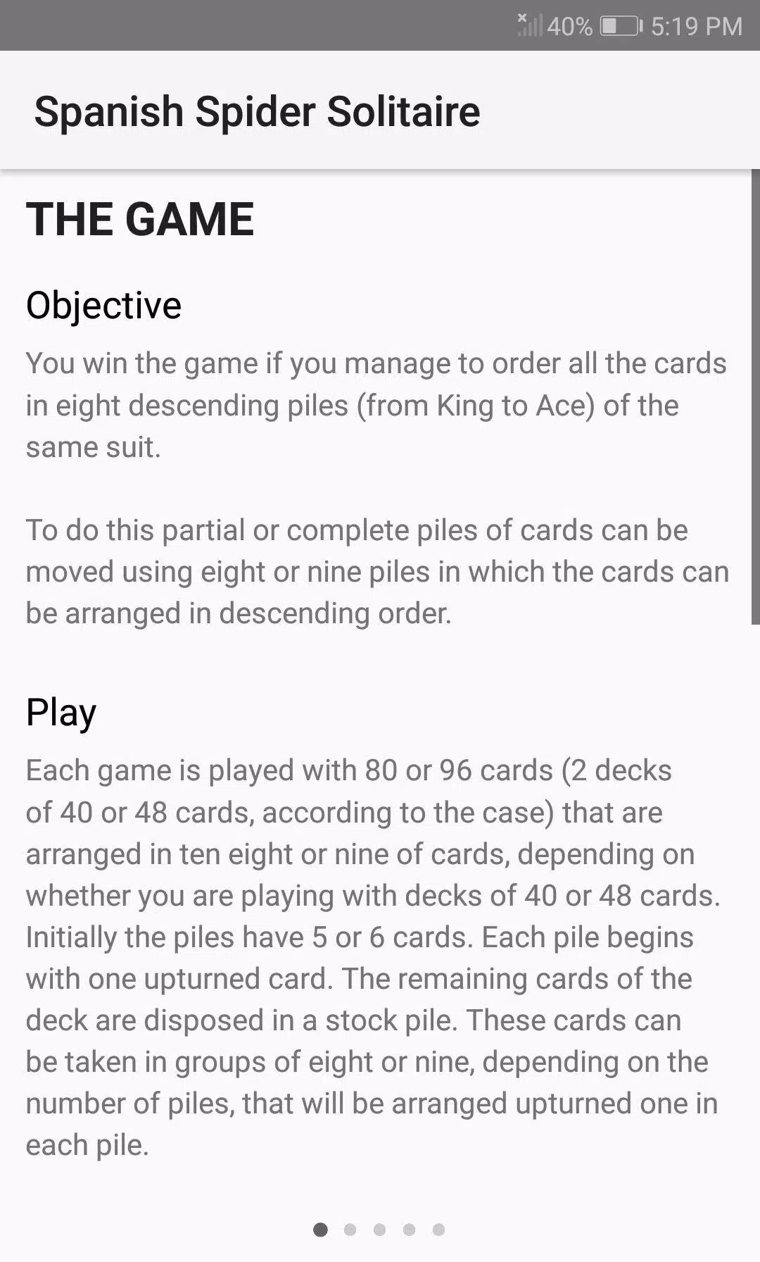 – 西班牙蜘蛛纸牌的目标是将同一花色的牌堆成一叠,从 A 开始,到 K 结束。