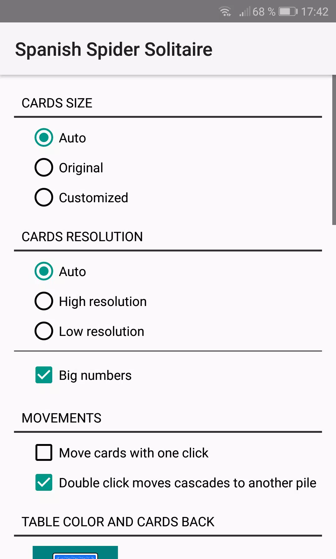 – 设置:纸牌大小和分辨率、牌组类型(四色或经典)、牌背颜色、声音、计分牌、牌桌颜色和分数、牌堆移动方式(单击、双击等)、牌堆位置和大小等