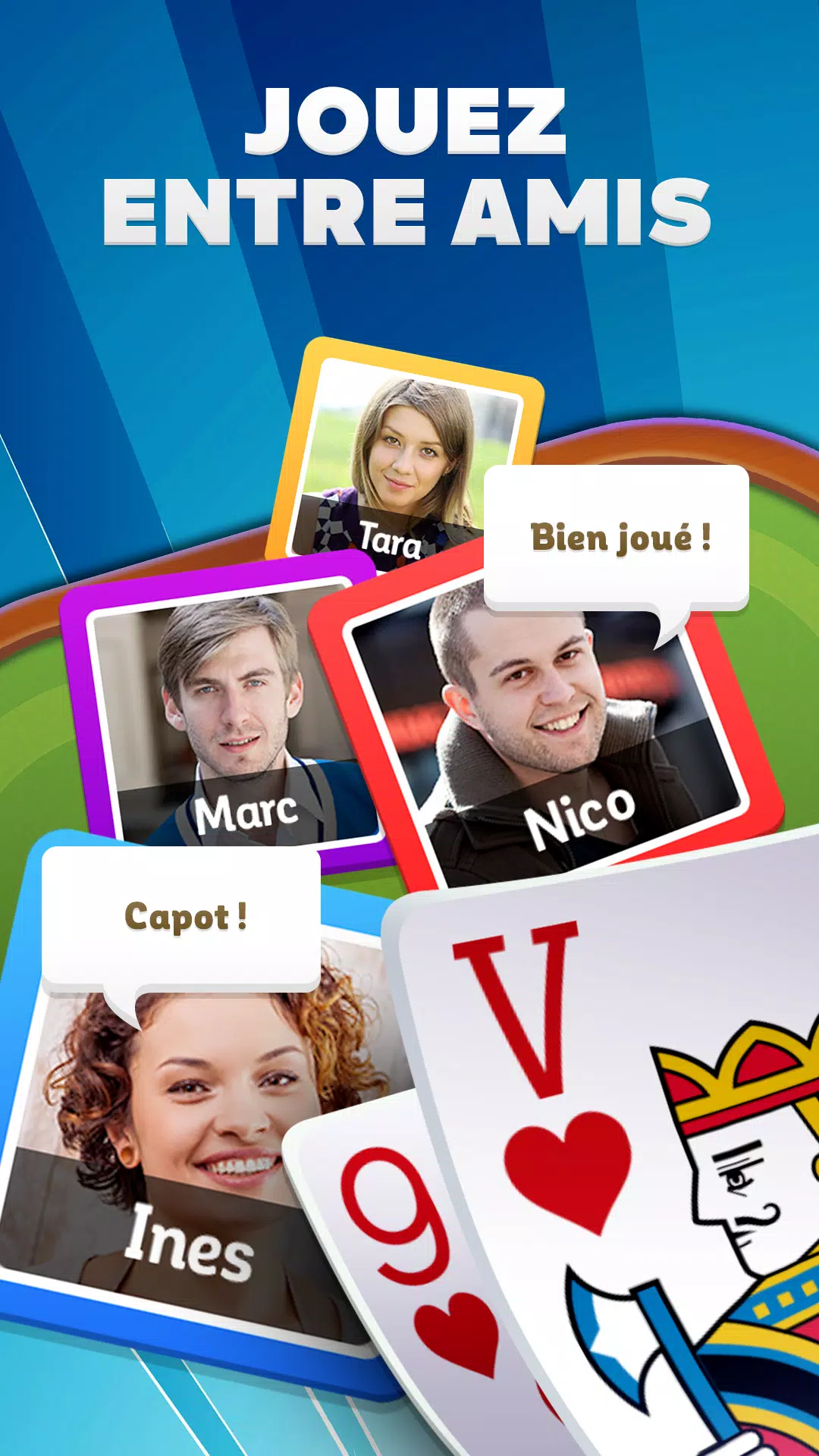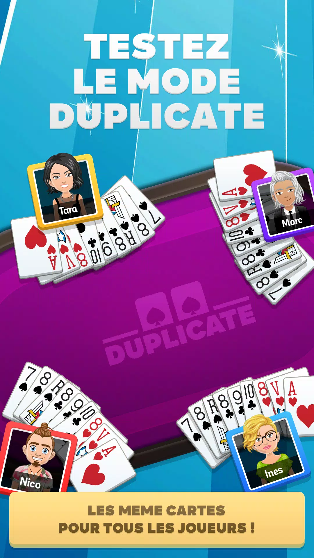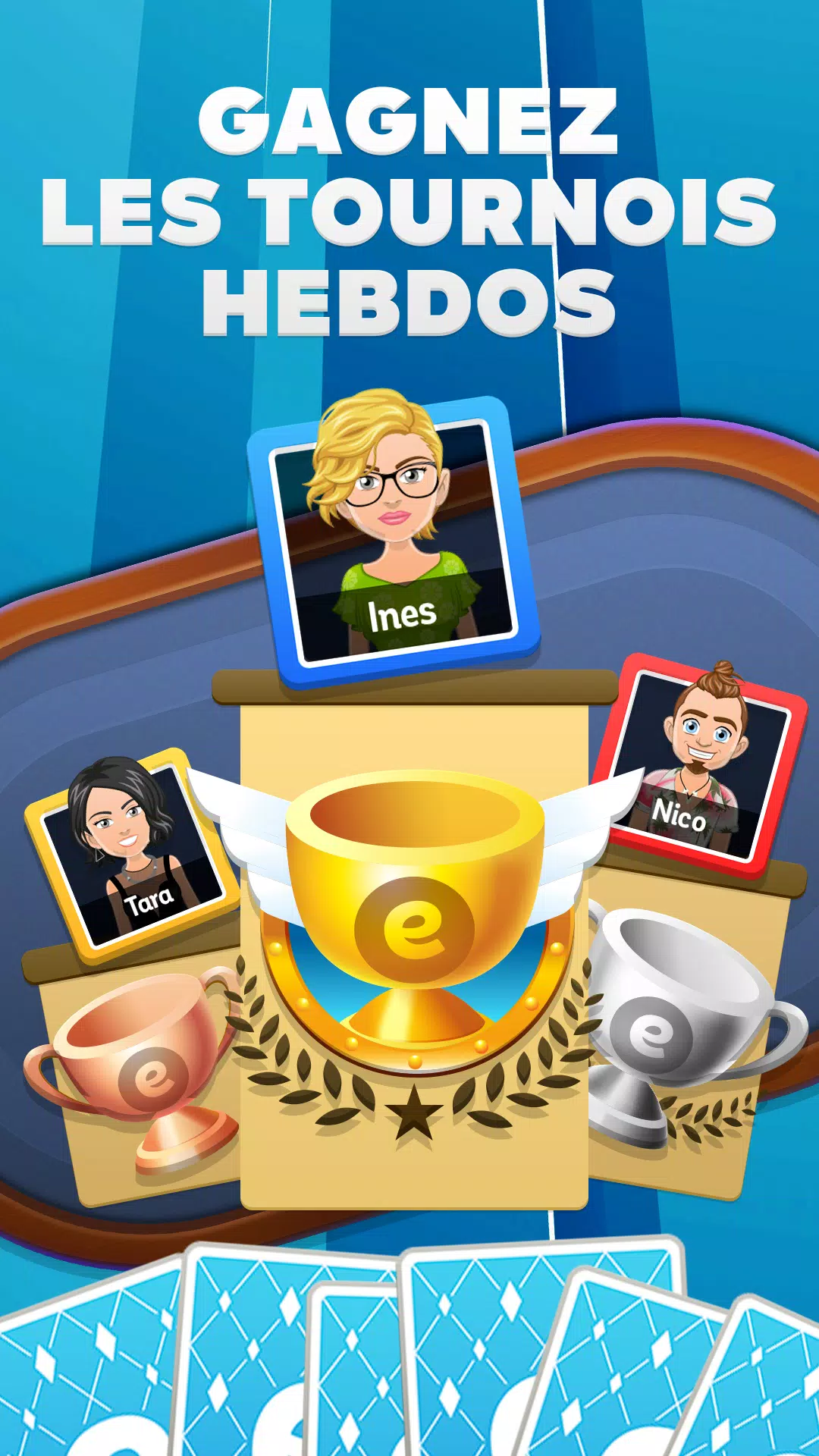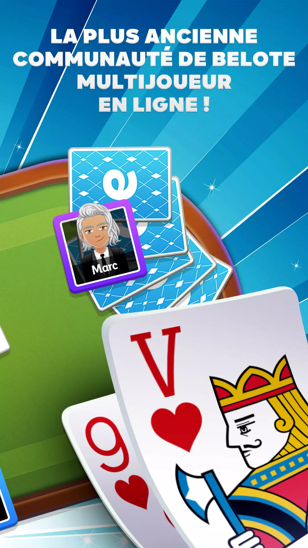 每天,与成千上万的爱好者一起玩 Belote 或 Coinche,并在激烈的联赛和锦标赛中挑战他们。