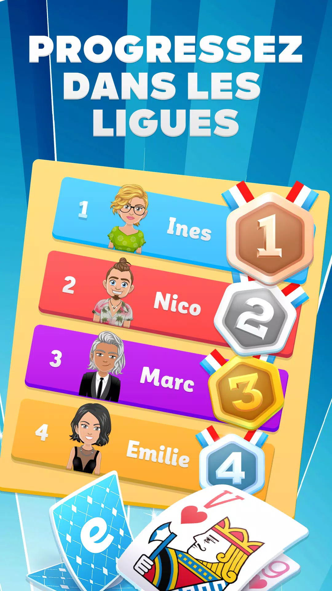 您玩的每一局游戏都会提升您在 Belote 联赛中的等级。 🎯 目标:赢得尽可能多的比赛,加入法国顶尖多人贝洛特玩家的行列