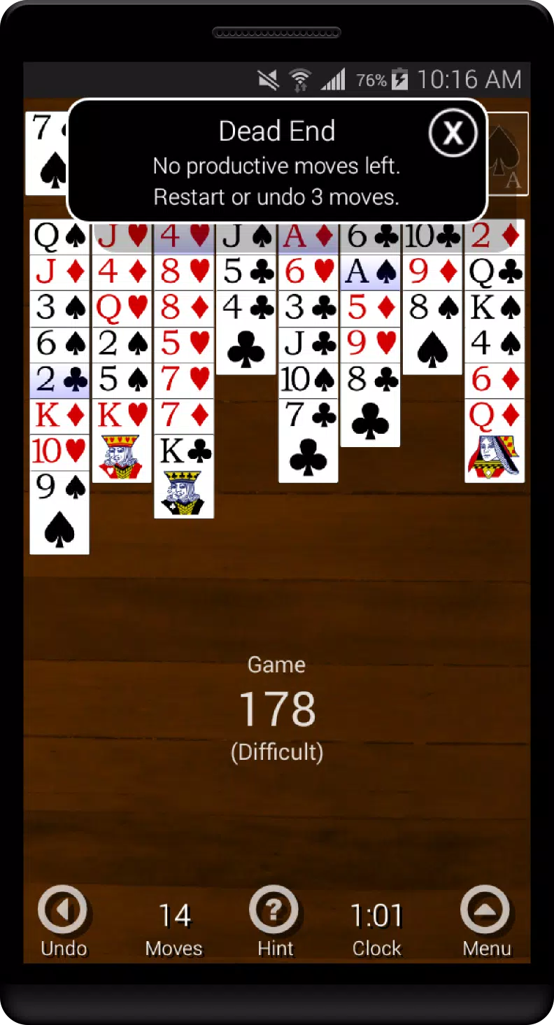 在你玩游戏的过程中,《永远的空当接龙》会持续分析你的游戏,以找到最短的解决方案。所以,如果你遇到困难并点击提示按钮,应用会根据你当前的情况显示最佳的获胜方法。