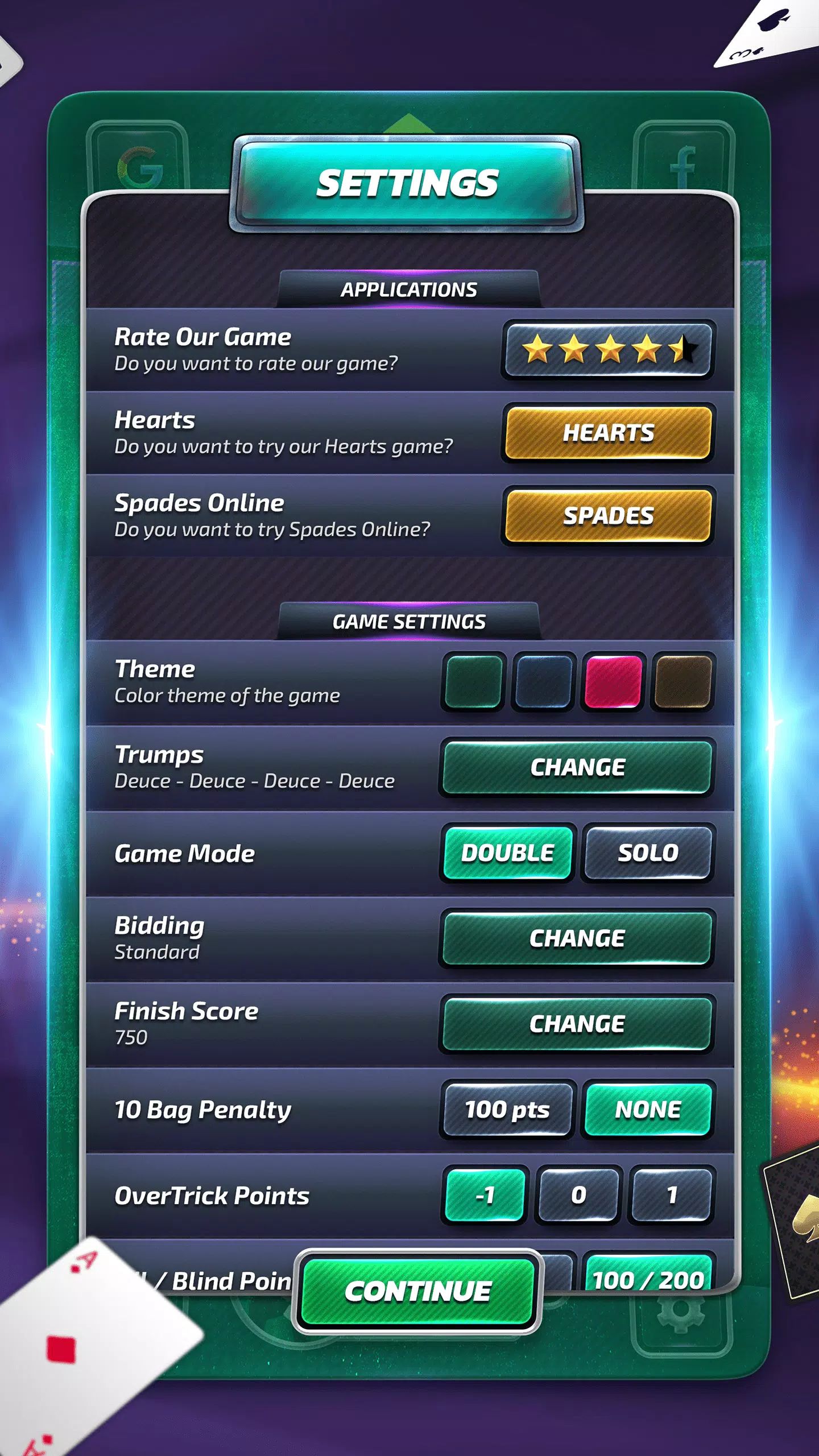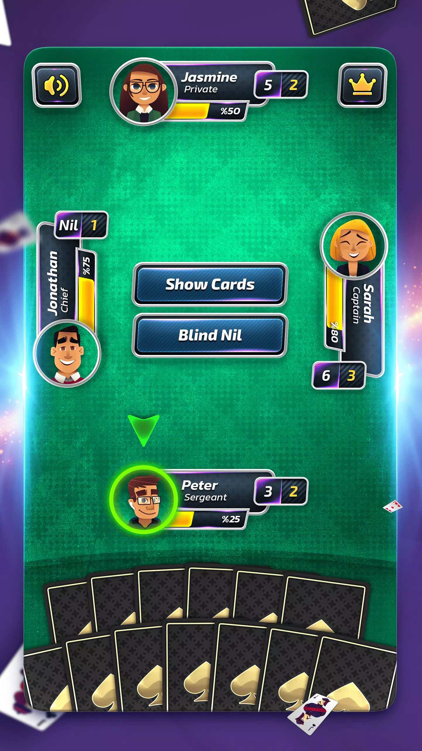 这个游戏是经典的免费黑桃游戏。 玩先进的人工智能模拟的对手的黑桃的着名的游戏。 现在玩Spades游戏。