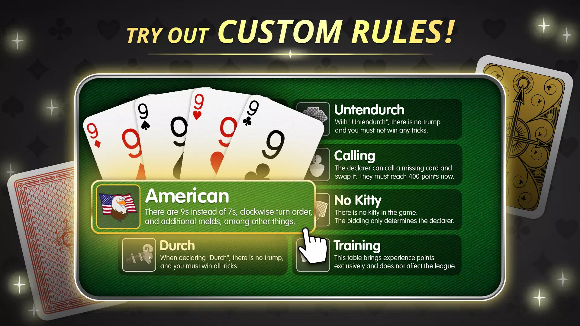 Pinochle 游戏面向成年人。根据德国法律,Pinochle 游戏不属于赌博游戏。我们的应用程序不涉及真钱,也不提供任何真正的奖品。在没有真实奖金的赌场游戏(“社交赌场游戏”)中练习或成功,并不意味着将来在真钱游戏中也能成功。