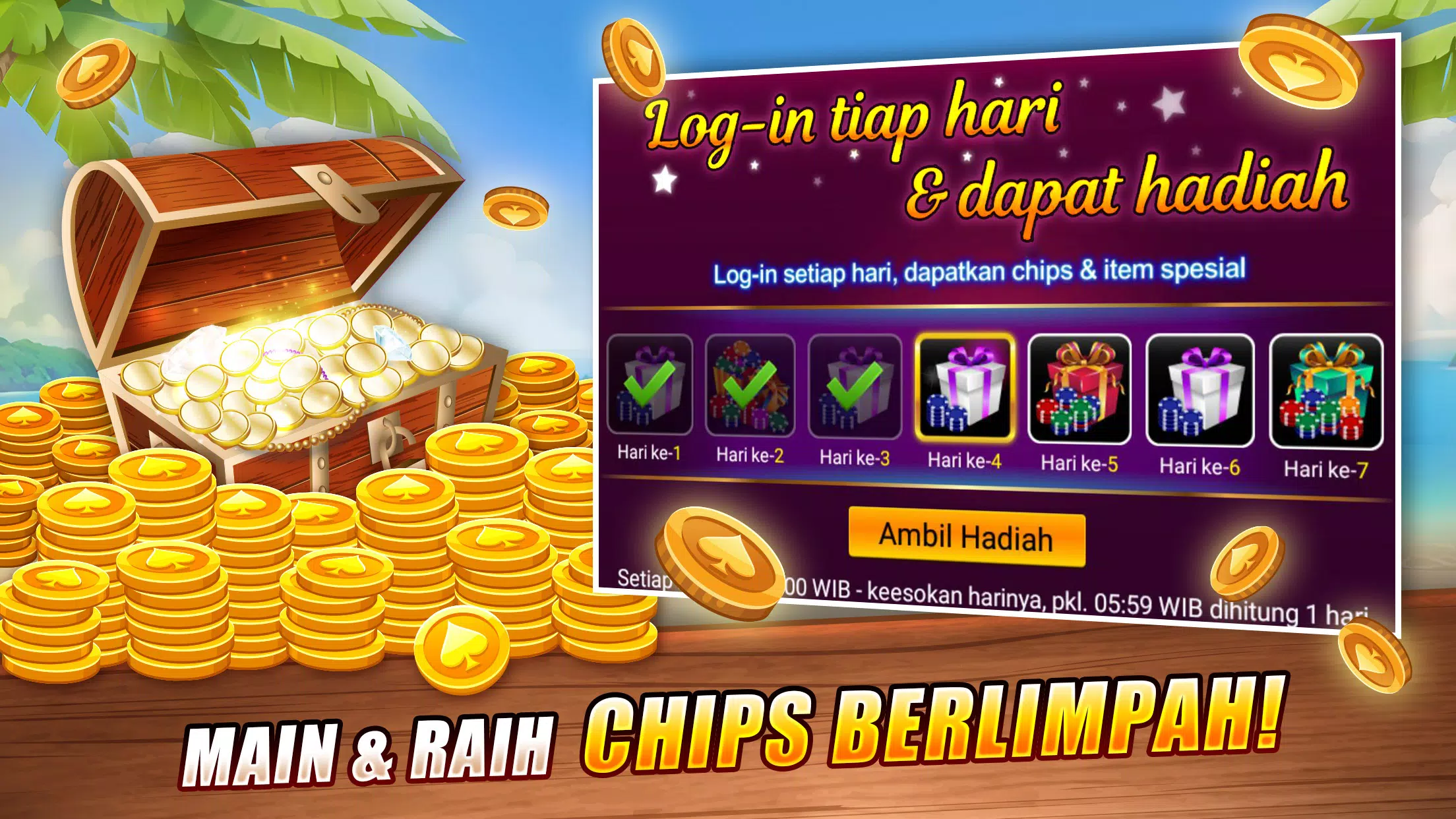 ♣ 每日丰厚奖励,筹码无限畅玩 Gaple、QQ/QiuQiu/99、扑克和 Remi!