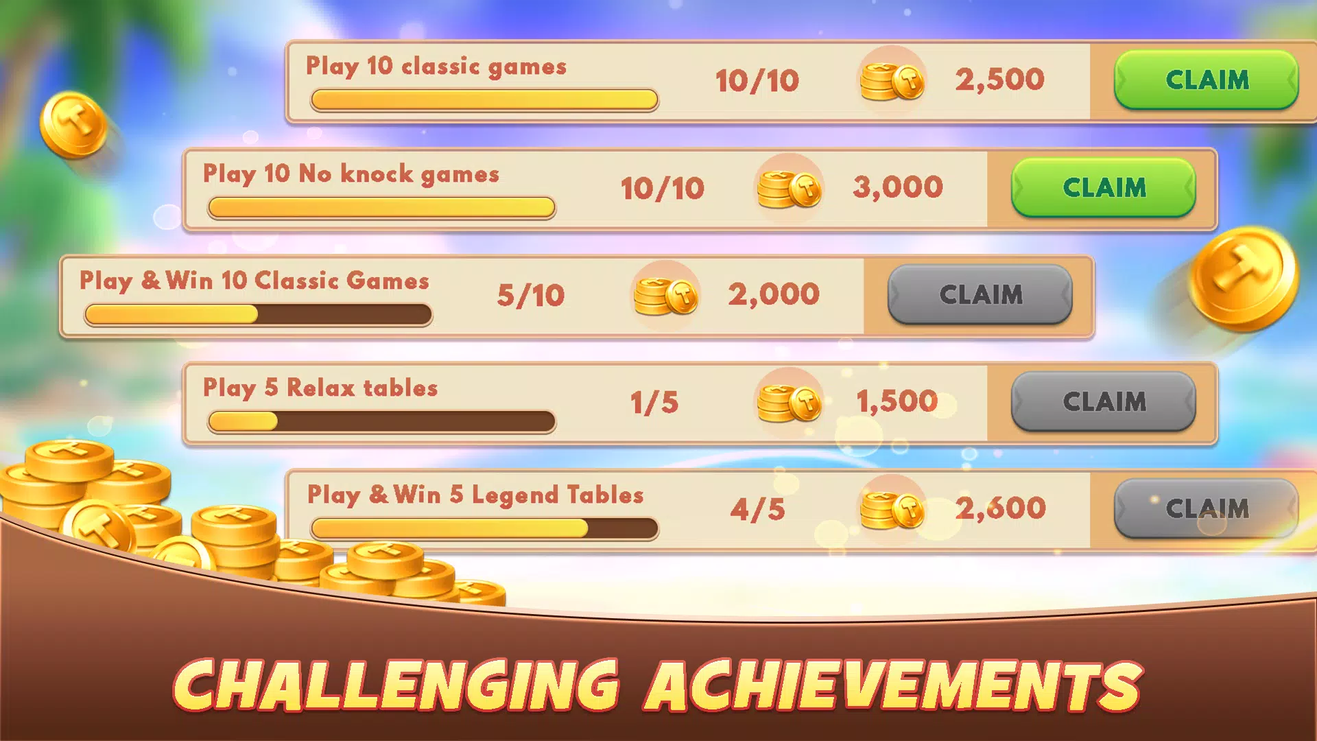 Tonk 在美国和其他北美地区广受欢迎,它注重逻辑、策略和高效的卡牌组合。您可以按照自己的节奏与智能 AI 对手对战,也可以享受轻松的离线对战,游戏提供多种模式和现代化的易用界面。