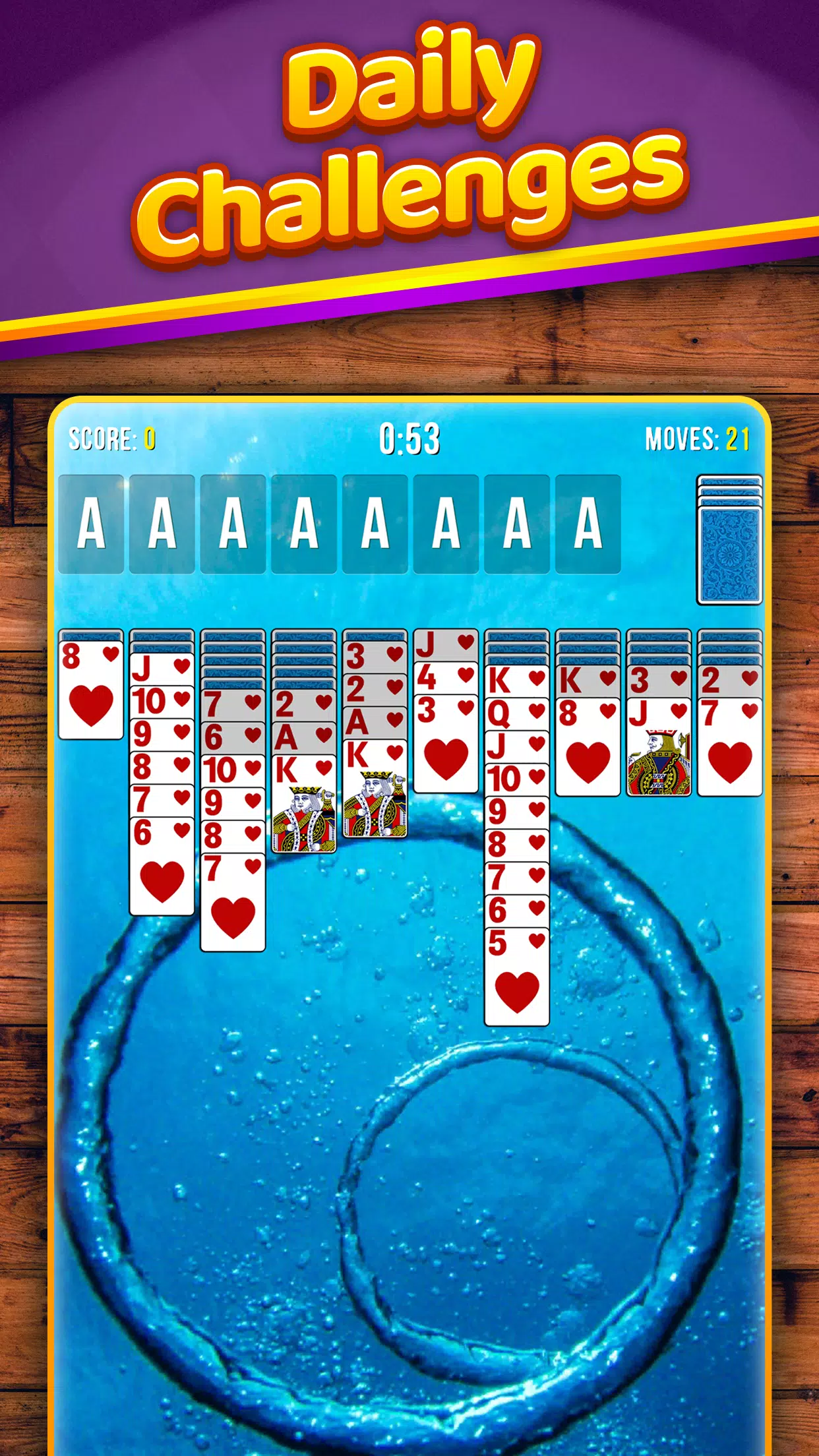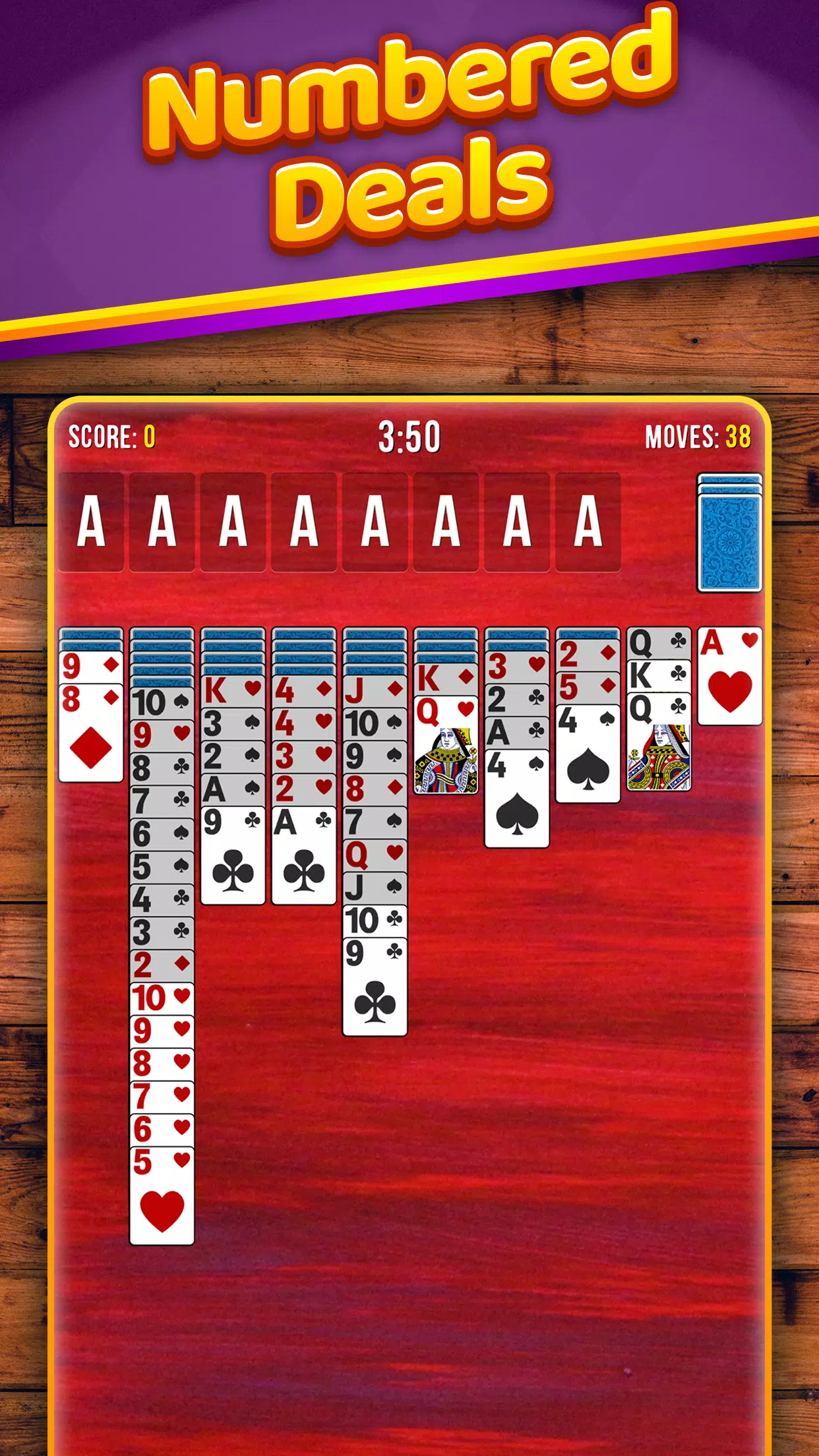 有序的牌组是国王在上,A 在下。完成一叠牌后,牌会自动从棋盘上移除并移至空置的牌堆,以便您可以专注于剩余未排列的牌。