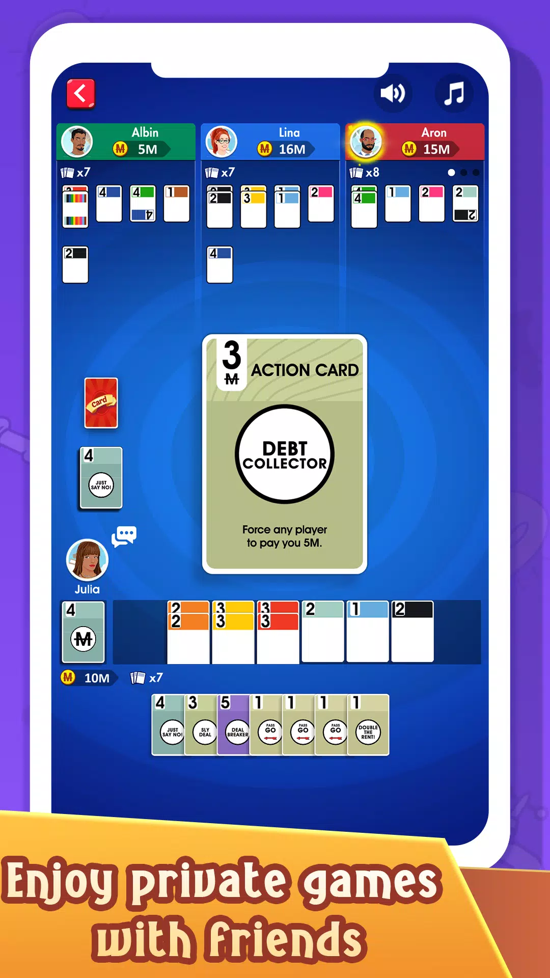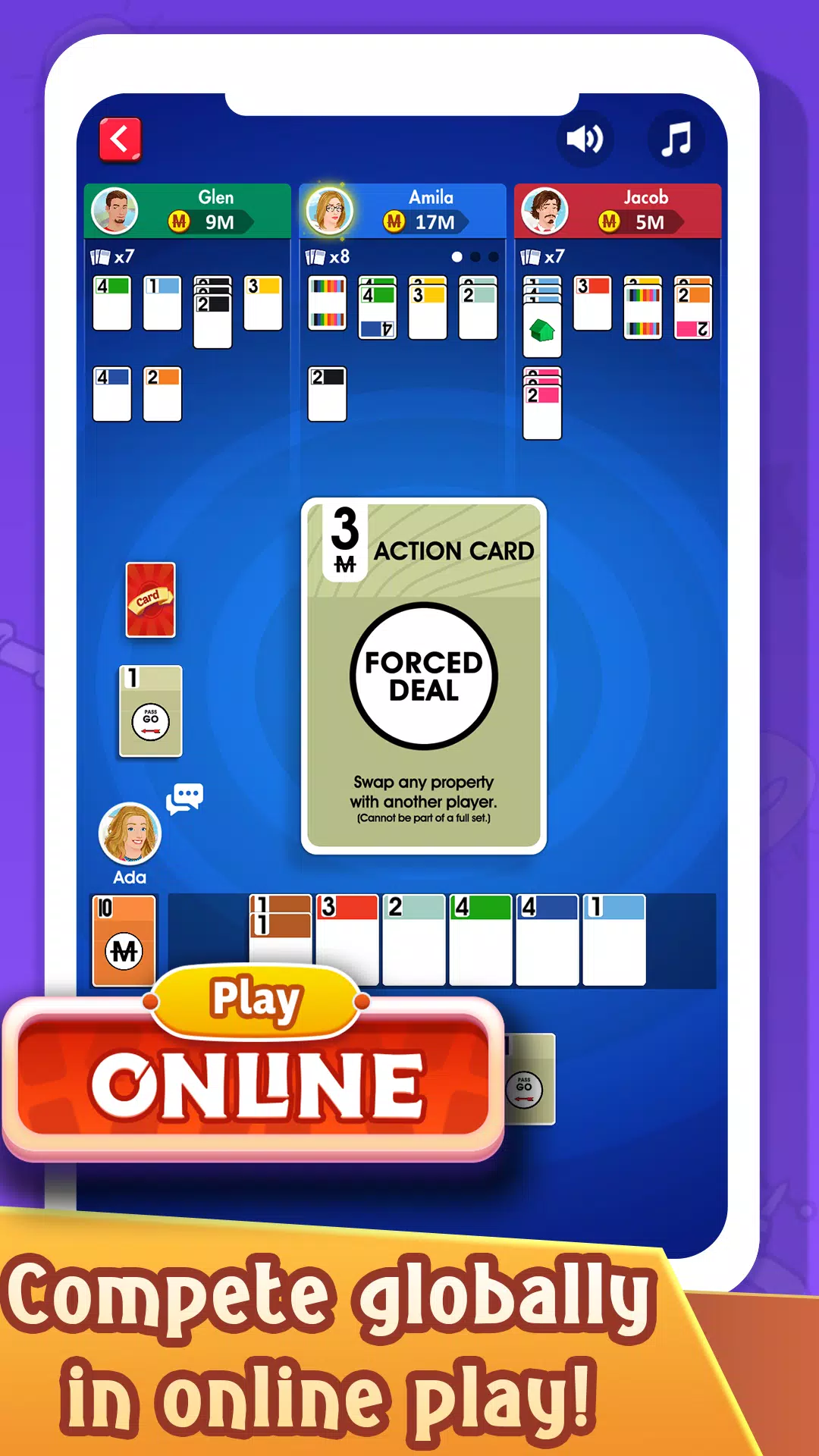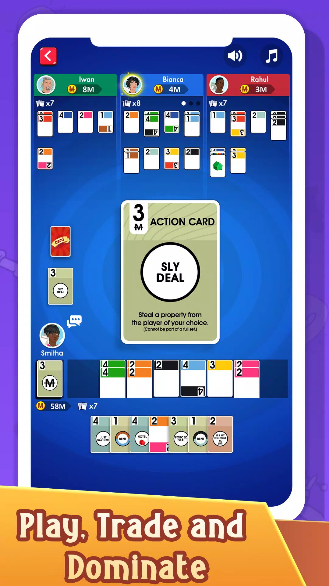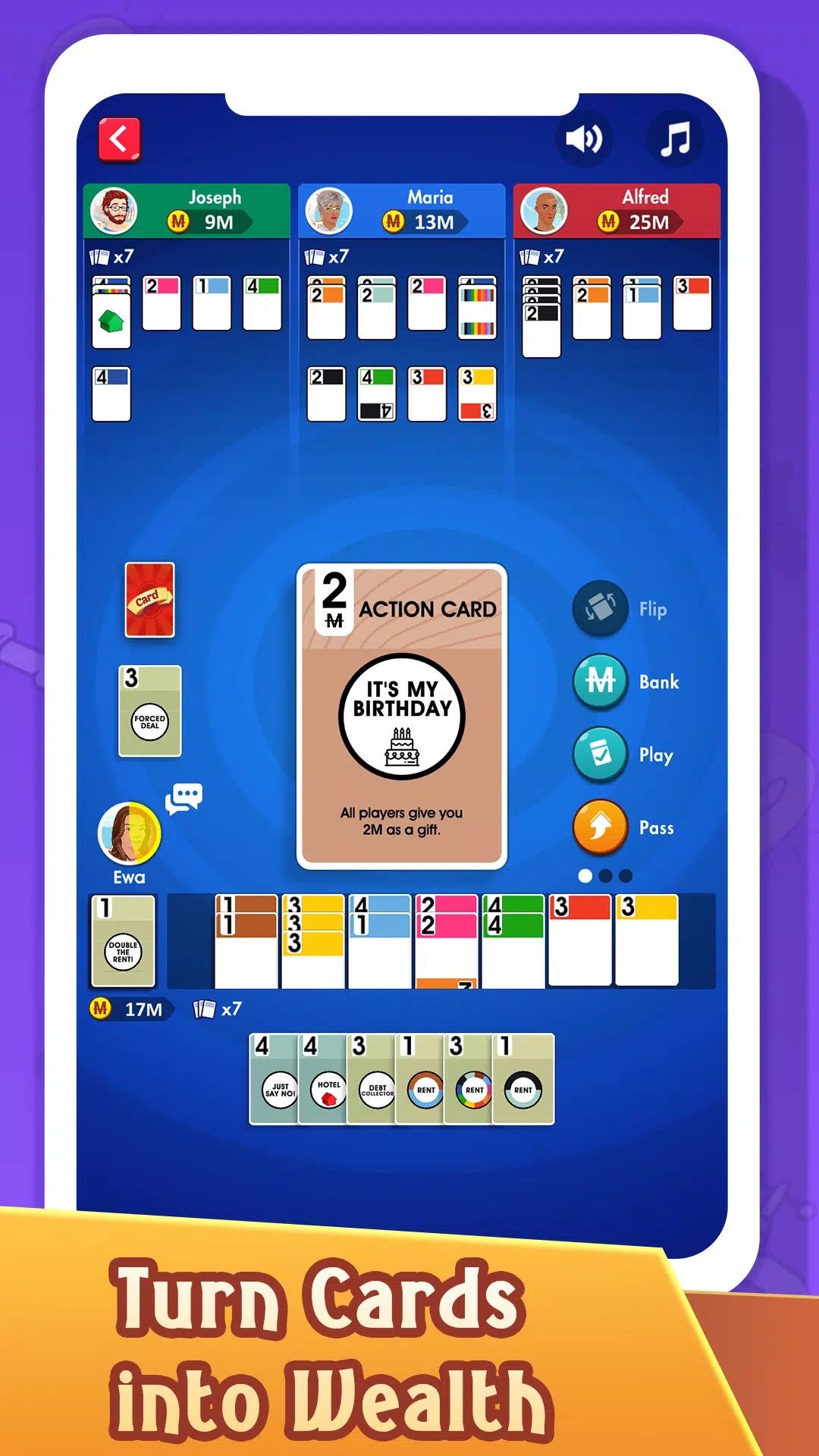 在你的回合中,选择卡牌并部署行动卡,可以向玩家收取租金、窃取他们的卡牌或索要生日礼物。