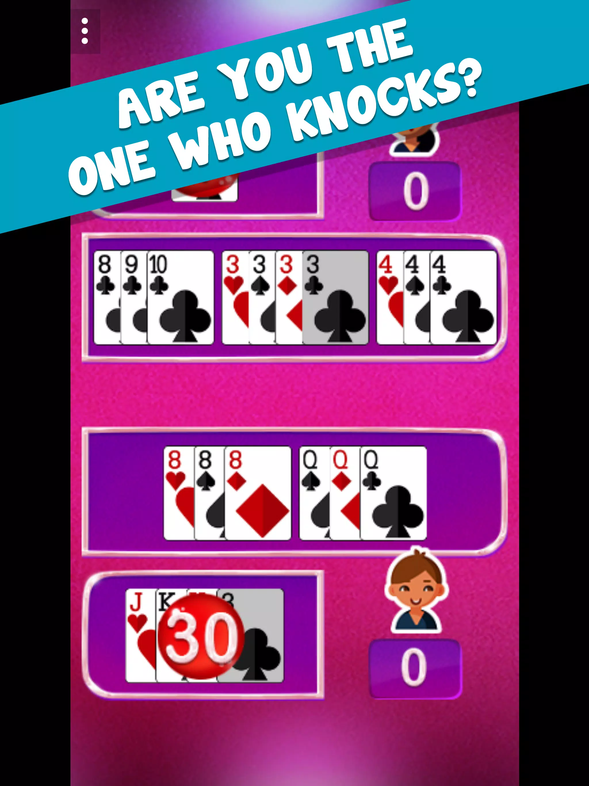 目标是“敲牌”。这意味着当你组合出足够多的顺子或套牌,使牌堆中不匹配的牌的总点数低于 10 时,你就可以结束游戏。