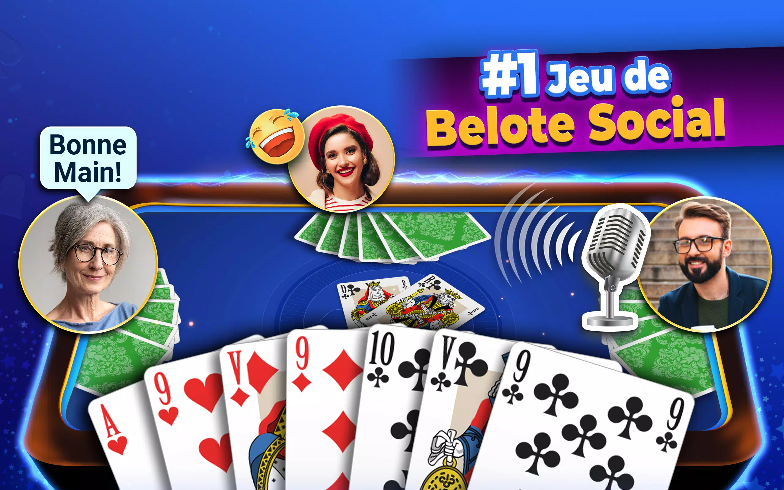 从多人 Belote 游戏开始!以 VIP 身份在全球聊天室畅聊,点赞个人资料,发送好友请求,并在在线 Belote 游戏结束后评价您的搭档。向您附近的在线好友展示您的游戏!