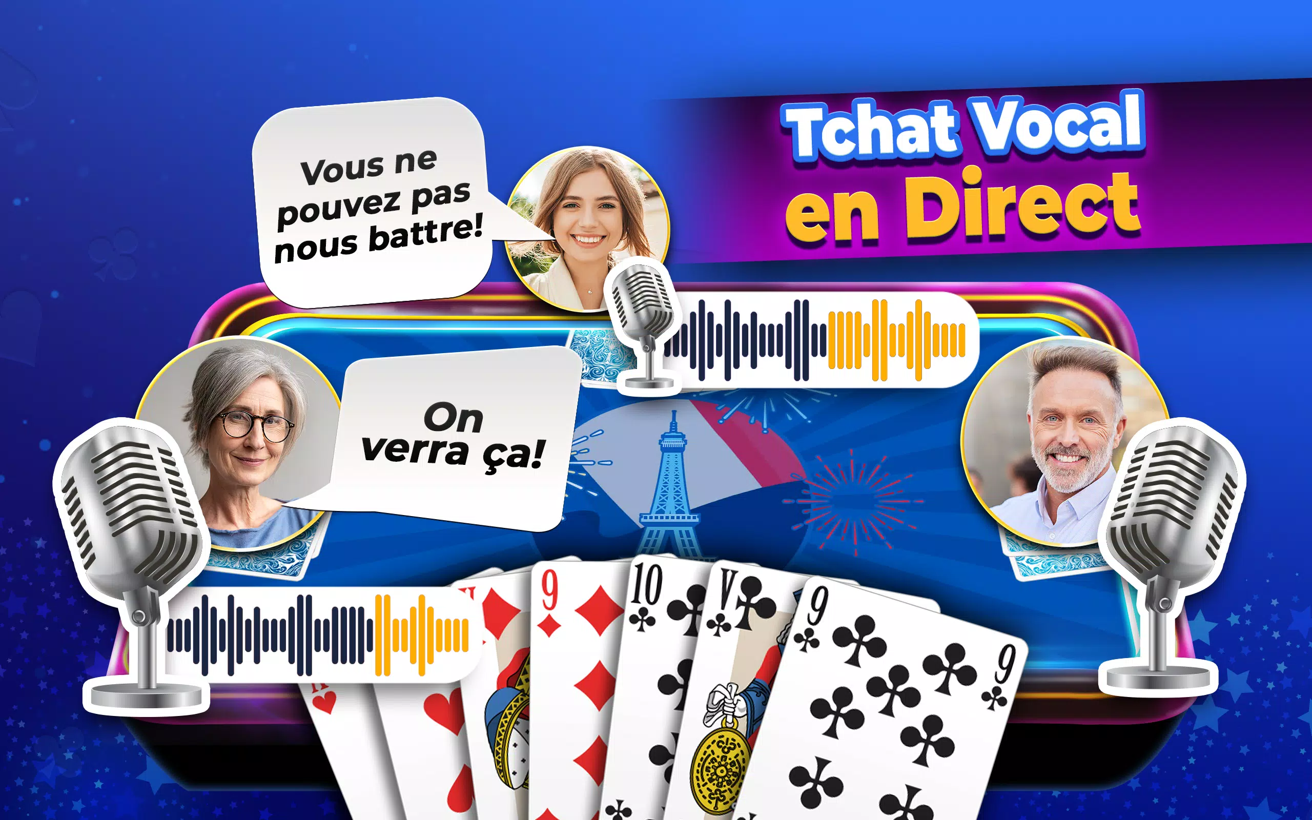 在您的专属免费 Belote 游戏中与其他玩家实时聊天。最具社交性的纸牌游戏。