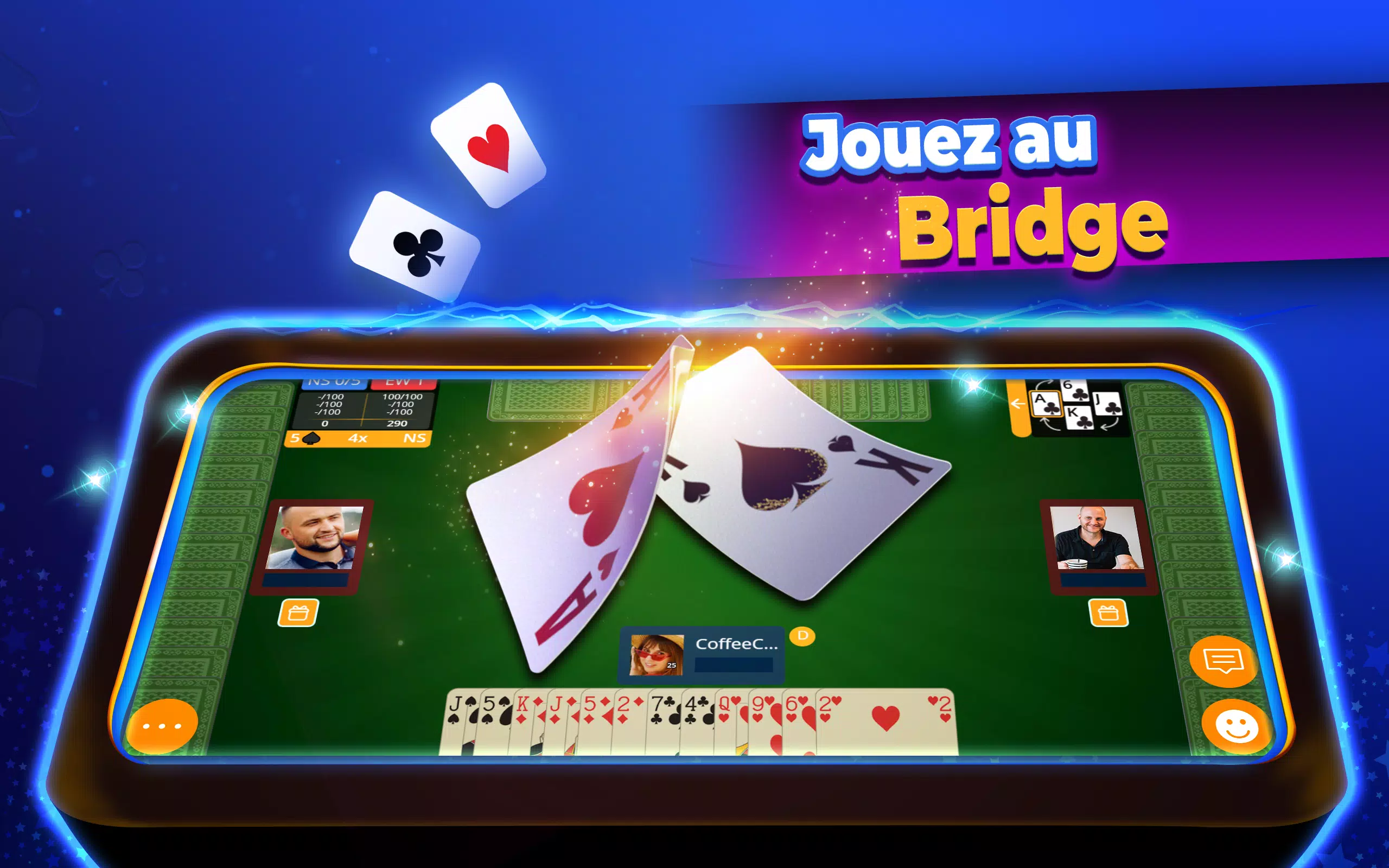 与亲朋好友在线畅玩 Belote、Coinche、桥牌和 Contrée。选择全王牌/无王牌模式,并可宣布您的下注!☕