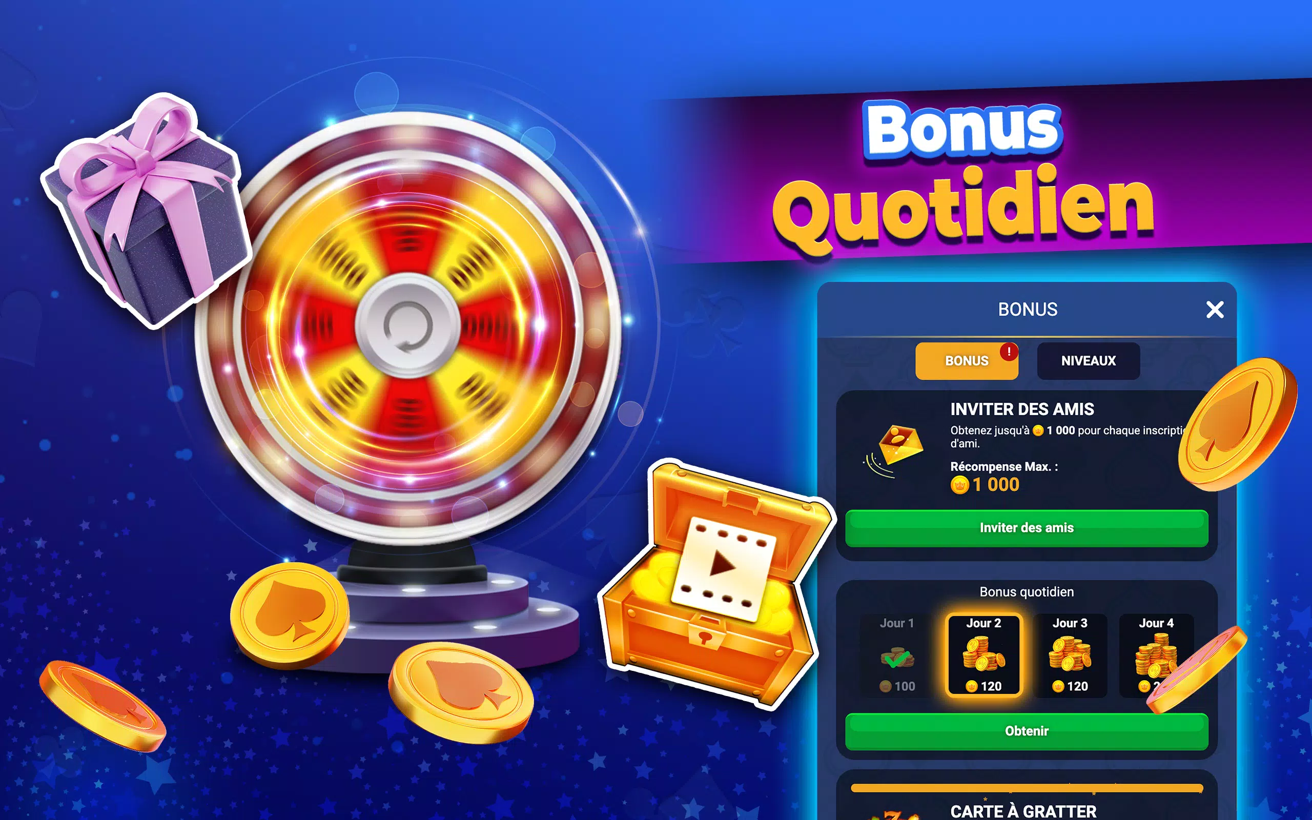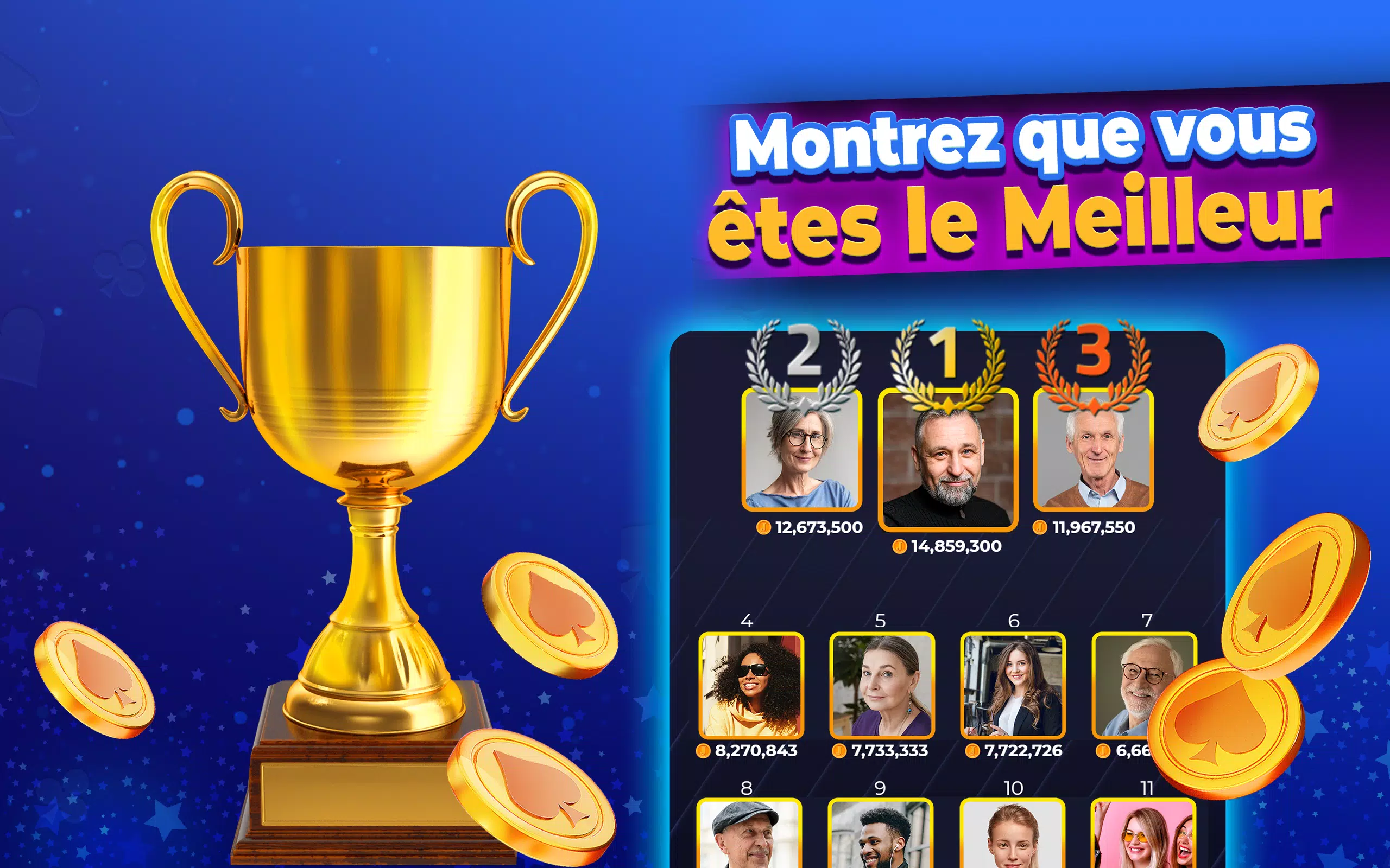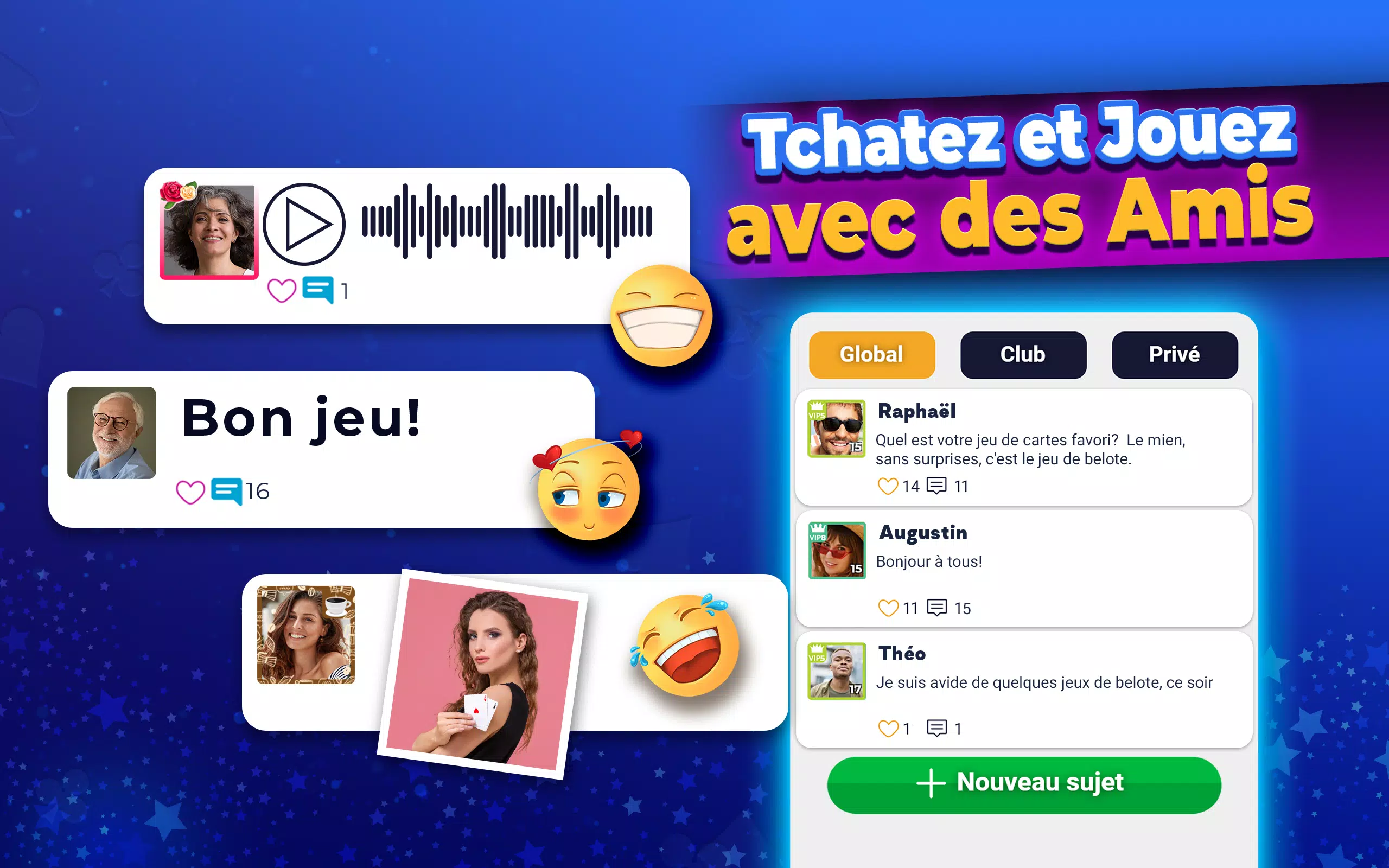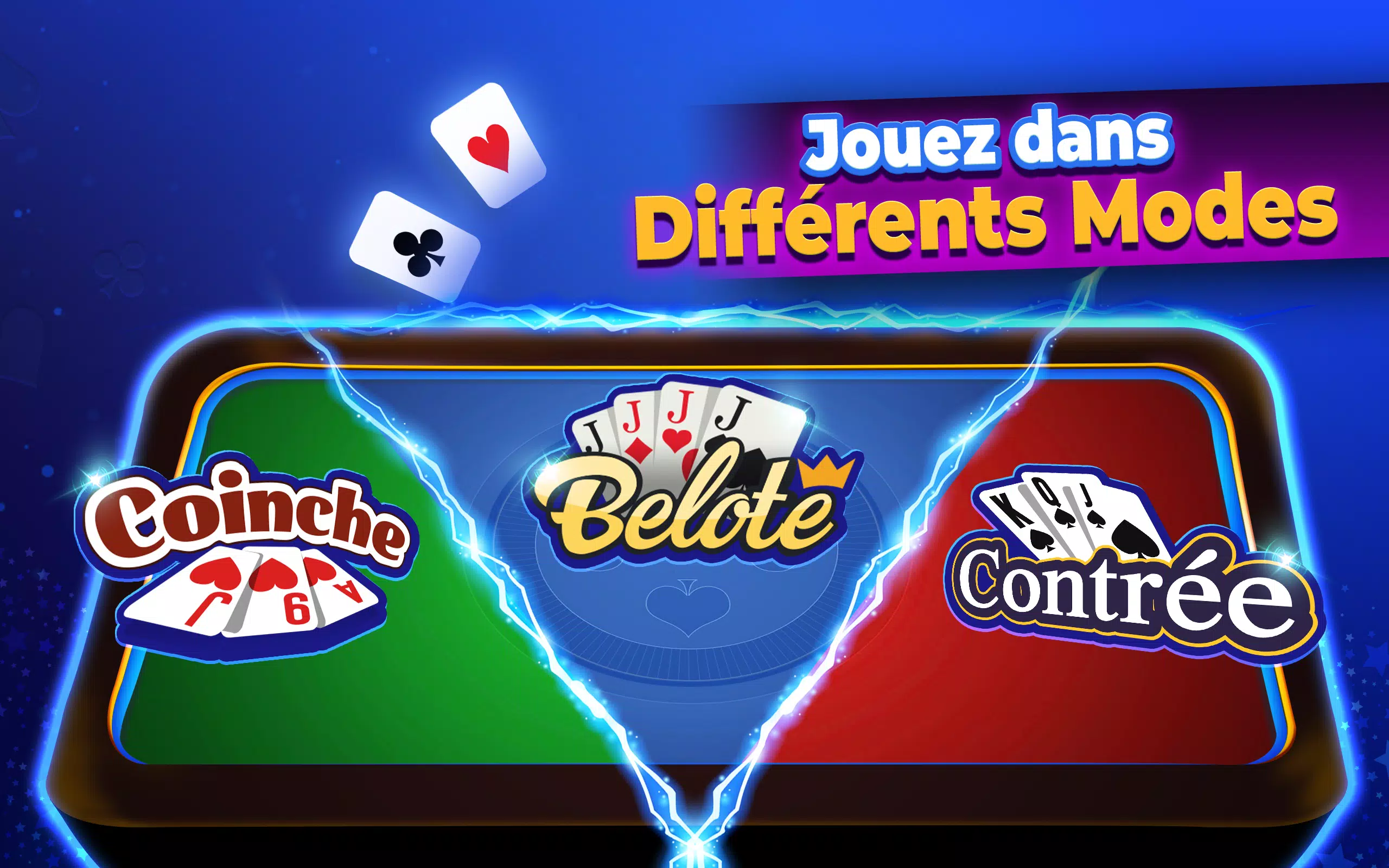 成为您 Belote 俱乐部的领袖!打造一个充满竞争的社交俱乐部!选择您希望俱乐部加入的 13 个法国地区之一!邀请好友,畅玩多人 Belote 游戏,积累俱乐部经验,赢取丰厚奖励!
