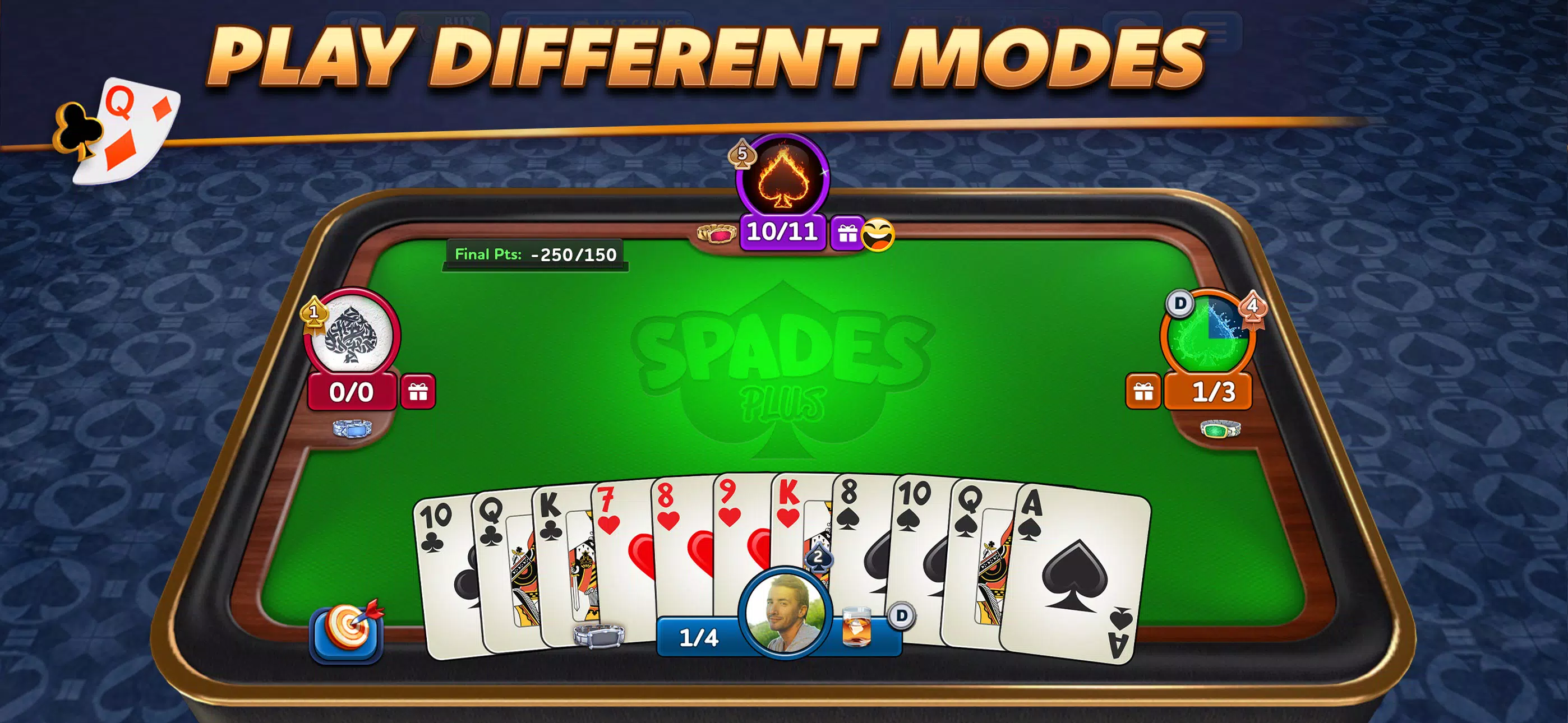 If you want to play Spades, then Join the biggest Spades Community with millions of players in the World! Spades Plus offers the strategy elements of Texas Hold’em Poker and luck elements of Slot games. Play against most challenging Spades players all around the world.