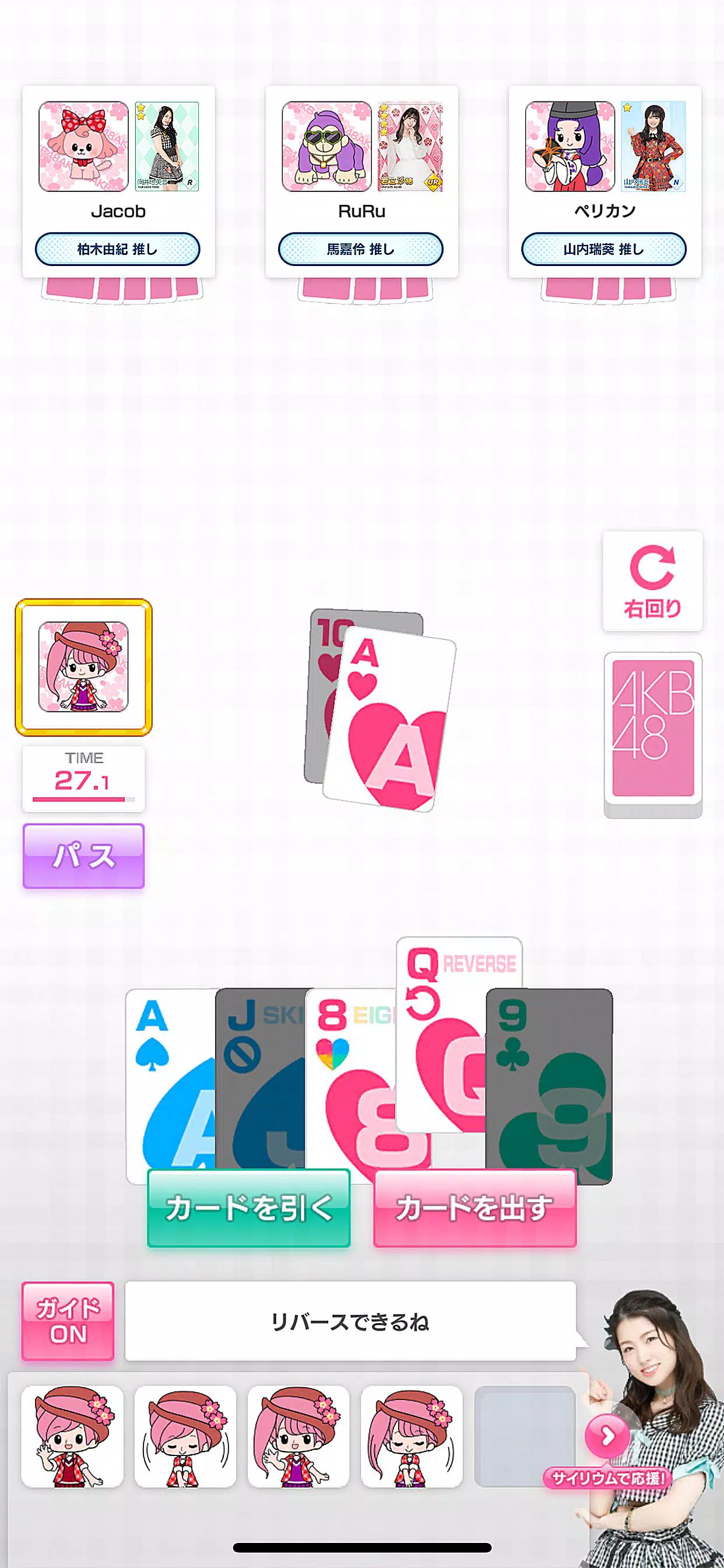 选择你喜欢的AKB48成员,玩Dobon,卡片会不断增长,与AKB成员们的亲密度也会随之提升!