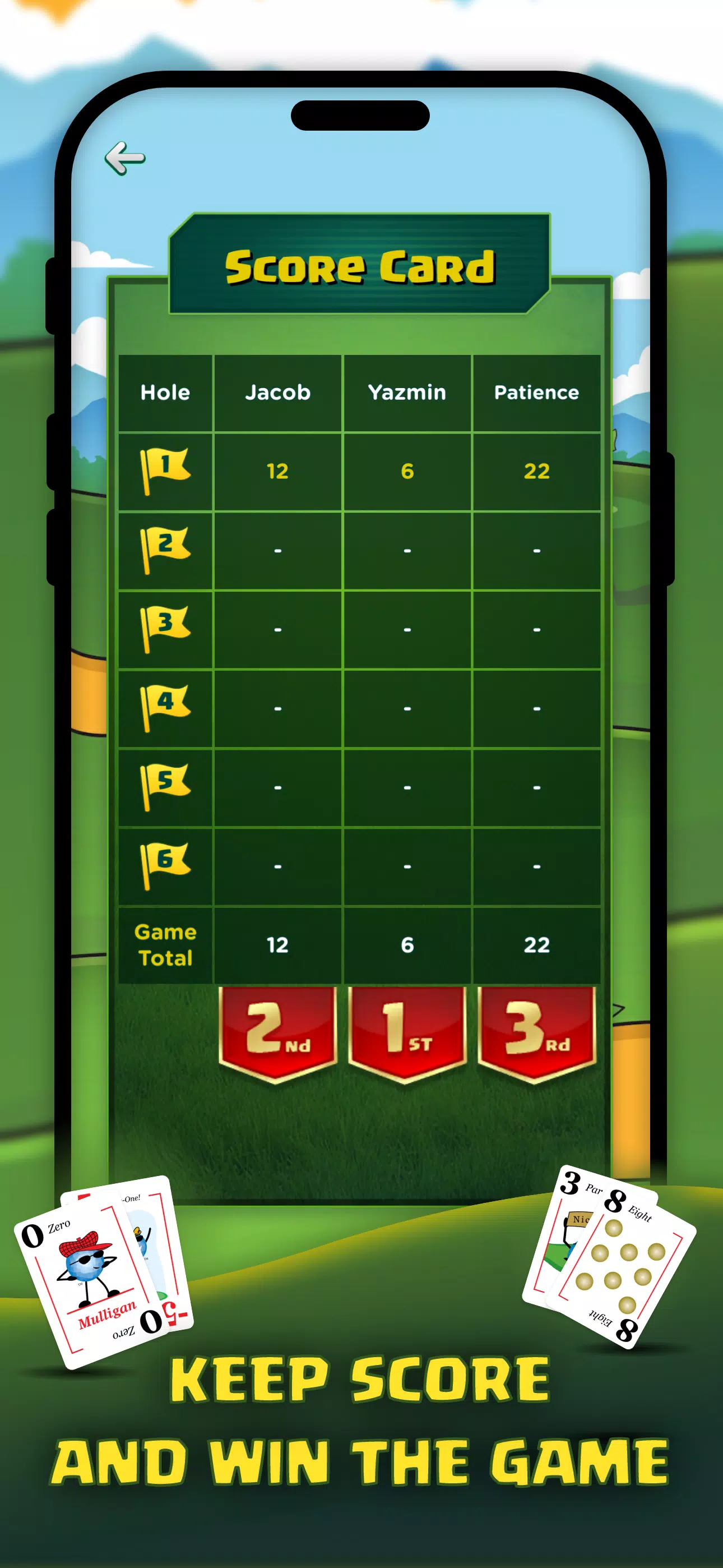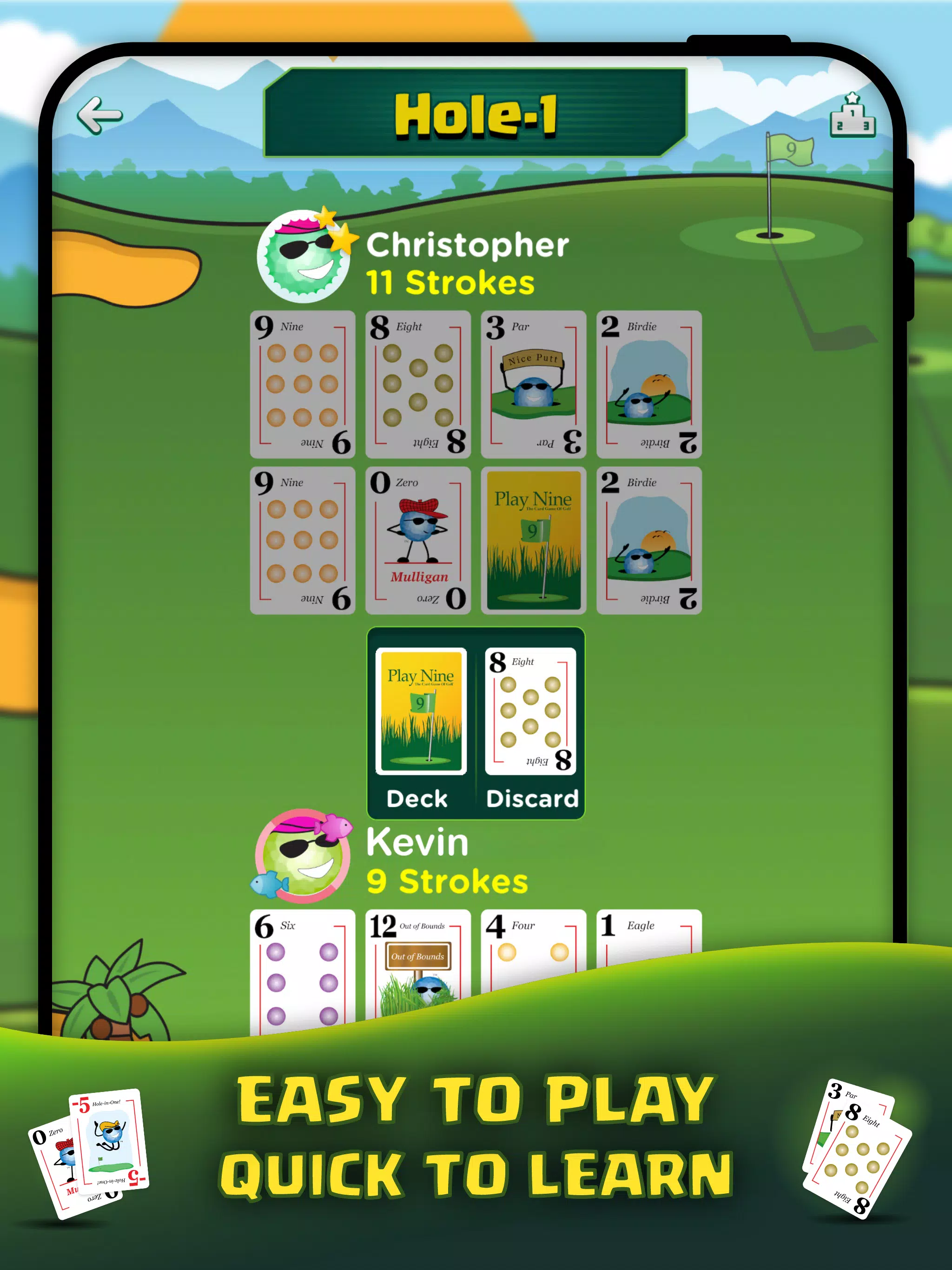 与高尔夫类似,Play Nine 的目标是尽可能减少击球次数。通过匹配成对的牌并一杆进洞来限制击球次数。在 9 洞后,争取用最少的杆数获得最低杆数!