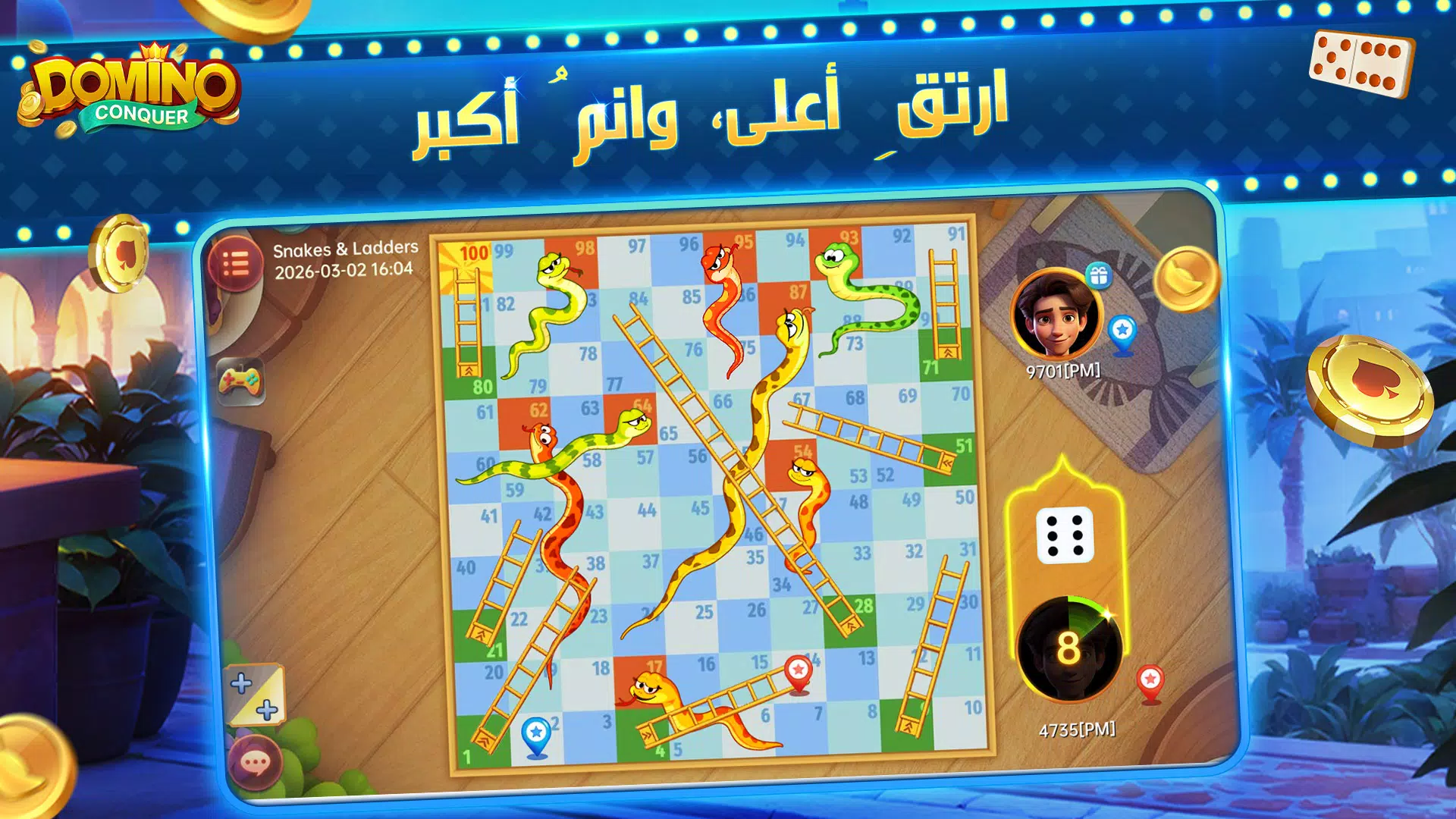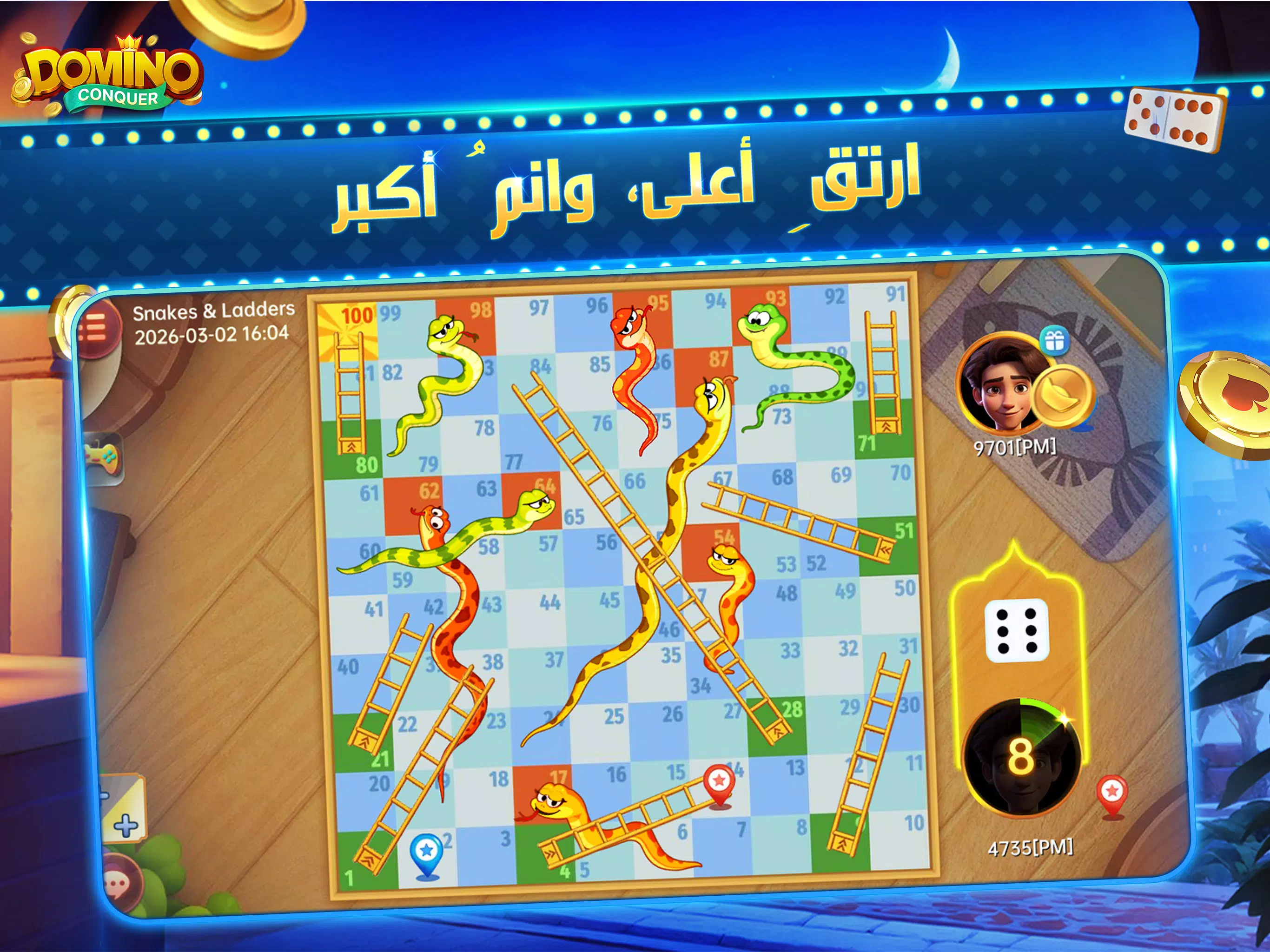 欢迎来到精彩纷呈的《征服多米诺》世界!在这里,经典多米诺骨牌与众多热门变体游戏完美融合,带来无穷乐趣!现在,我们最新推出的“蛇梯棋”将为您带来全新的游戏体验——快速刺激的游玩方式,助您快速提升等级。