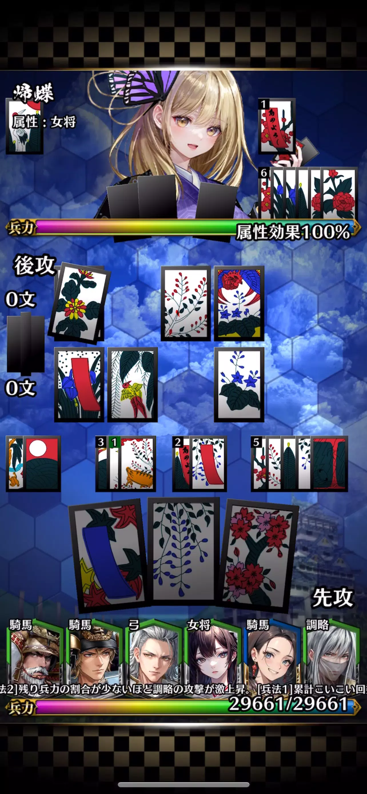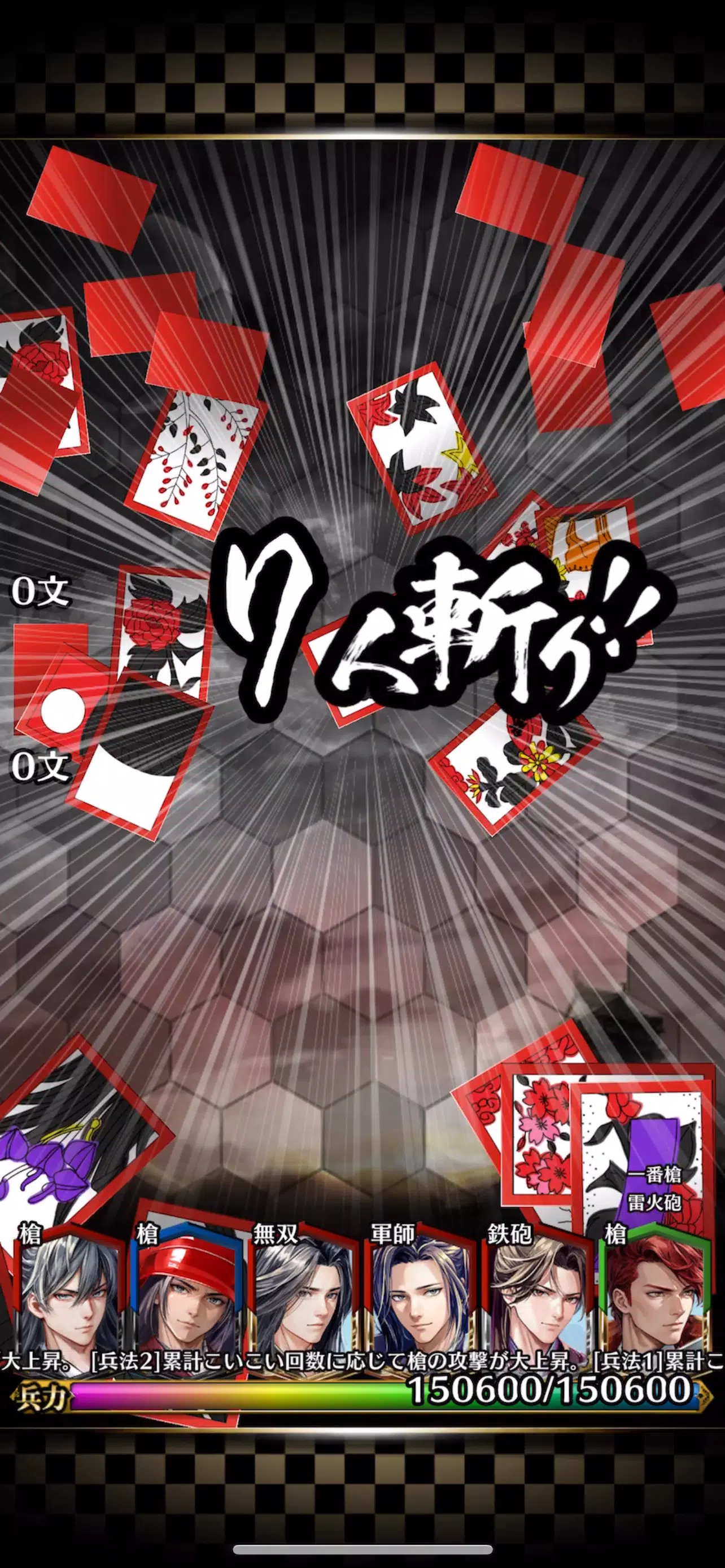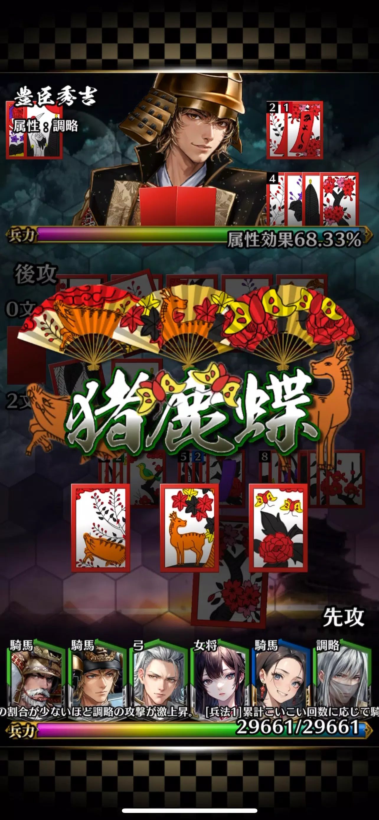 与战国军阀一起构建牌组,并使用 Koi Koi 规则打出花札牌。伤害的计算方法是将牌组中组织的军事指挥官的军事力量和攻击力与举手的句子数相加。在己方力量降为0之前,将对手的力量降为0即可获胜!