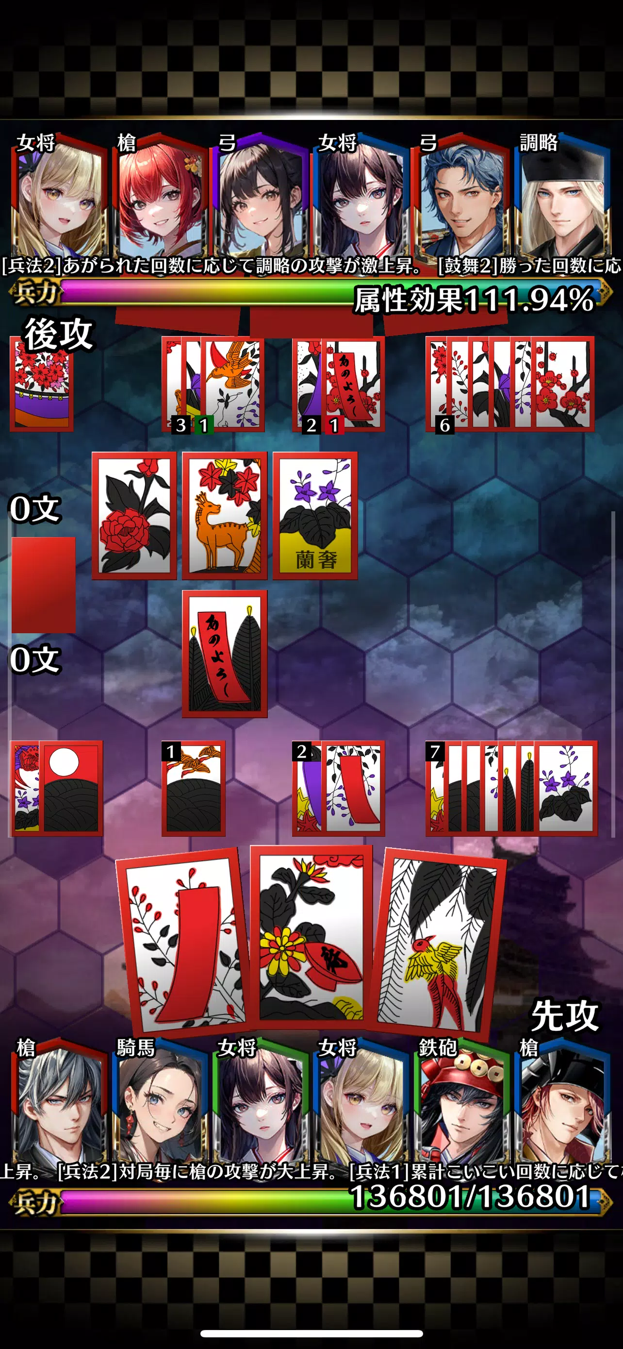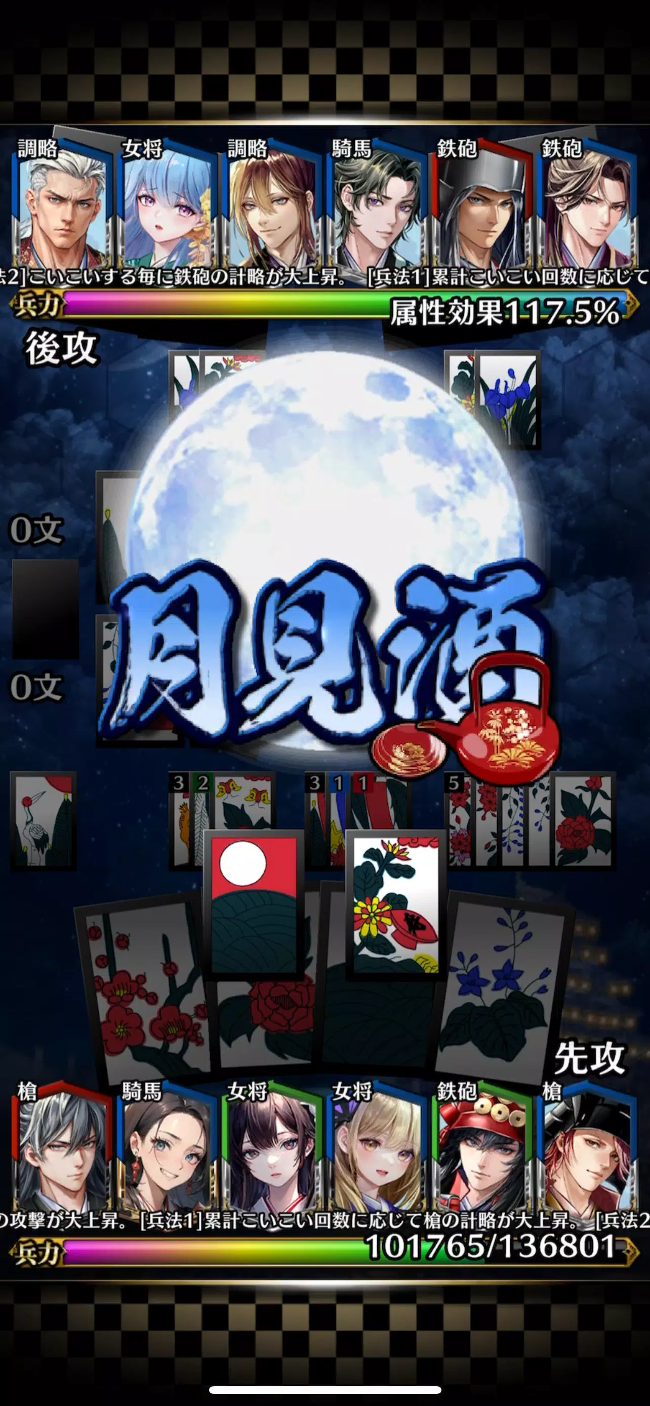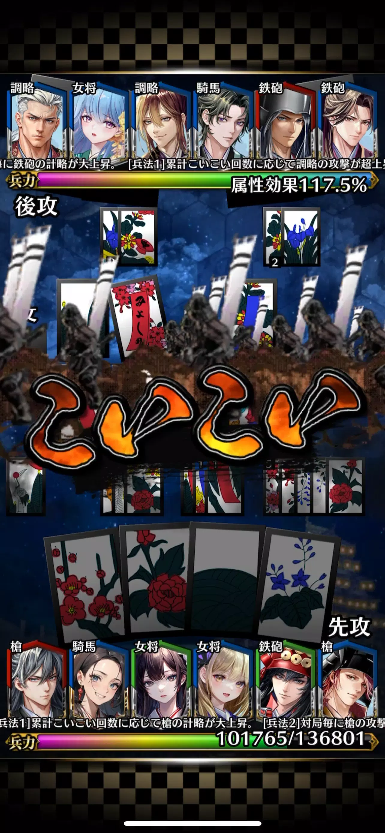 与战国军阀一起构建牌组,并使用 Koi Koi 规则打出花札牌。伤害的计算方法是将牌组中组织的军事指挥官的军事力量和攻击力与举手的句子数相加。在己方力量降为0之前,将对手的力量降为0即可获胜!