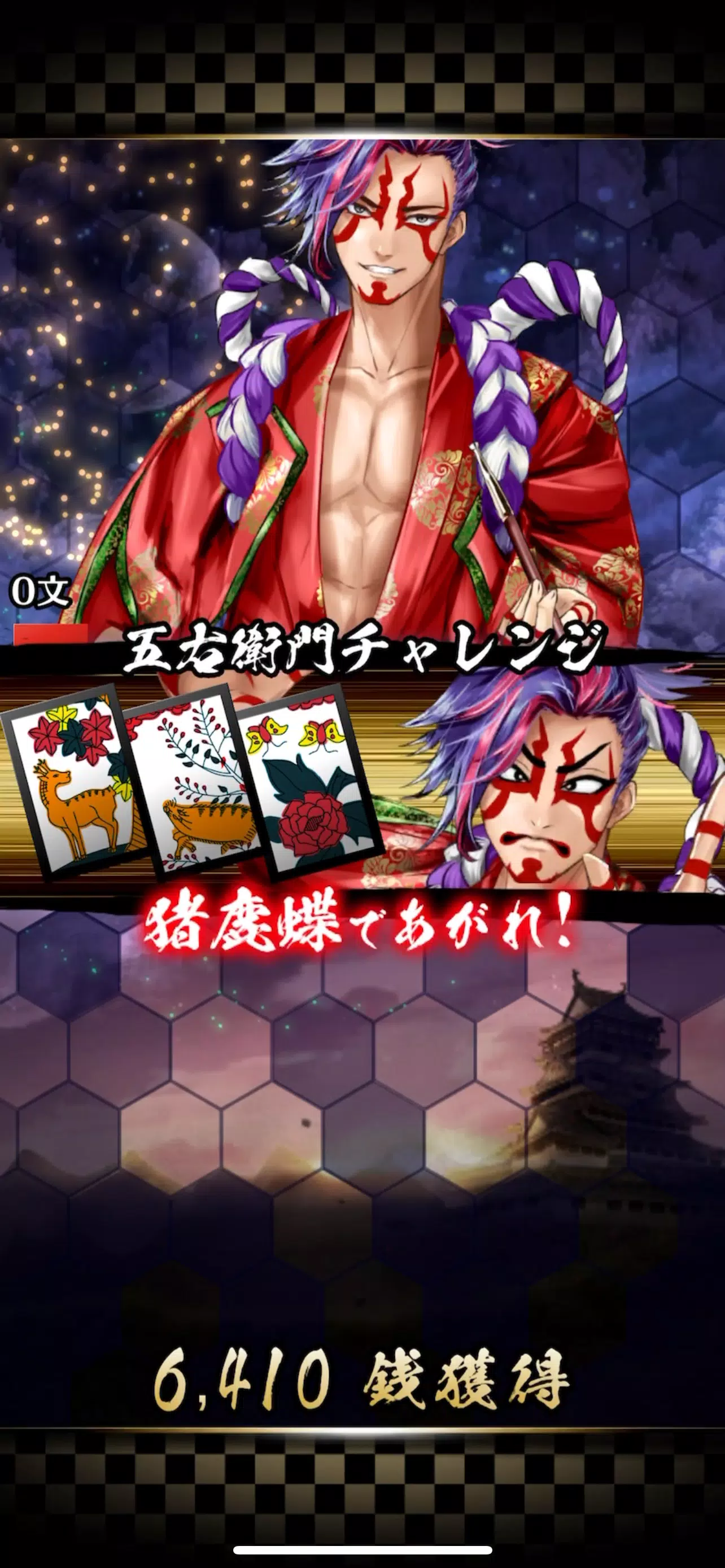 在这个挑战游戏中,石川五右卫门挑战你扮演指定角色,例如“Inoshikacho de agare”或“Sankou agare”,如果你成功了,你就可以从石川五右卫门那里偷钱。对于花札爱好者来说是不可抗拒的!还建议花札的初学者练习记忆角色。