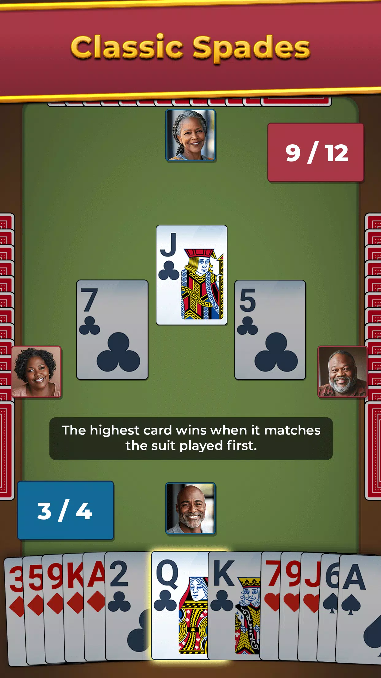 在体验黑桃的刺激的同时,感受红心大战、尤克牌和卡纳斯塔等经典卡牌游戏的魅力。黑桃经典版中的每场游戏都是一段独特的旅程,带来数小时的沉浸式游戏体验,让卡牌游戏的精神永葆活力。