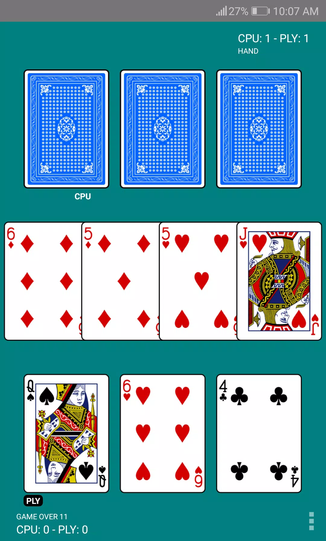 – 一场比赛包含多手牌。每手牌中,每位玩家会得到三张牌,牌桌上会发四张牌。