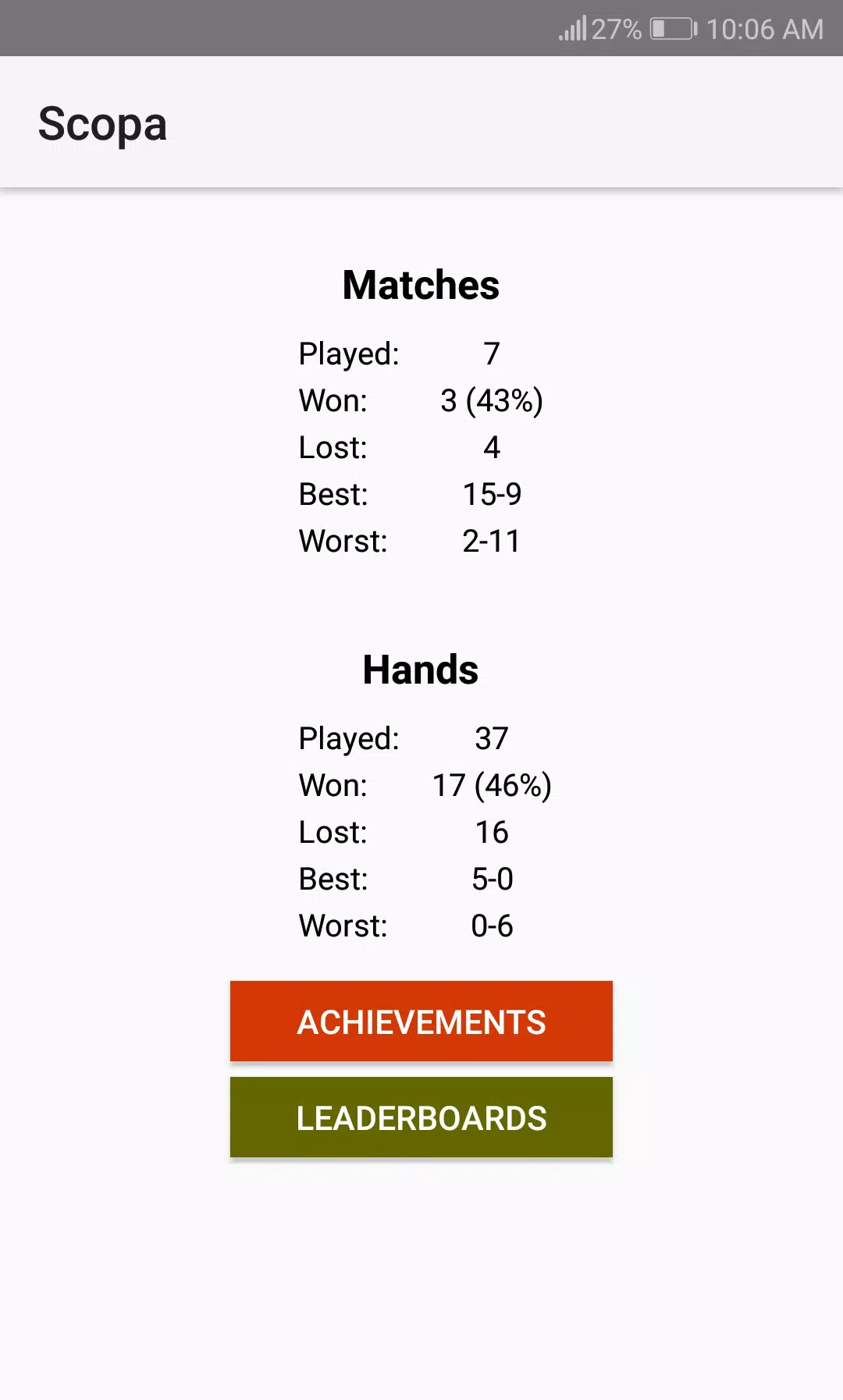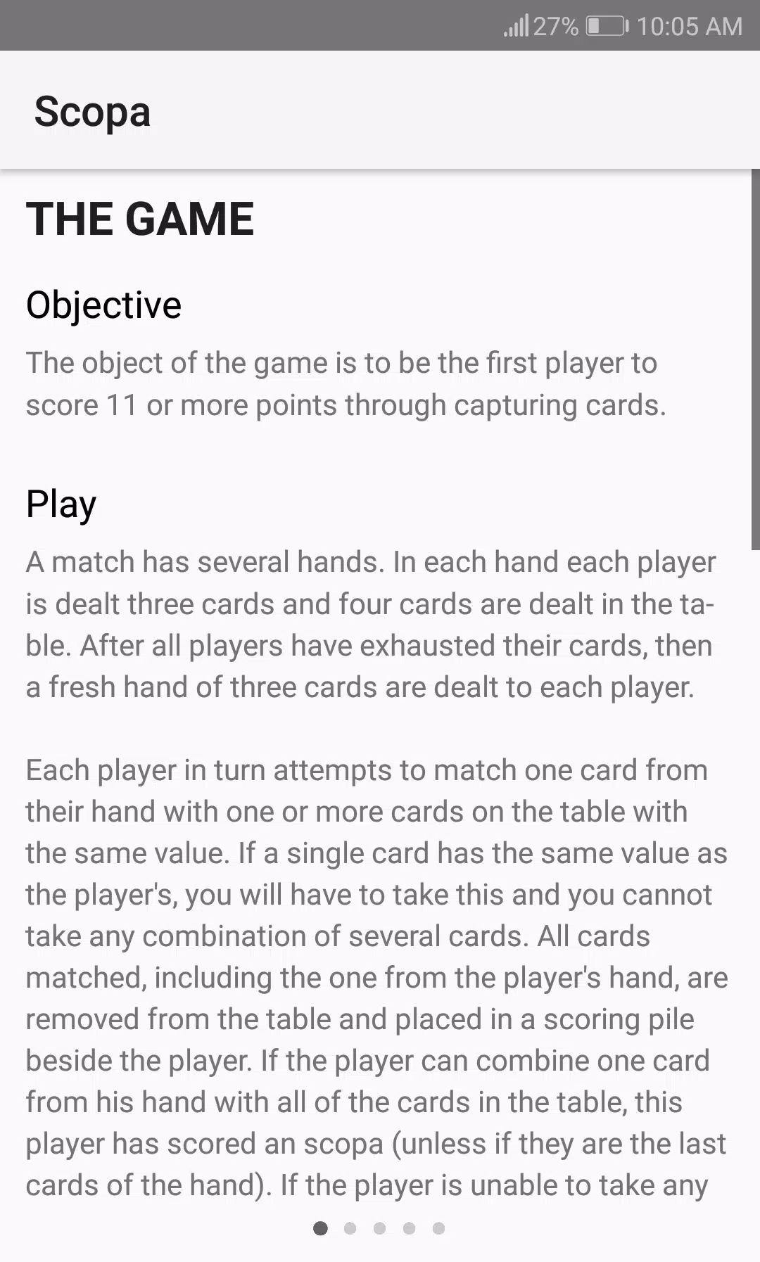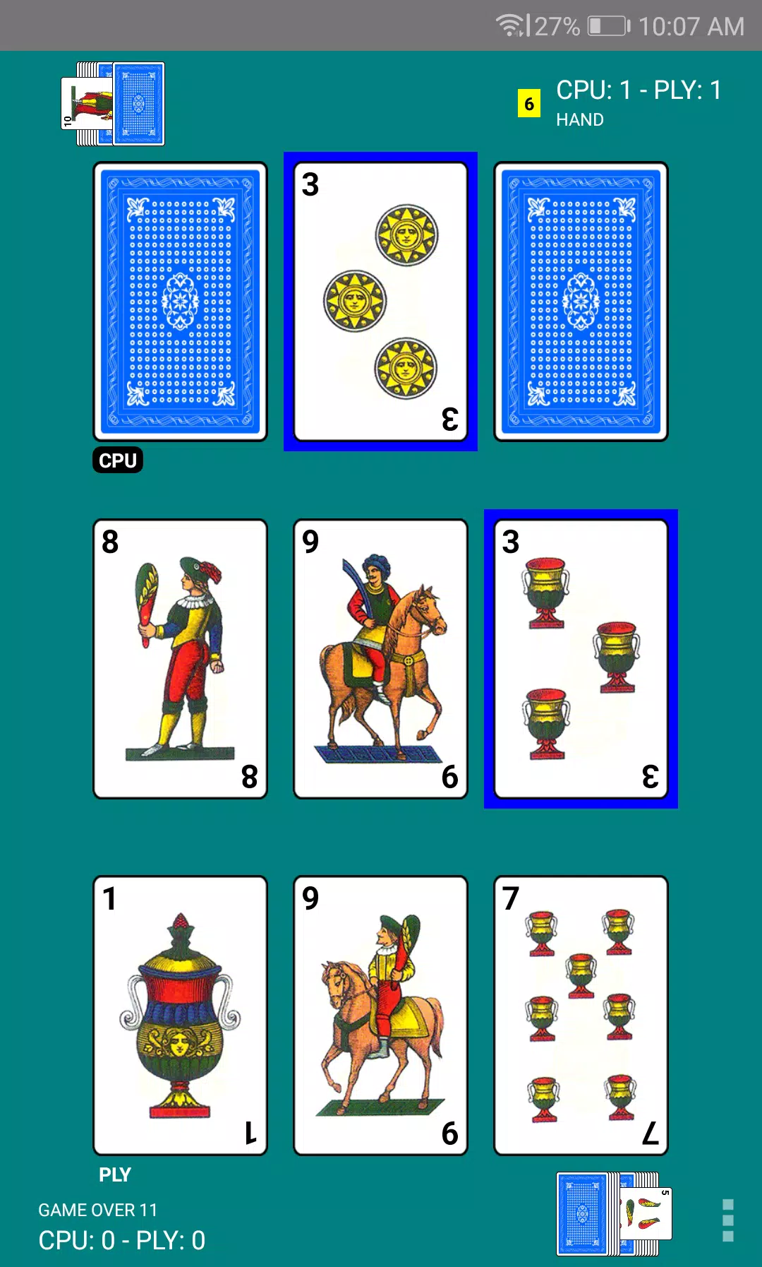 – 每张 Scopa、最多牌、最多硬币或方块、最佳 Primeira 以及拥有 7 个硬币或方块的玩家各得一分