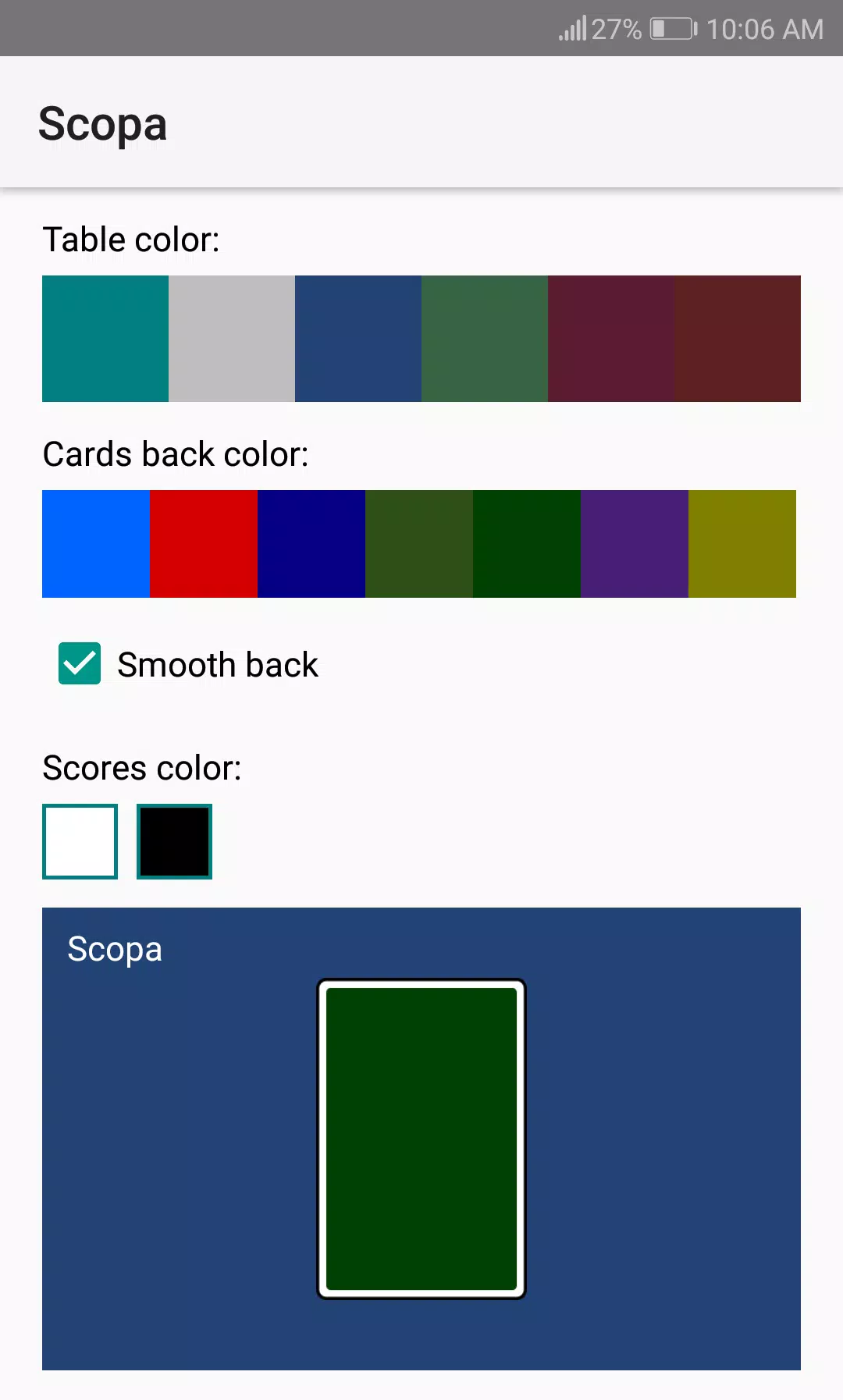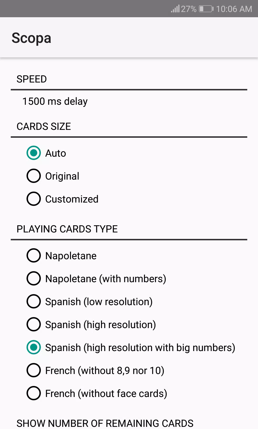 – 设置:扑克牌类型(拿破仑、西班牙或法国)、牌型、牌面颜色、音效、记分牌、牌桌颜色、牌张大小、动画……
