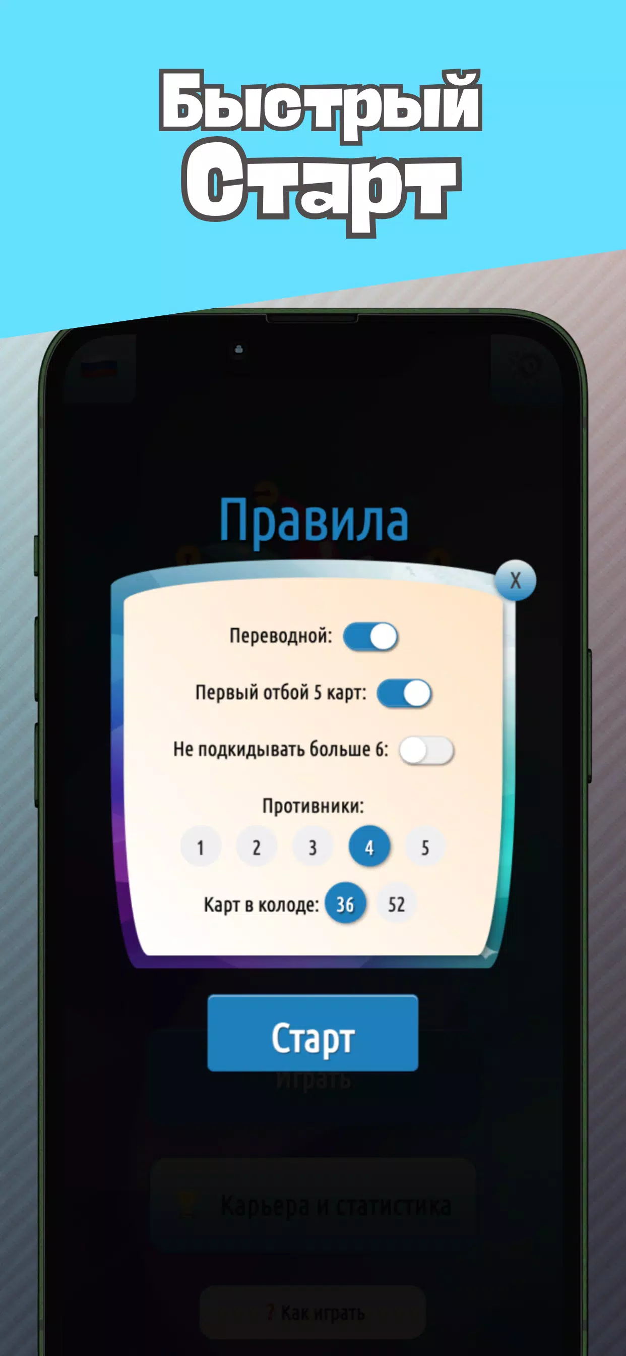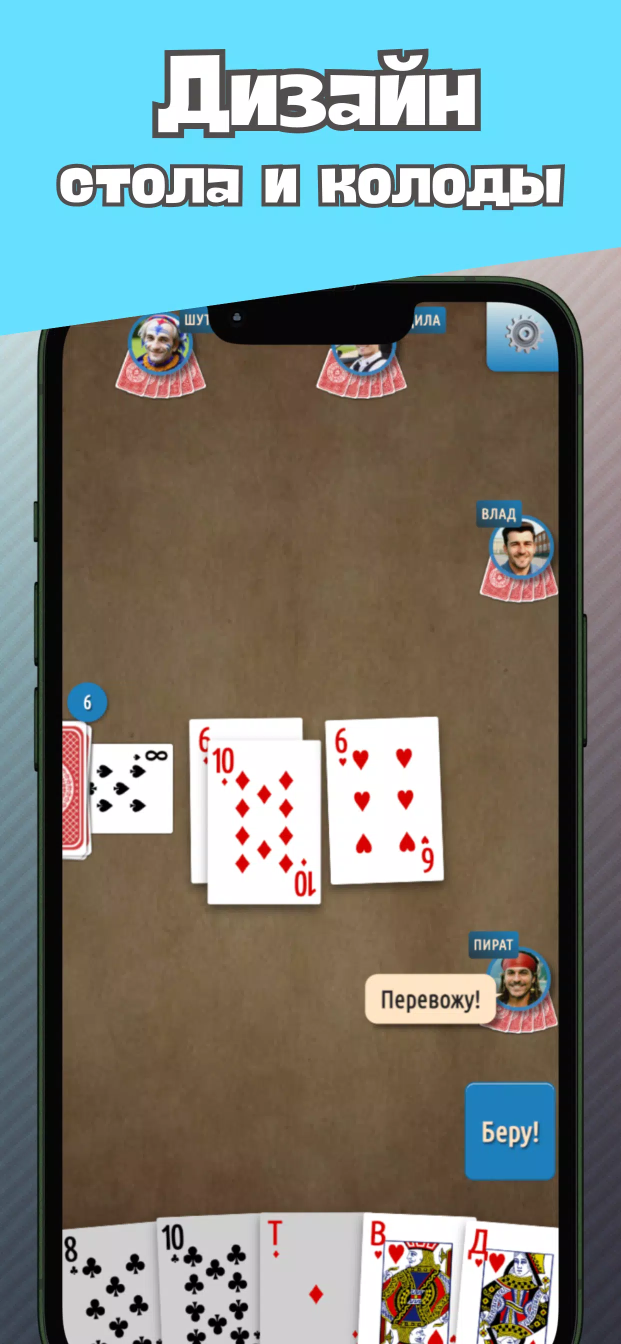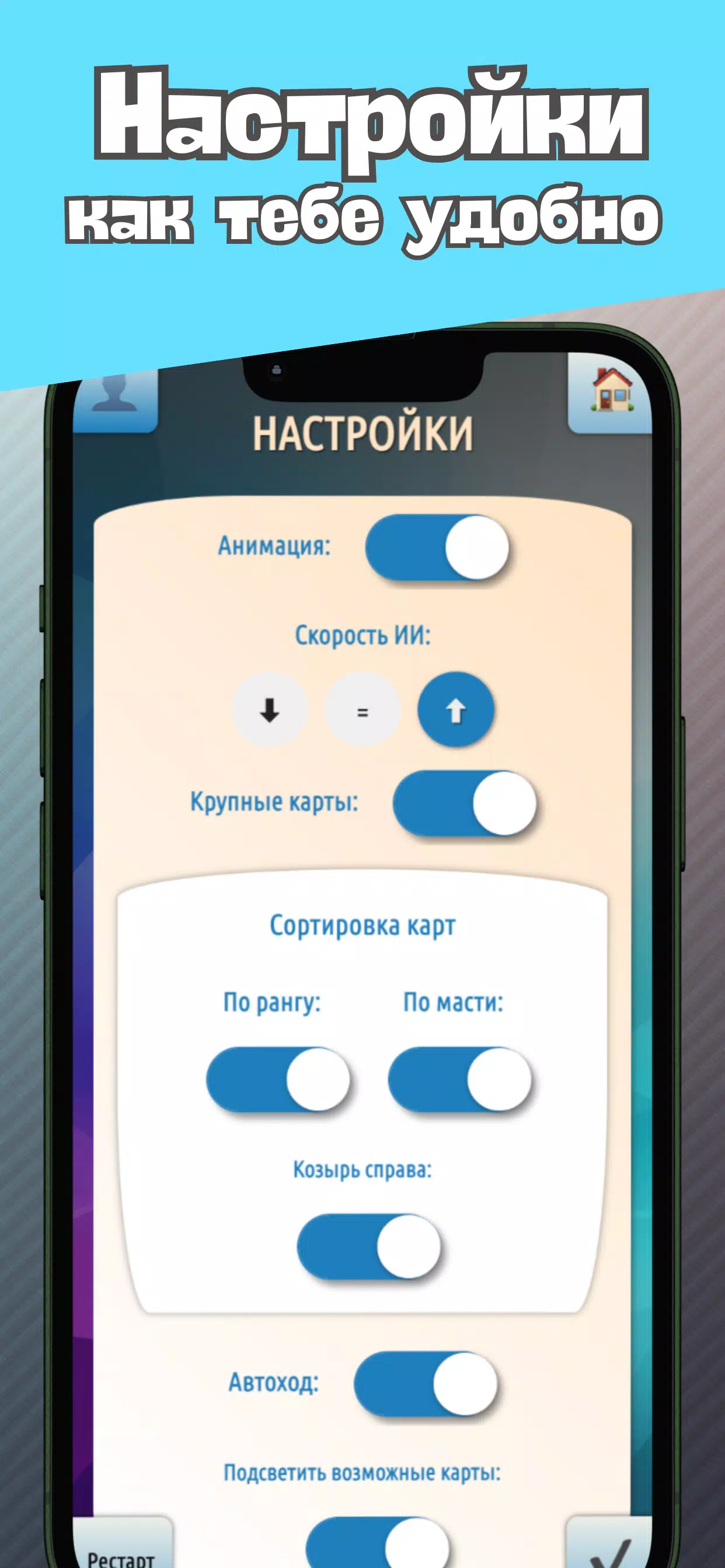 大尺寸的卡牌在任何屏幕上都清晰可见。儿童和成人都能轻松畅玩。操作简单:选择一张牌,然后出牌。安卓版 Durak 无需复杂的菜单操作。