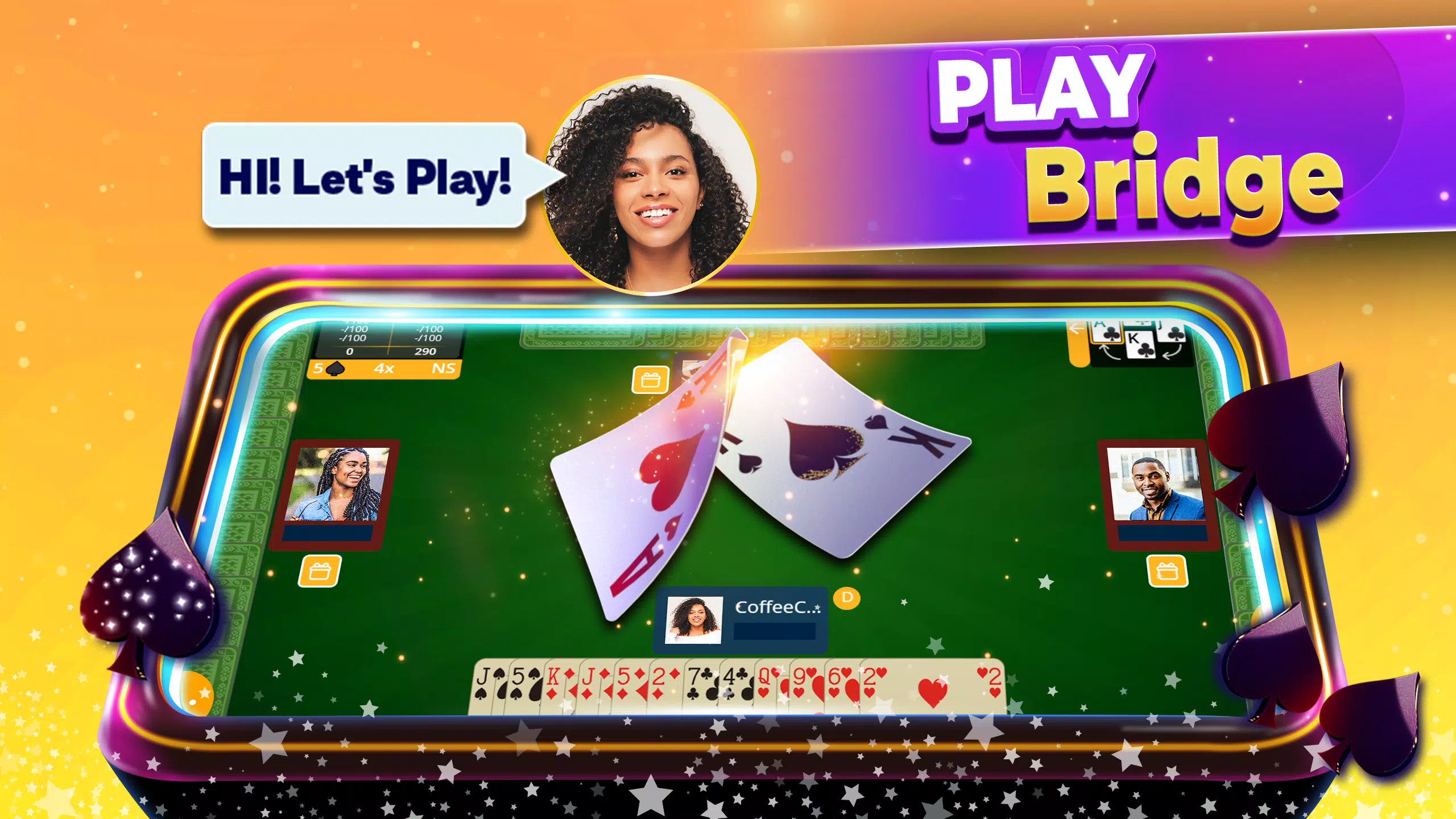 这款免费的社交扑克游戏使用一副标准的 52 张扑克牌,由两队各两名玩家进行对战。黑桃始终是王牌花色,且只有在玩家没有首牌花色的牌时才能出黑桃。所有玩家都会叫牌预测自己能赢多少墩。如果队伍赢得的墩数至少达到其最初叫牌的墩数,即可得分。