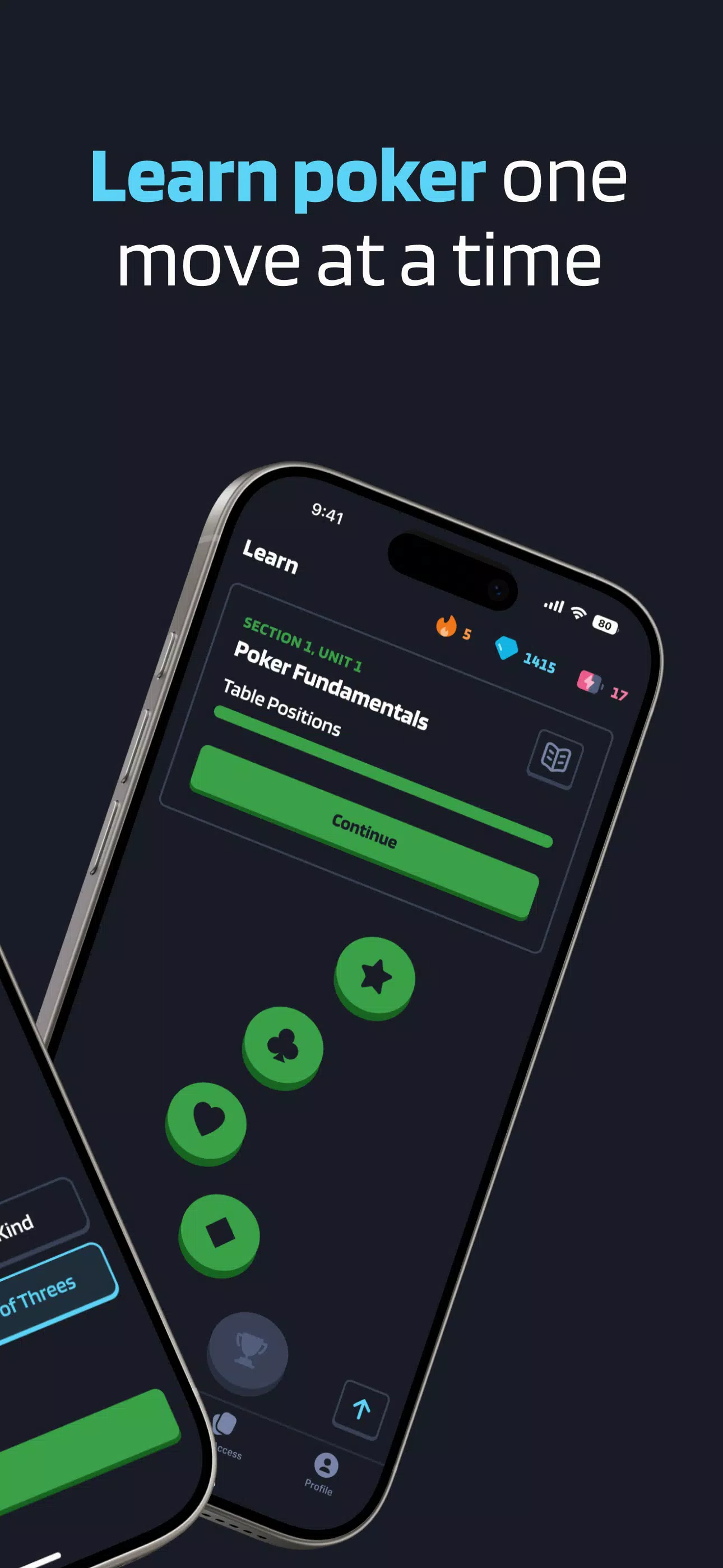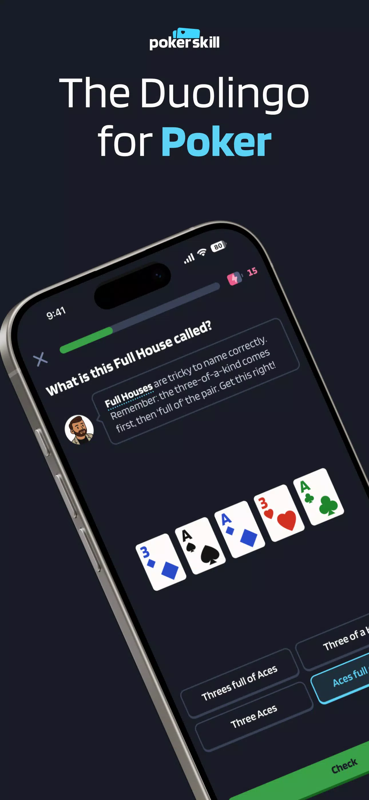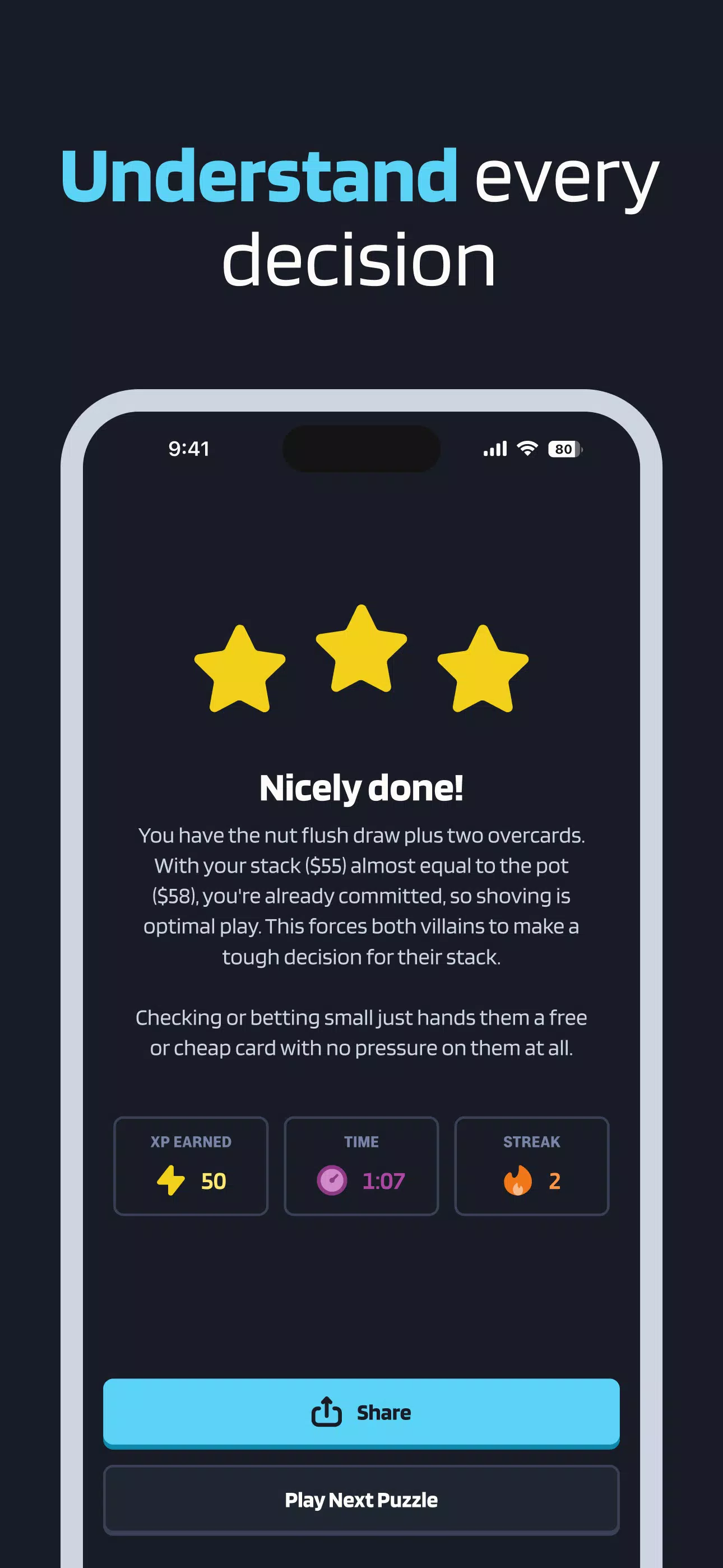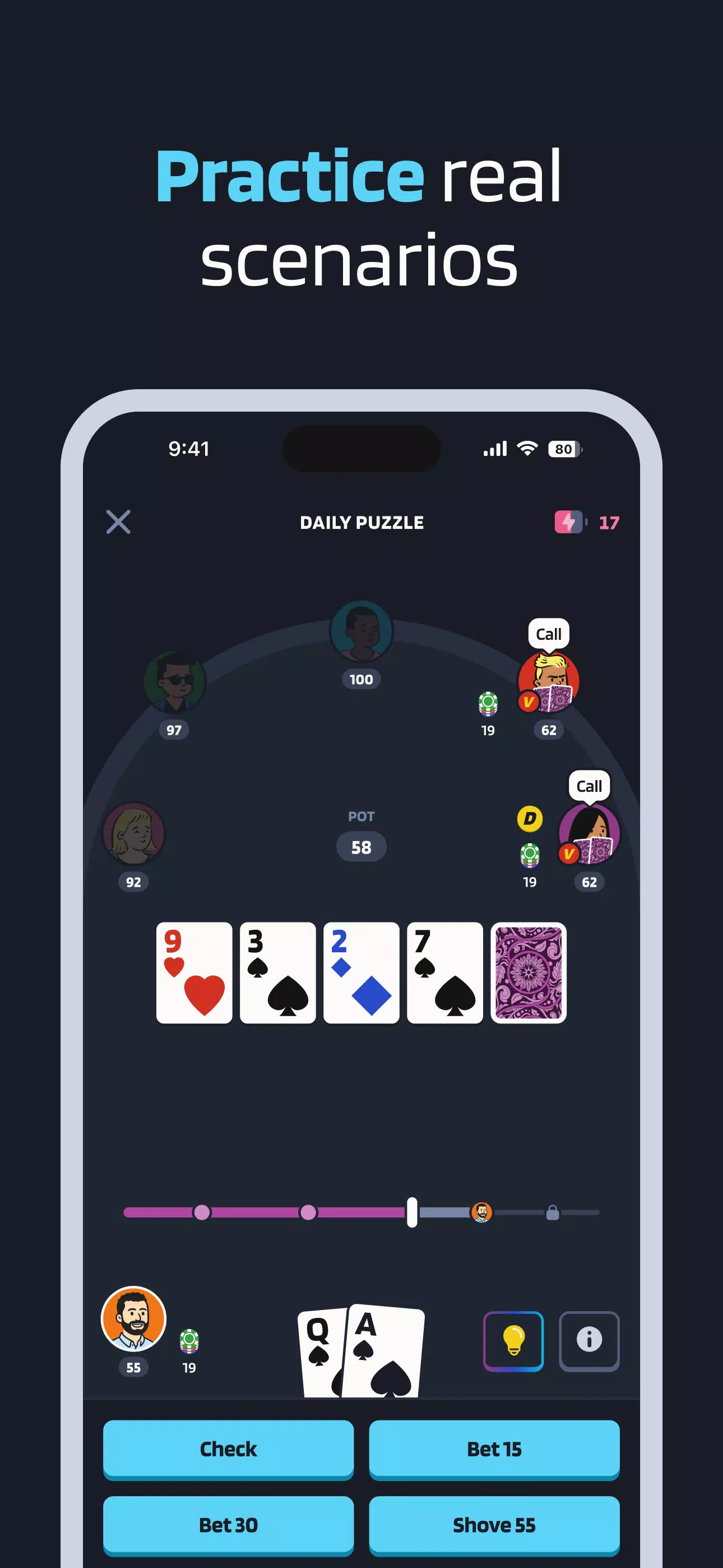 – 通过扑克练习和决策谜题来模拟真实牌局