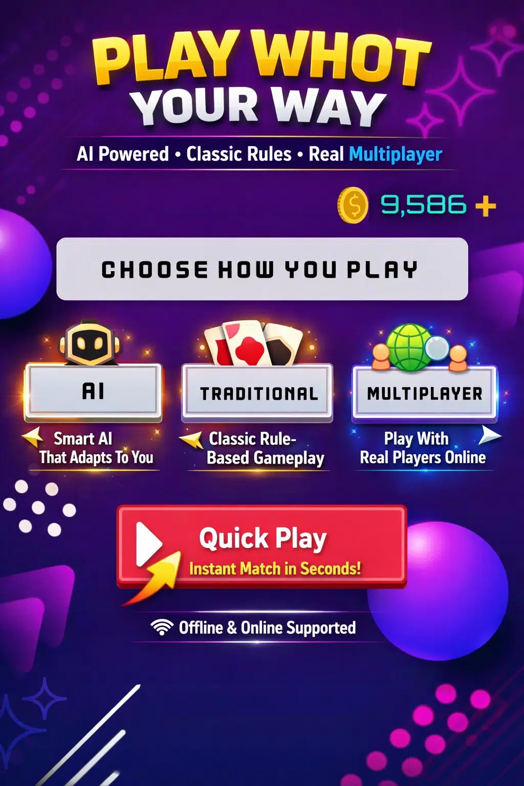 没有网络?没问题——随时随地离线畅玩,与AI对战,与传统的经典规则引擎(经典电脑对手)对战,或在多人模式下与好友切磋牌技。