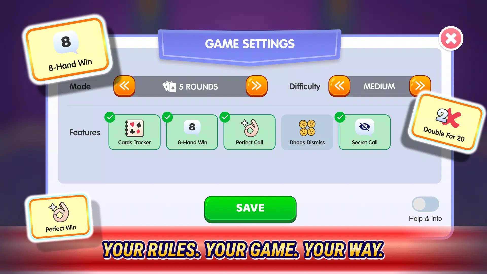 – 选择 5 轮或 10 轮游戏,或者竞相获得 20 分或 30 分,打造专属体验。