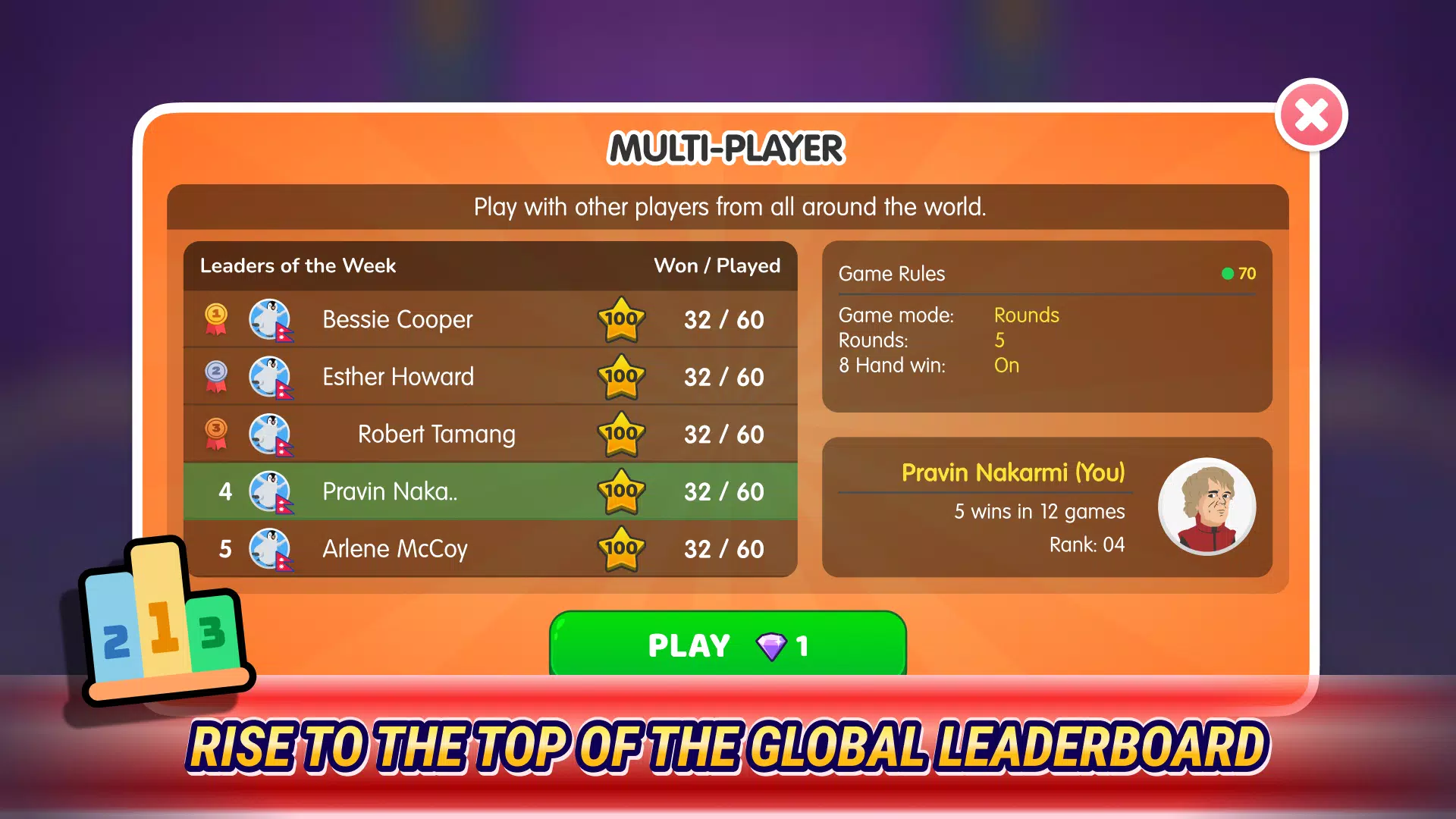 这款游戏的前身是 Call Break Premier League (CPL),如今它更加精彩纷呈!无论您是想在线挑战其他玩家,还是想在没有 WiFi 的情况下畅玩,Bhoos 出品的 Callbreak 都能满足您的需求。