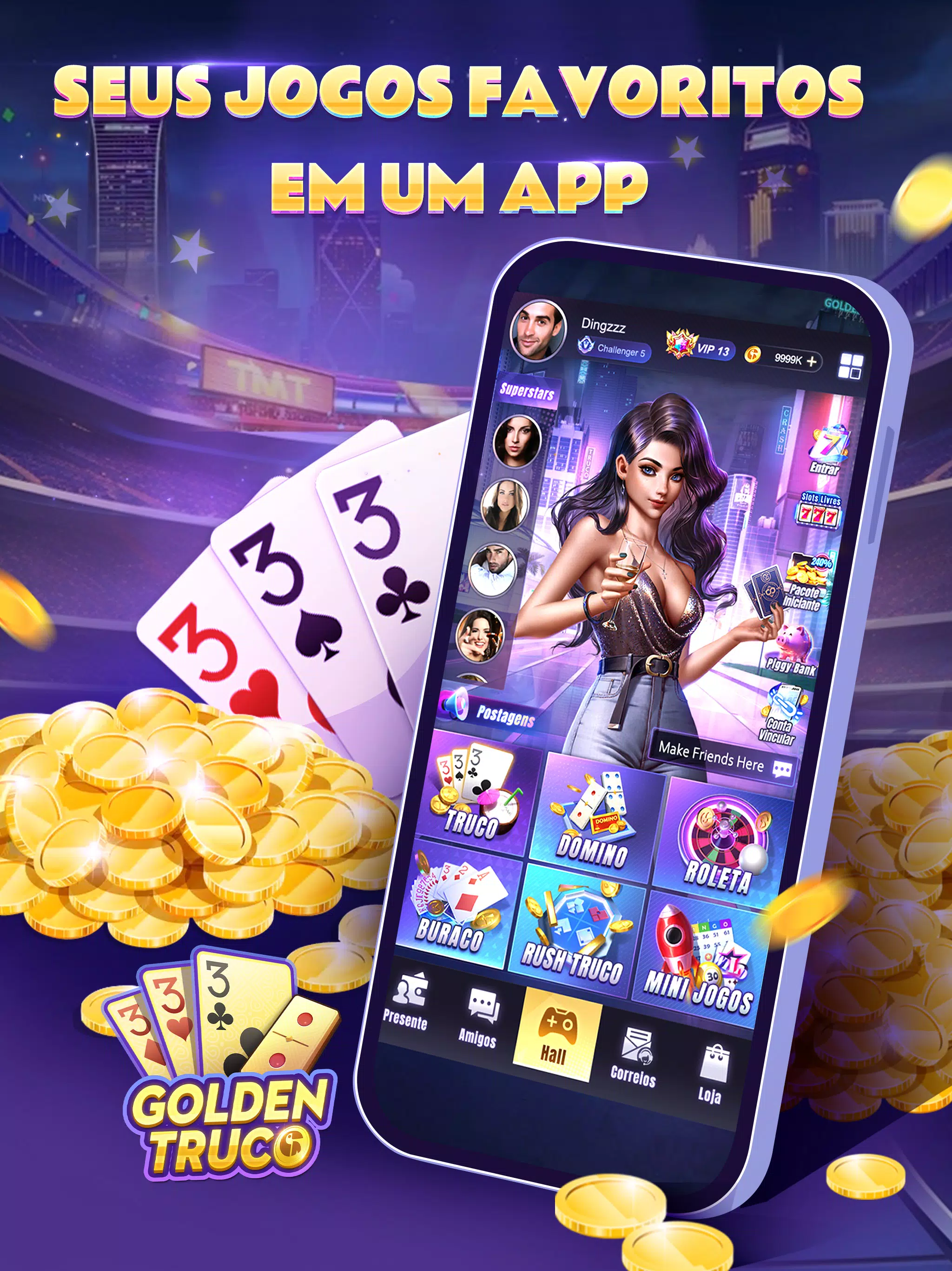 “Golden Games é completamente gratuito para jogar com seus amigos, e você também pode participar de emocionantes torneios online e completar com milhões de mestres de todo o país. Além dos clássicos jogos locais Truco, você também pode jogar jogos famosos como Domino, Poker, Crash aqui. Você pode desafiar com milhões de jogadores, e também convidar sua família e amigos para jogar este famoso jogo de cartas brasileiro em qualquer lugar a qualquer hora! Tem uma experiência de jogo emocionante e emocionante com aparência e efeitos atraentes.