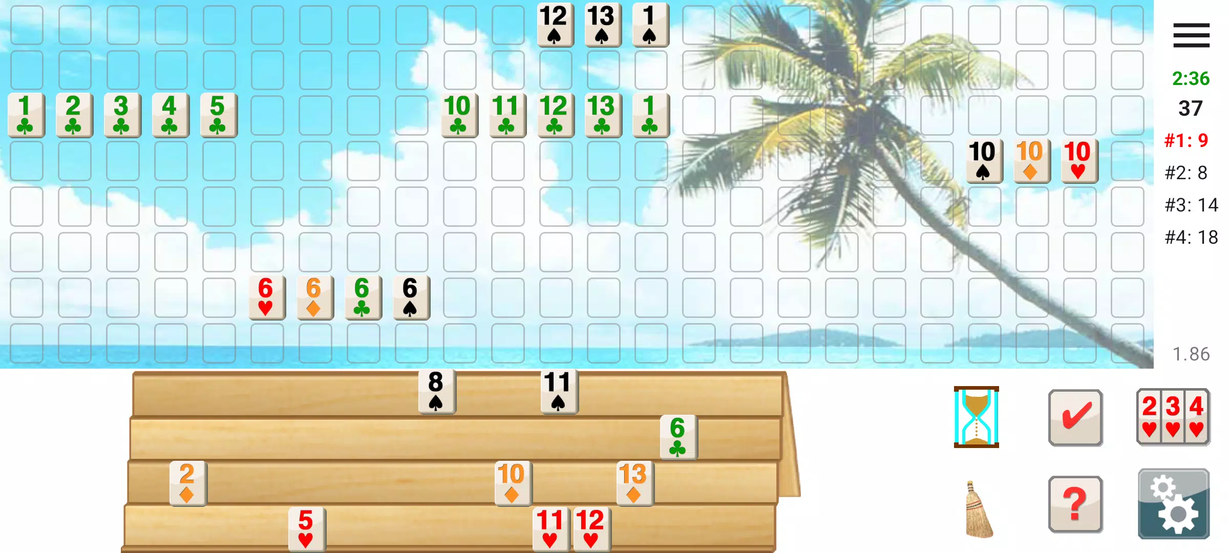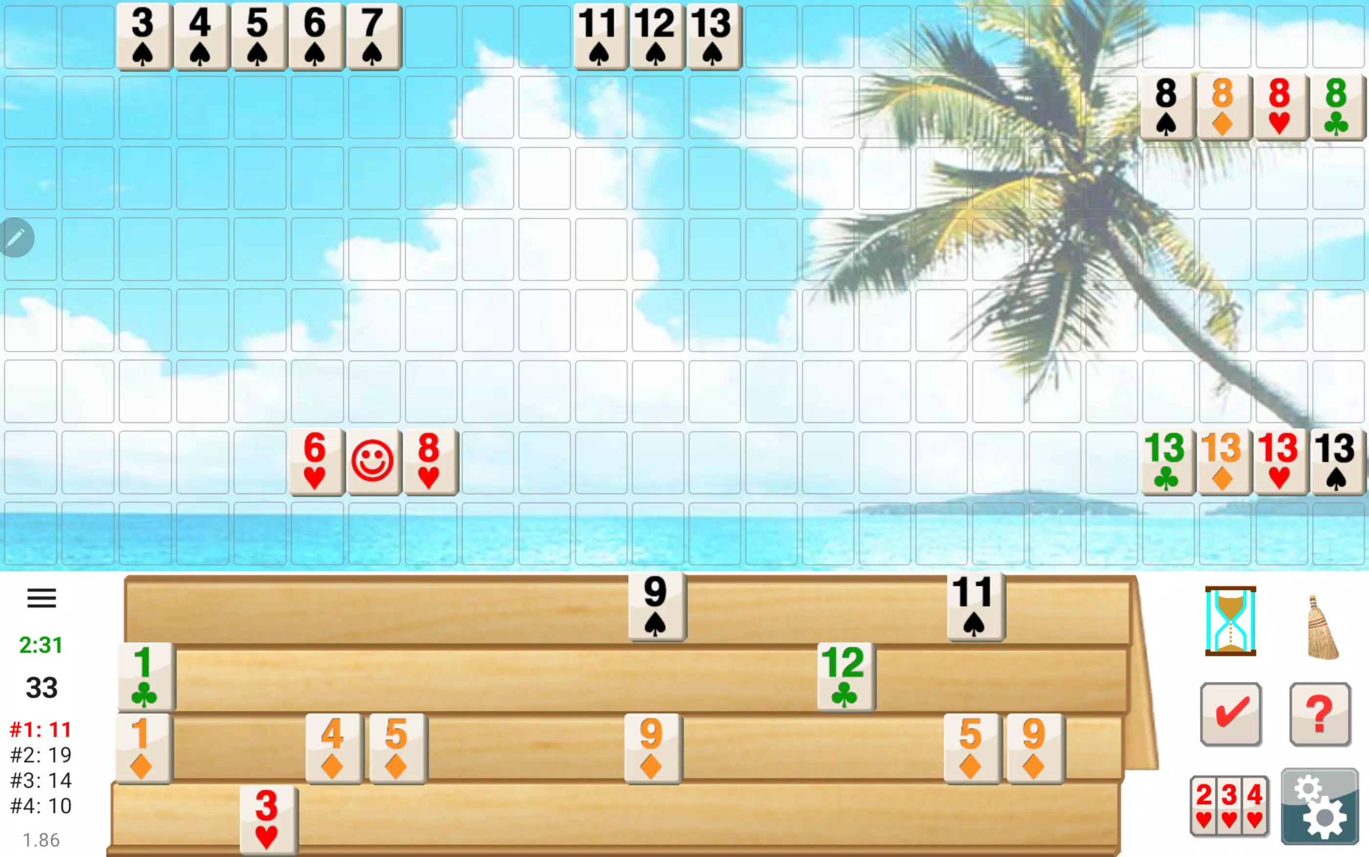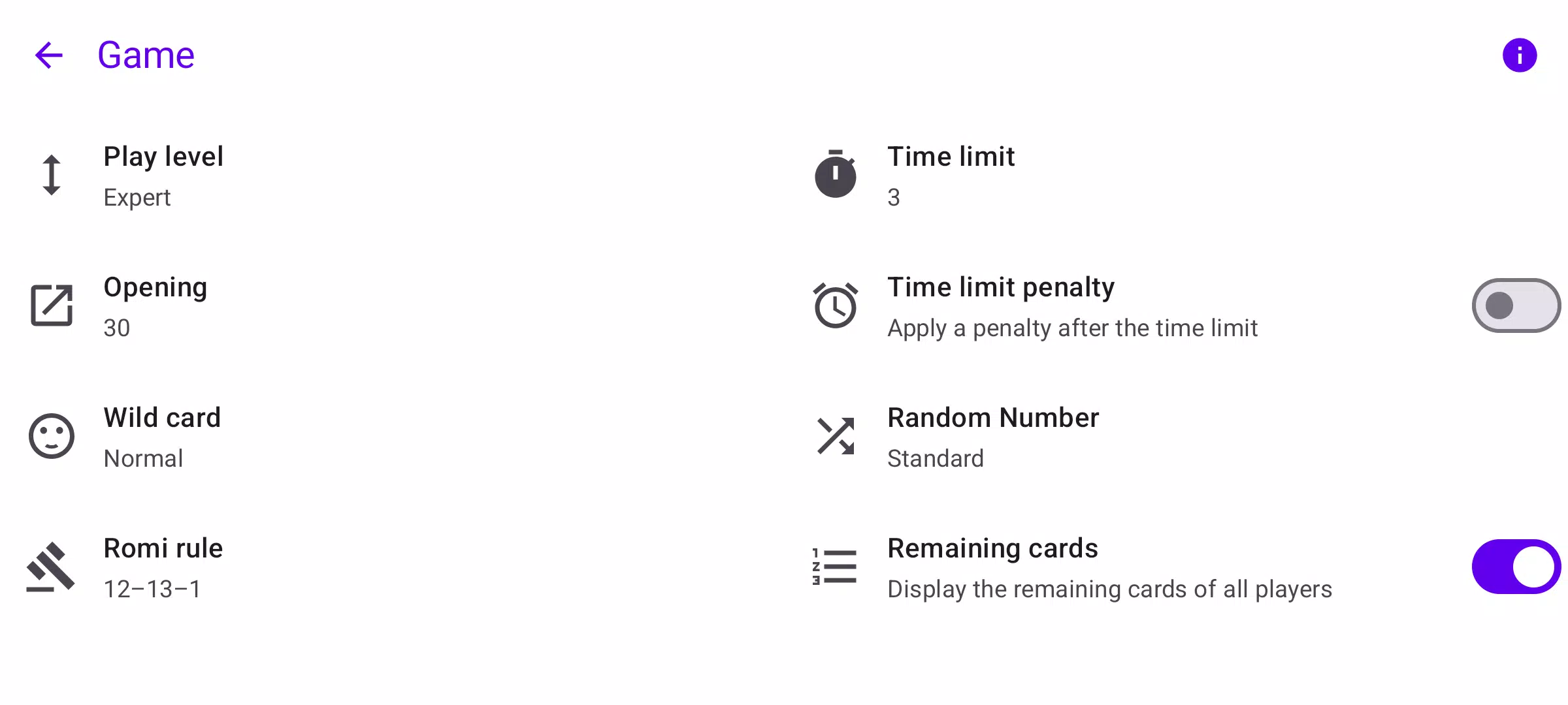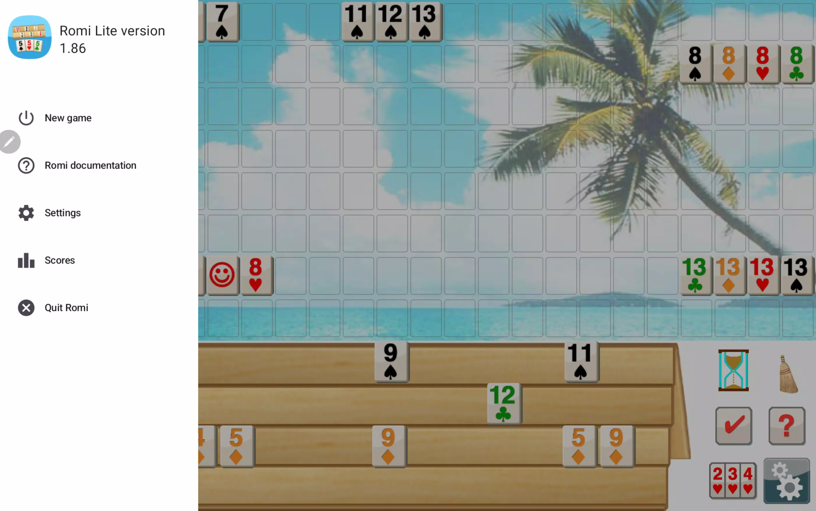 Romi 让您可以与电脑进行拉米牌(Rummy Tile,也称 RummyCube、Rummikub、Rami)游戏,共有三个不同难度级别。Romi 使用两组 52 张牌和两张万能牌进行游戏。游戏的目标是组成三张或更多张牌的组合,这些组合可以是同花色的连续牌,也可以是点数相同但花色不同的牌。